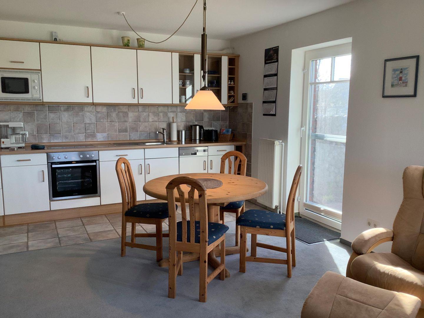 Die offene Küchenzeile ist vollausgestattet mit Backofen und Ceranfeld, Mikrowelle, Geschirrspüler und vielen Elektrokleingeräten. Im Schlafzimmer ist neben dem großen Doppelbett eine gemütliche Leseecke. Angrenzend befindet sich ein modernes Duschbad mit Fußbodenheizung.