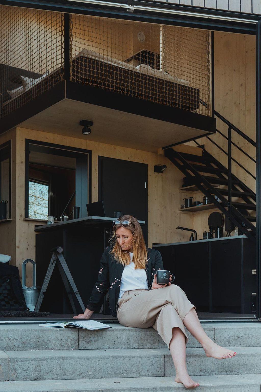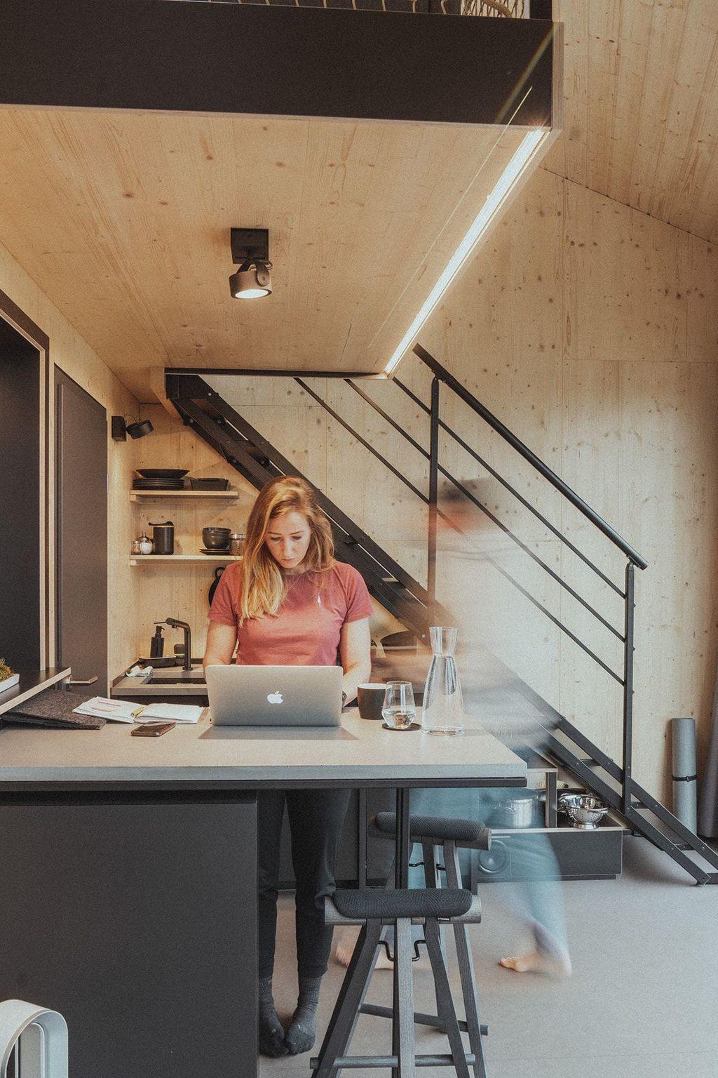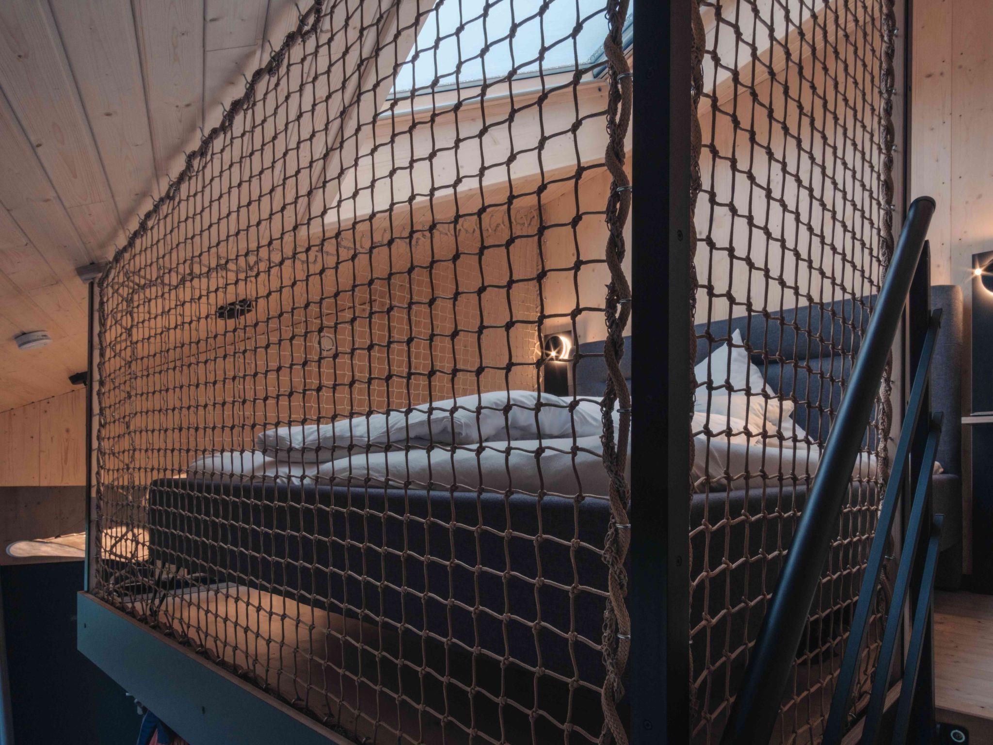 The double bed is located on a sleeping loft. There is a large skylight directly above the bed so that you can marvel at the starry sky at night.