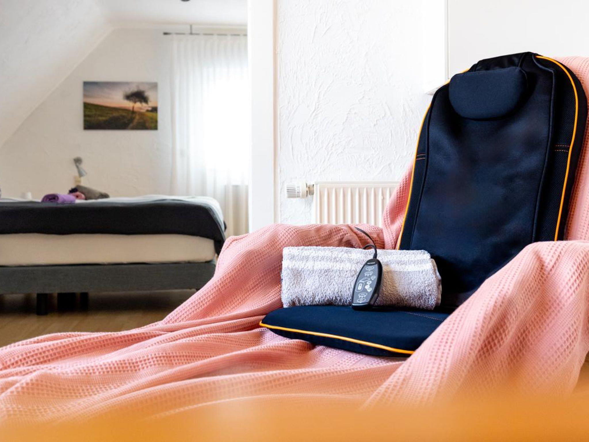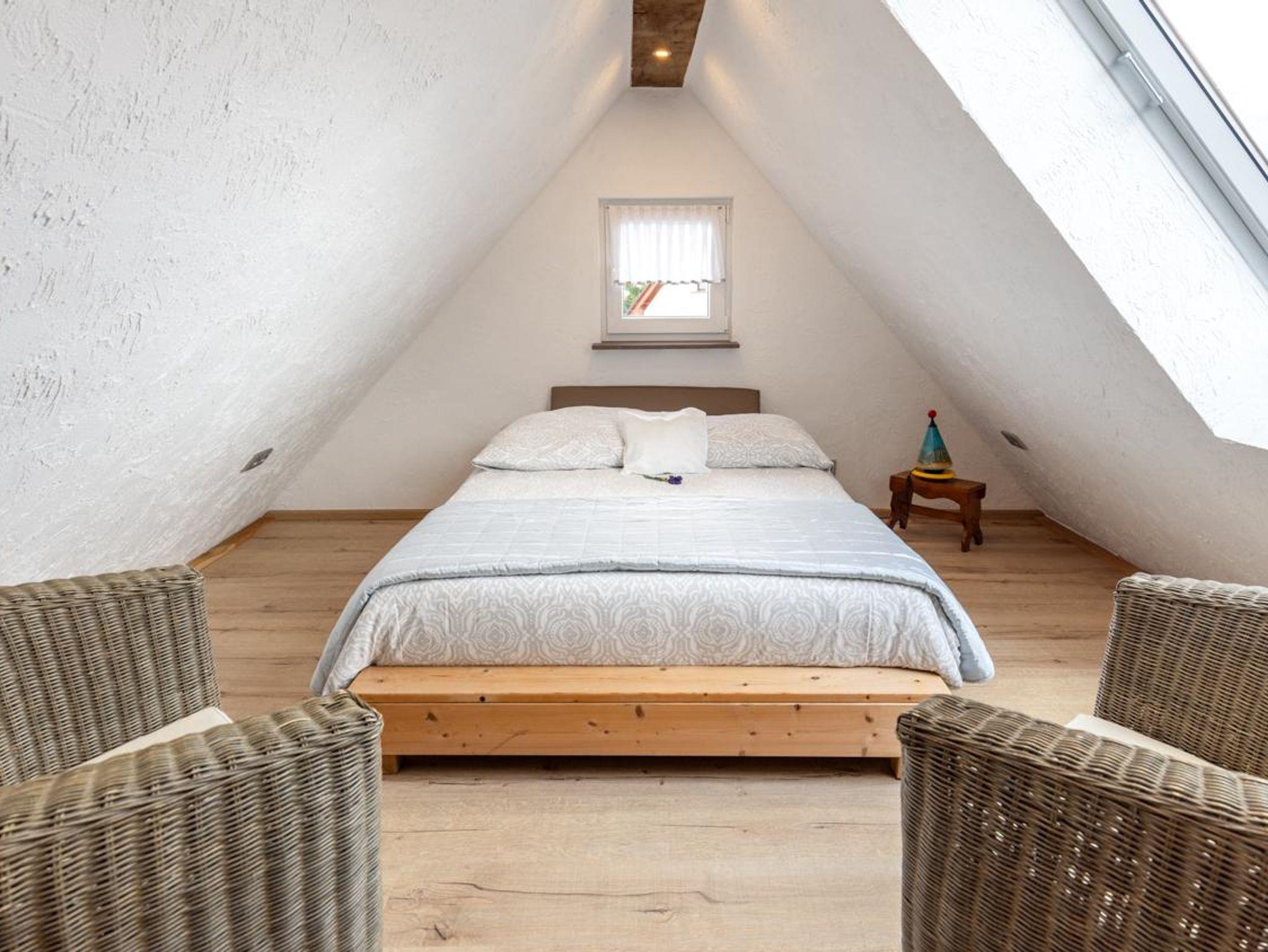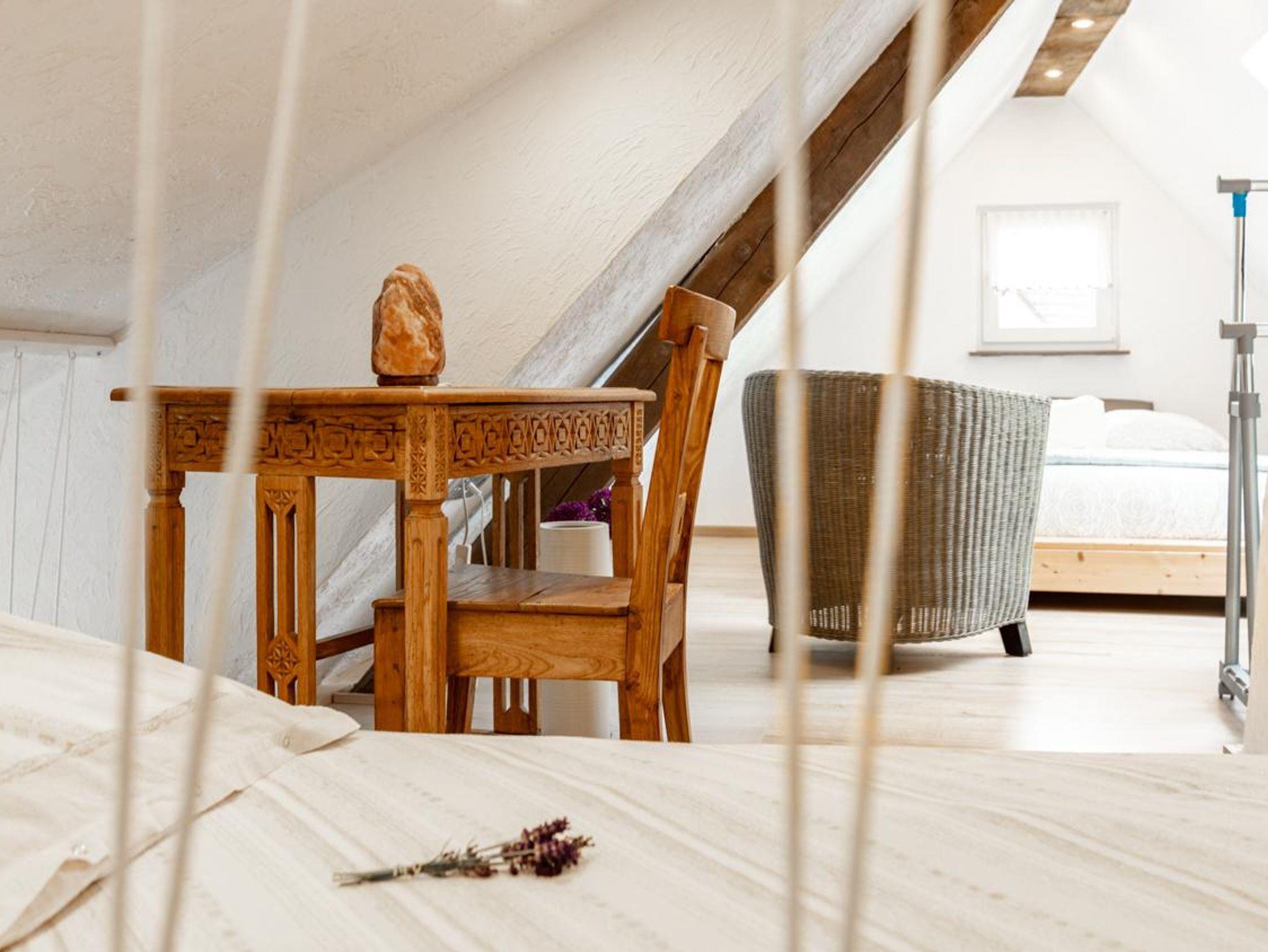 Unsere Ferienwohnung bietet Schlafmöglichkeiten für bis zu 5 Personen. Wir bieten ein separates Schlafzimmer mit Boxspringbett im 1. OG und ein über das Treppenhaus zugänglichen, offenen Spitzboden mit Schlafmöglichkeiten (Doppelbett und Einzelbett). Auf Wunsch kann auch ein Kinderbett bereitgestellt werden.