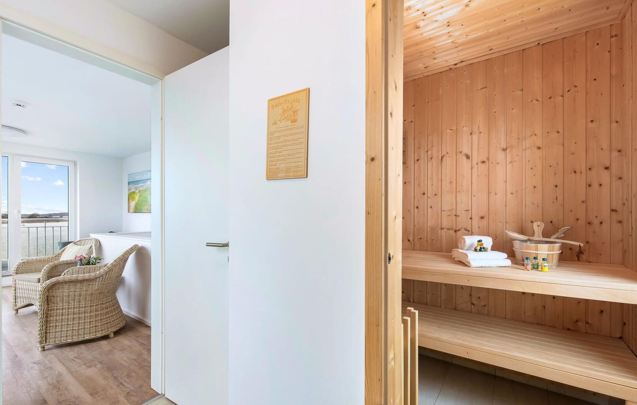 I første etasje har feriehuset Schleijuwel et ekstra oppholdsrom og en stor, tilstøtende takterrasse. En stor finsk badstue med tilstøtende dusj gjør ferieopplevelsen komplett. Her oppefra er den uhindret utsikten over Schlei og seil- og sportsbåthavnen i Østersjø-feriestedet så vakker at du ikke bare vil sole deg her, men også se på stjernene om kvelden etter en romantisk solnedgang. En ekstra soveplass er tilgjengelig på dette nivået på den komfortable sovesofaen.