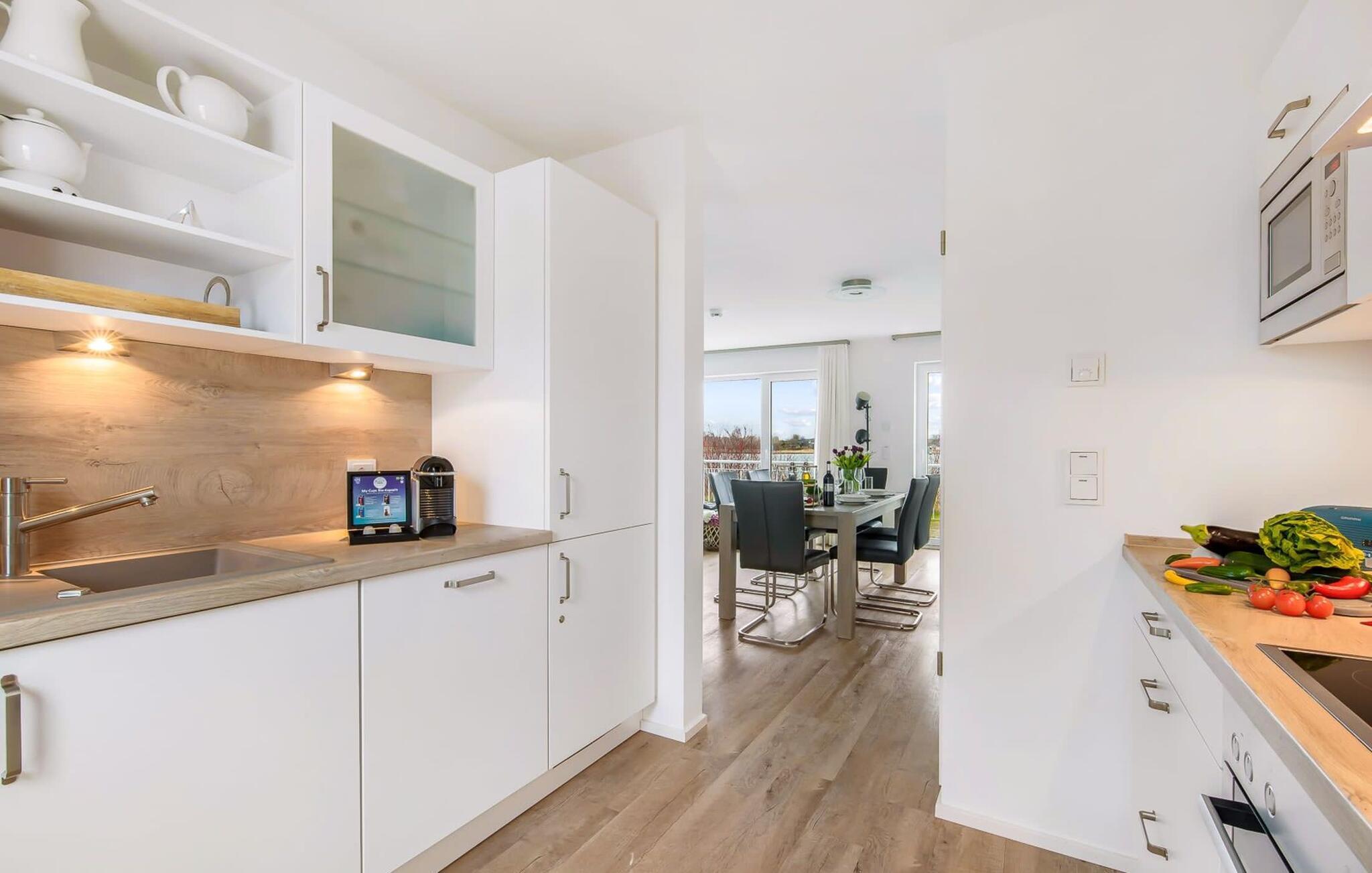 Feriehuset Schleijuwel strekker seg over tre plan. Stue-/spisestuen i første etasje av feriehuset er gjennomstrømmet av lys. Et stort vindu foran gir utsikt over den tilstøtende terrassen til de idylliske breddene av Schlei. Det som skjer utenfor døren er et sant naturskue: Østersjøbrisen vugger sivet i fjæra frem og tilbake, mens ender og svaner starter dagen muntert. Over en kaffe på terrassen kan du se seilskipene som passerer forbi, og nyte det perfekte panoramaet. Takket være den sørvestlige beliggenheten er du garantert rikelig med solskinn og fantastiske solnedganger. Enten du nyter en hyggelig grillfest eller slapper av med en bok, vil den fantastiske naturen rett foran huset få feriehjertet ditt til å banke raskere.