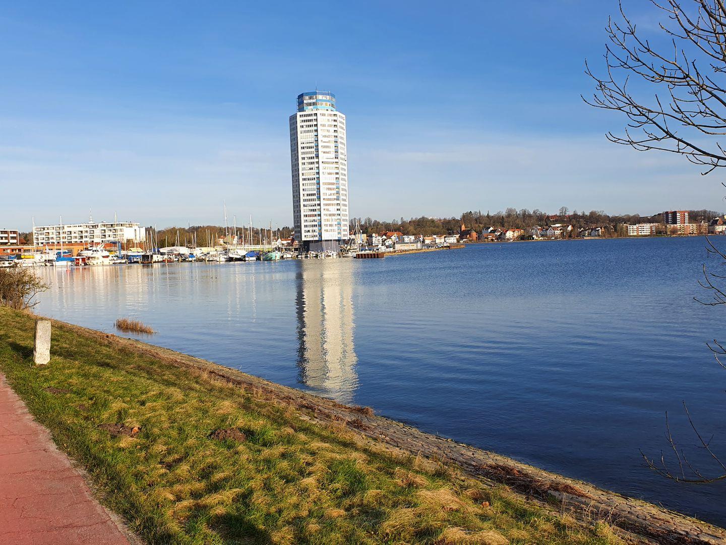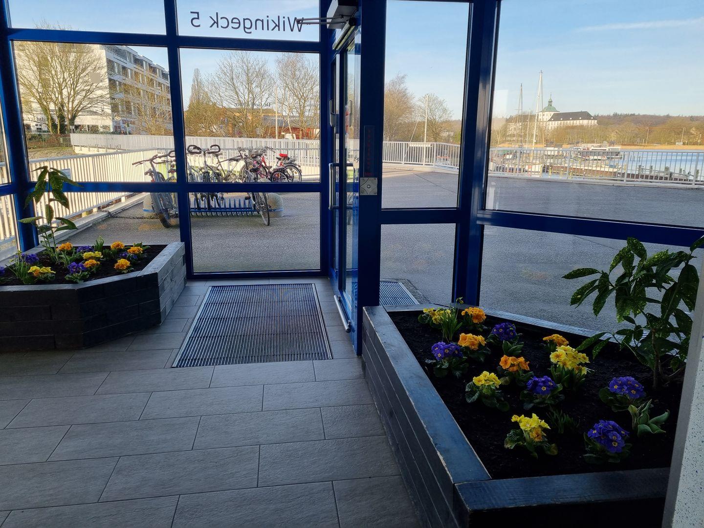 Die großräumige Zwei-Zimmer-Wohnung liegt im ersten Stock des schleswiger Wahrzeichen des Wikingturms und ist sowohl über einen Aufzug, als auch über eine Treppe zu erreichen. Ein kleiner Flur bietet die Möglichkeit seine Garderobe und Schuhe abzulegen.