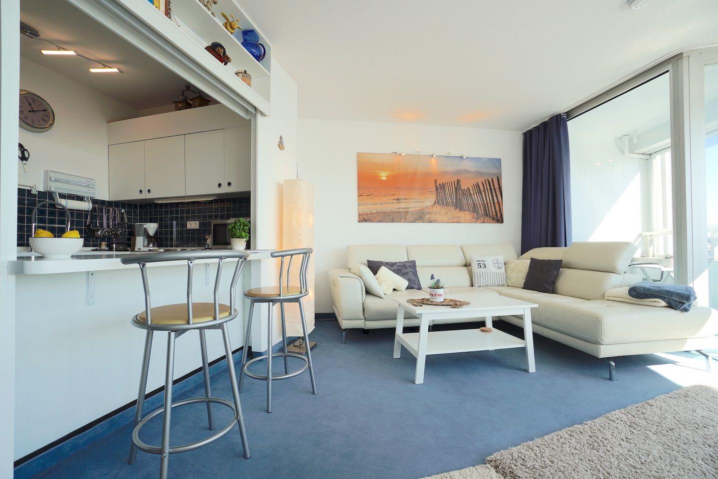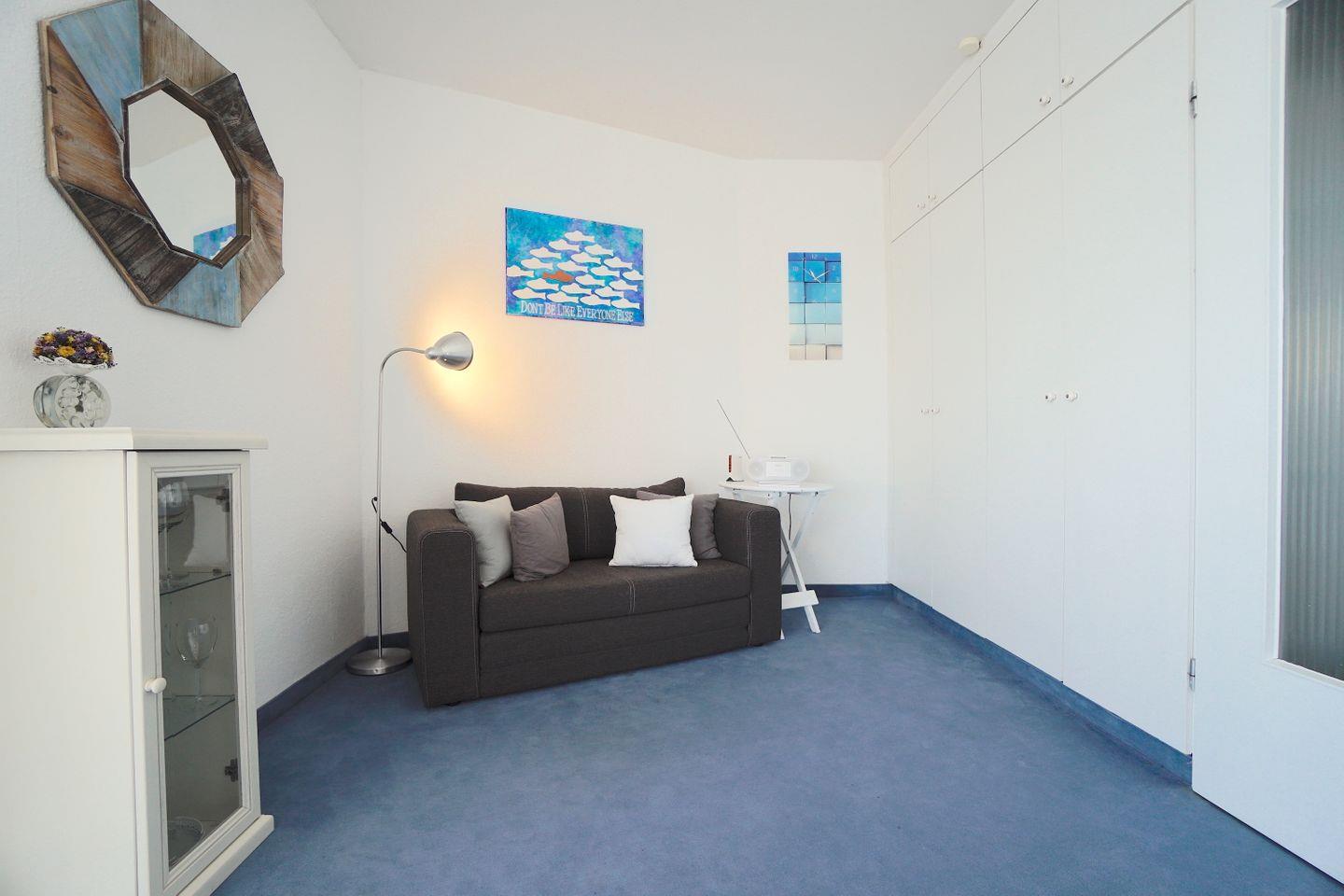 Weitere Erholung bieten die beiden Sofaecken der Wohnung, zurückgezogen im hintern Teil der Wohnung, oder im Herzen der Wohnung mit weit schweifendem Blick auf die Schlei. Wer ein alternativ Programm zum Blick auf die Ostsee sucht, findet dies auch im vorhandenen TV.