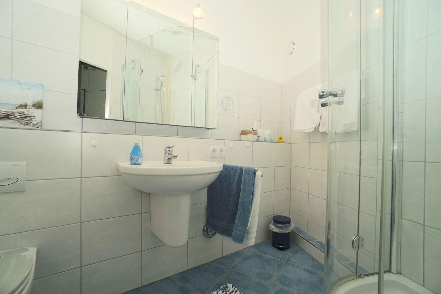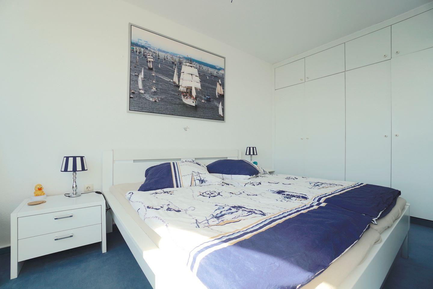 Auch mit einer Fensterfront versehen, ist das Schlafzimmer mit einem 180x200cm Doppelbett und diversen Staumöglichkeiten. Unter dem Kompass mit exakter Ausrichtung, schlafen nicht nur Seemänner besonders tief und erholsam. Und wer es mag, darf sich gerne am Morgen von der Sonne und dem Blick auf das Wasser und die Möwen wecken lassen.