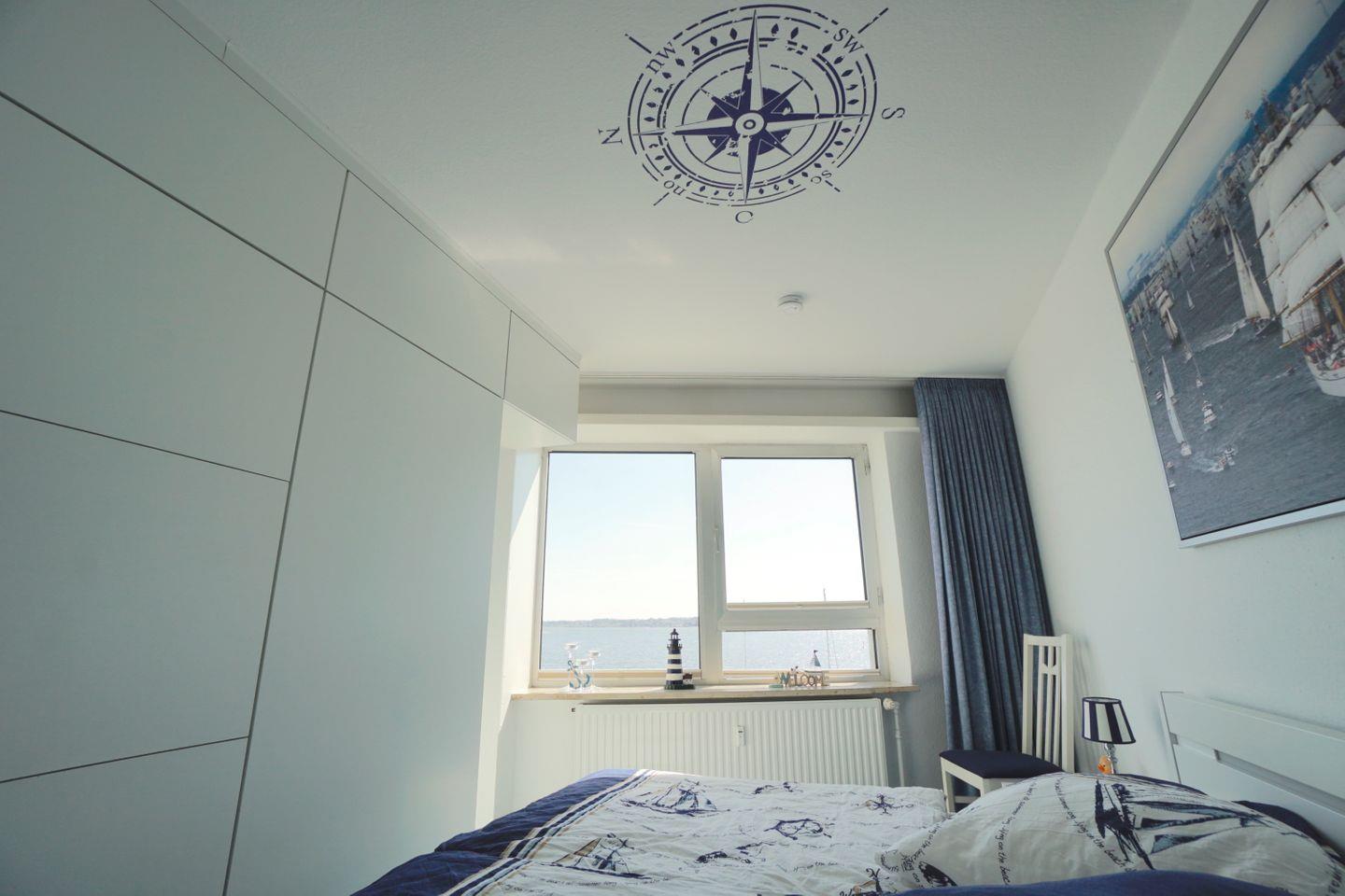 Auch das Schlafzimmer mit seinem großzügigen Doppelbett bietet einen freien Blick auf die Schlei.