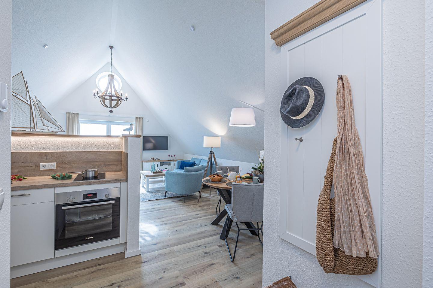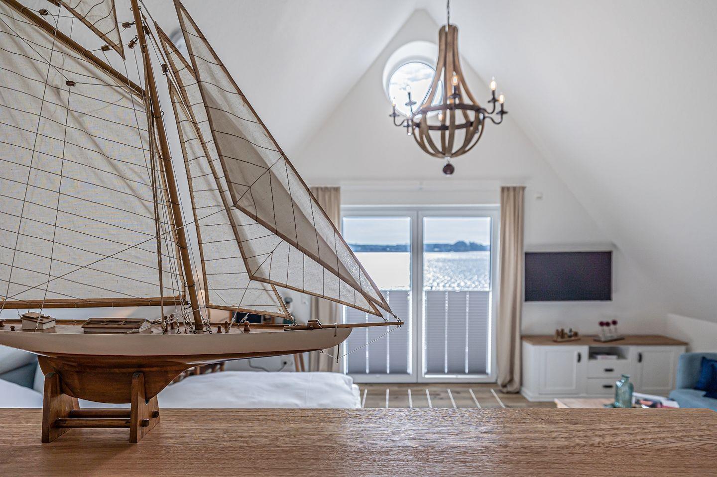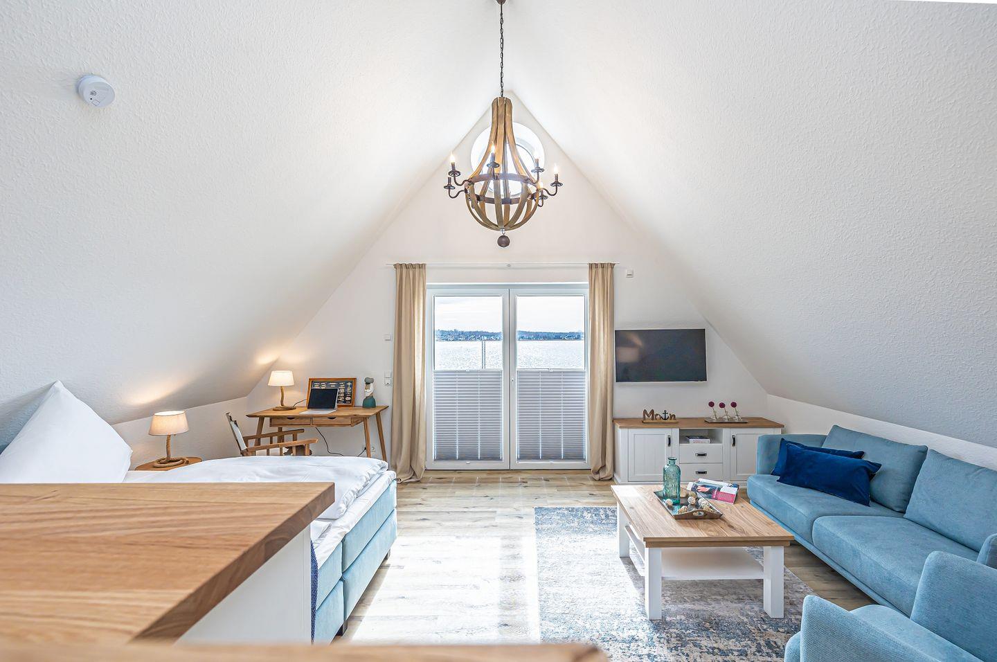 Mit direktem Wasserblick und in einzigartiger Lage direkt an der Schlei bietet Dir die „Schlei-Koje 7“ am Pionierhafen Schleswig den perfekten Ort für Deinen Urlaub. Die Ferienwohnung im Dachgeschoss bietet Dir auf ca. 40 m² einen offenen Wohn- und Essbereich mit Küche und angrenzendem offenen Schlafzimmer, ein Badezimmer und einen Balkon.