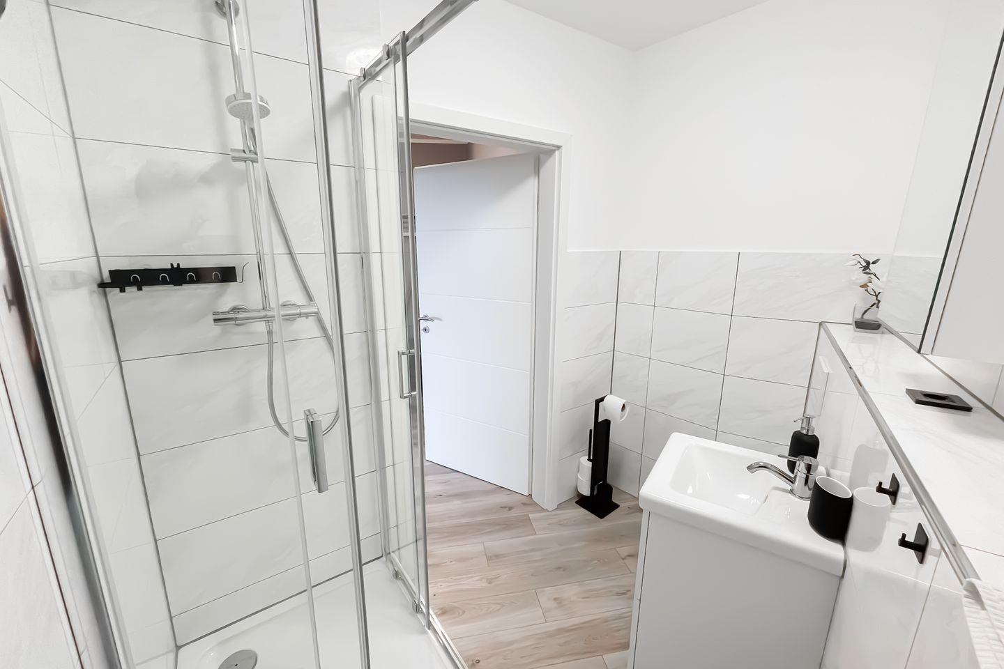Das Badezimmer ist mit einer Dusche, WC, Spiegel und Waschbecken ausgestattet. Zur Unterhaltung stehen Ihnen ein TV-Gerät sowie WLAN/Internet zur Verfügung. Weitere Annehmlichkeiten der Wohnung sind Gardinen als Sichtschutz an den Fenstern und eine Waschmaschine für Ihren Komfort.