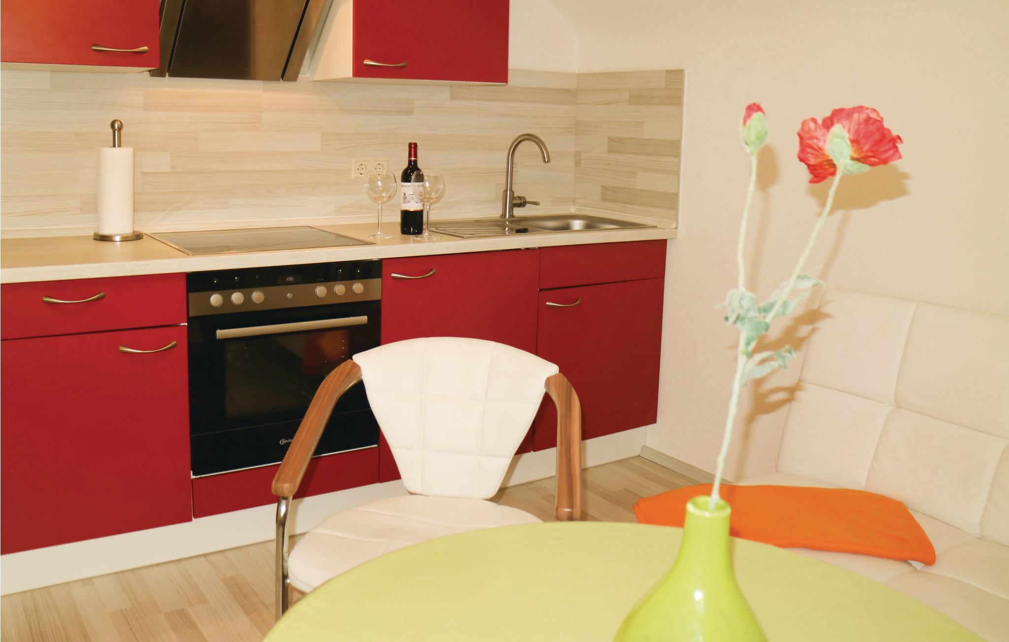 Denne ferieleiligheten ligger i første etasje i huset. Den har et separat soverom med en koselig dobbeltseng. Ferieleiligheten er funksjonelt og moderne innredet. Den møblerte balkongen i første etasje kan deles. I kjelleren er det et velværeområde med badstue, dusj og avslapningsrom, som du kan bruke mot et gebyr. Badstuehåndklær, badekåper og sko kan leies på stedet for dette formålet.