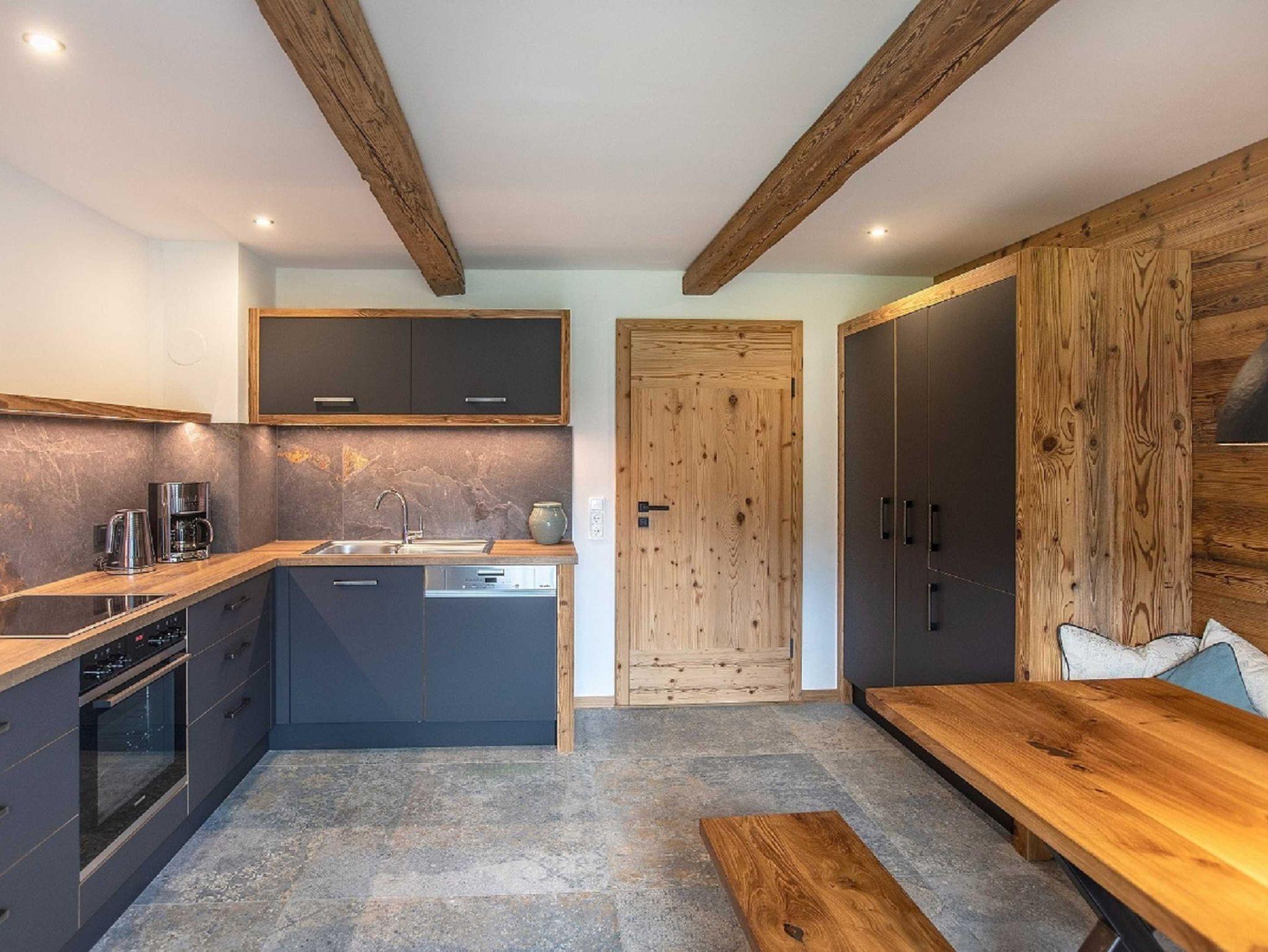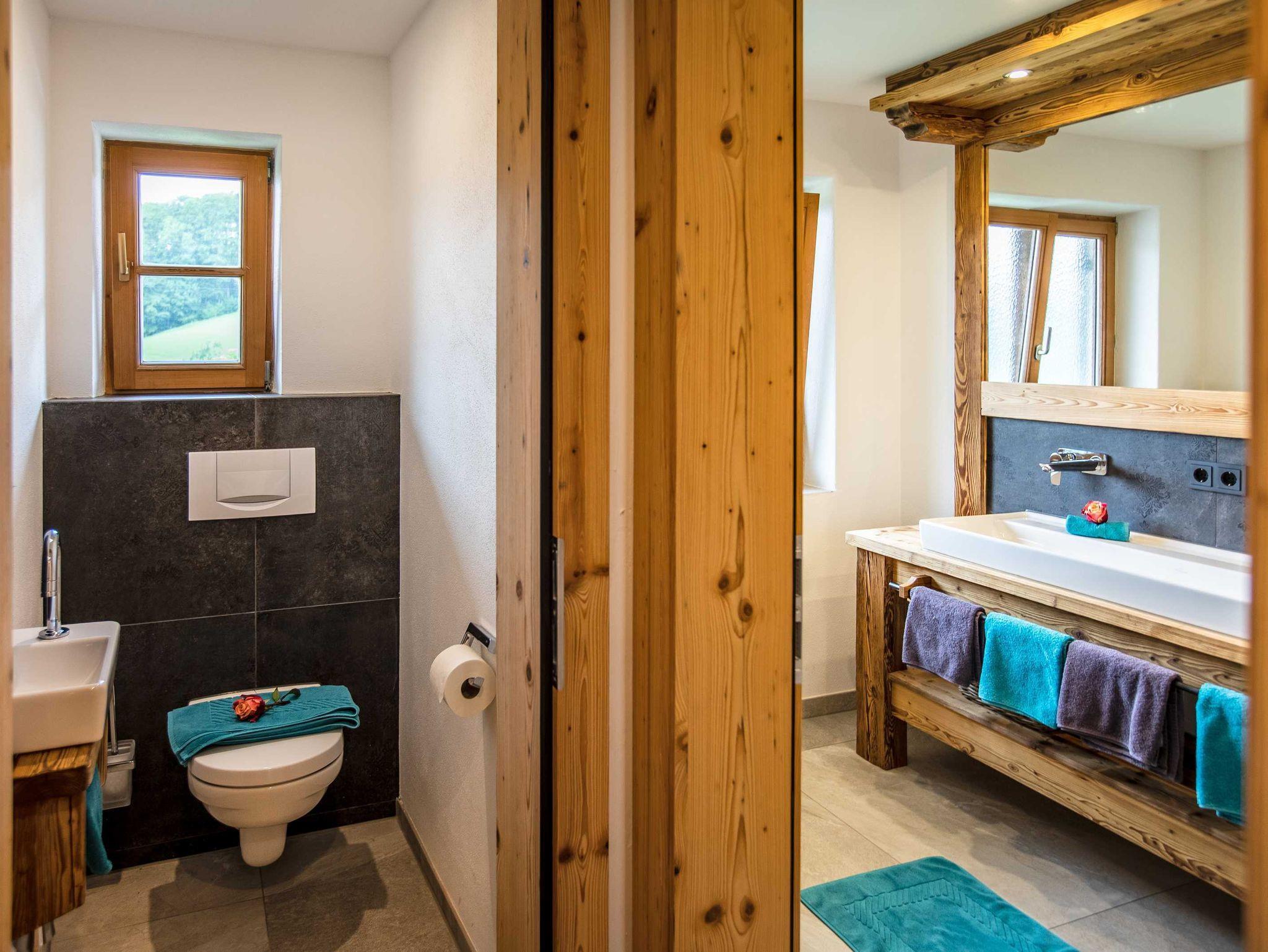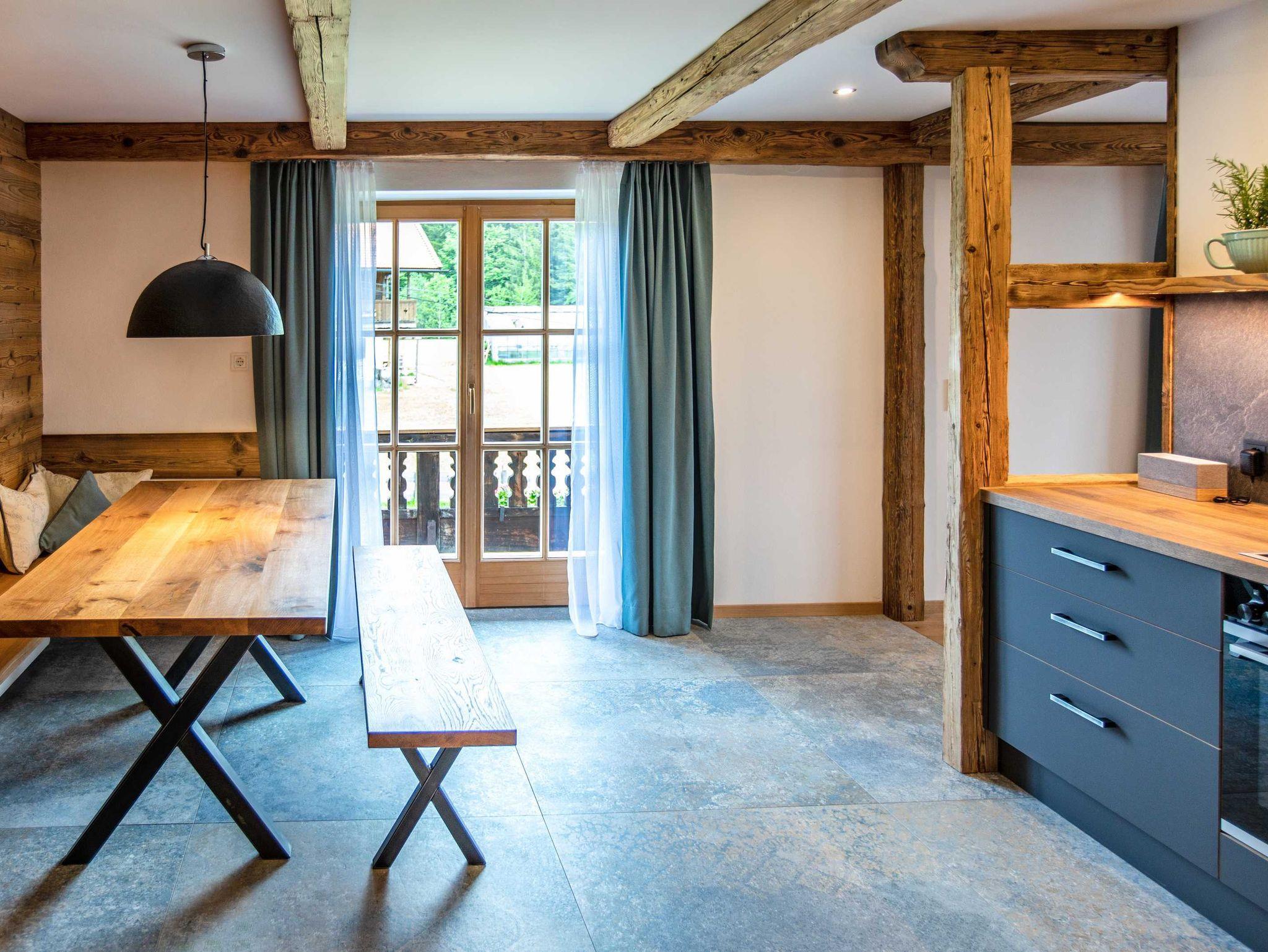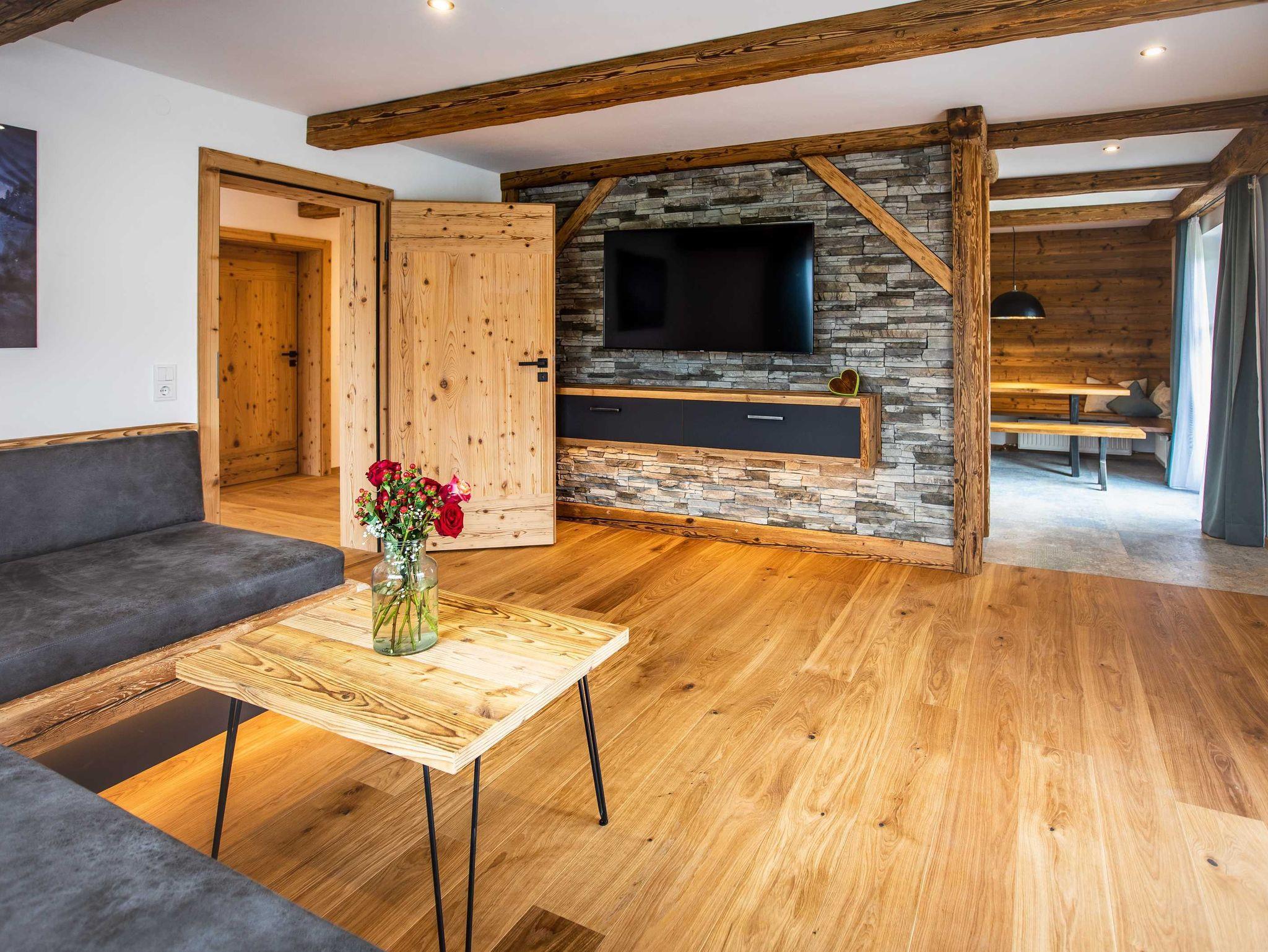 Unsere neue Ferienwohnung Bergzeit verwöhnt Sie mit edlem Altholz und aufwendig gefertigten Loden. Beim Design haben wir auf ein modernes Wohnambiente geachtet, das in Verbindung mit typisch bayerischen Stilakzenten ein gemütliches und außergewöhnliches Erlebnis bietet. Im Untergeschoss der doppelstöckigen Wohnung finden Sie ein offenes Wohnzimmer, 2 separate Schlafzimmer sowie ein Badezimmer. Über die Wendeltreppe im Wohnzimmer gelangen Sie ins Obergeschoss, in dem sich die Küche auf einer Galerie sowie das Wohn-Esszimmer mit Balkon befinden. Im oberen Bereich der Ferienwohnung befindet sich zusätzliches ausziehbares Doppelbett.
