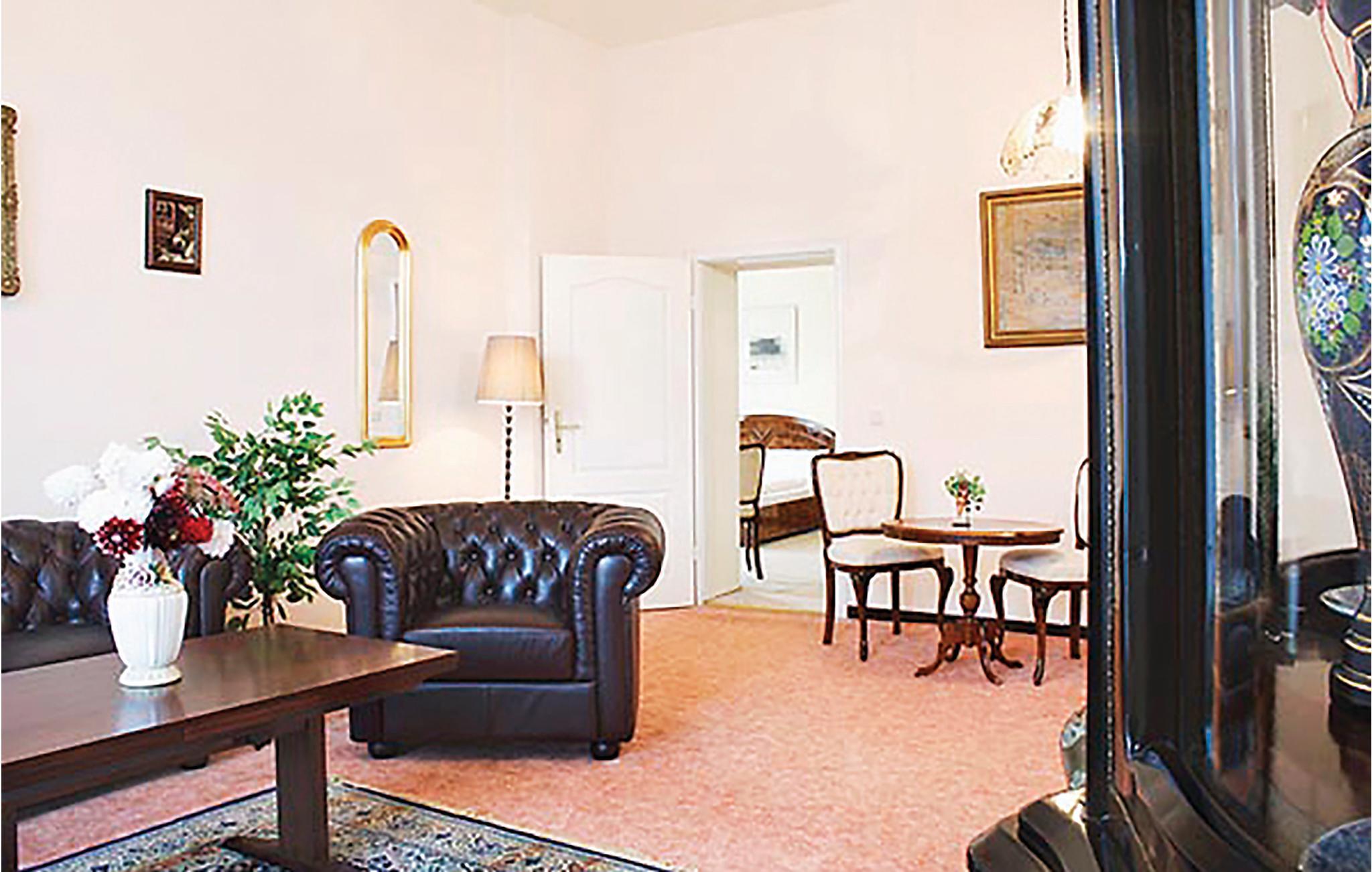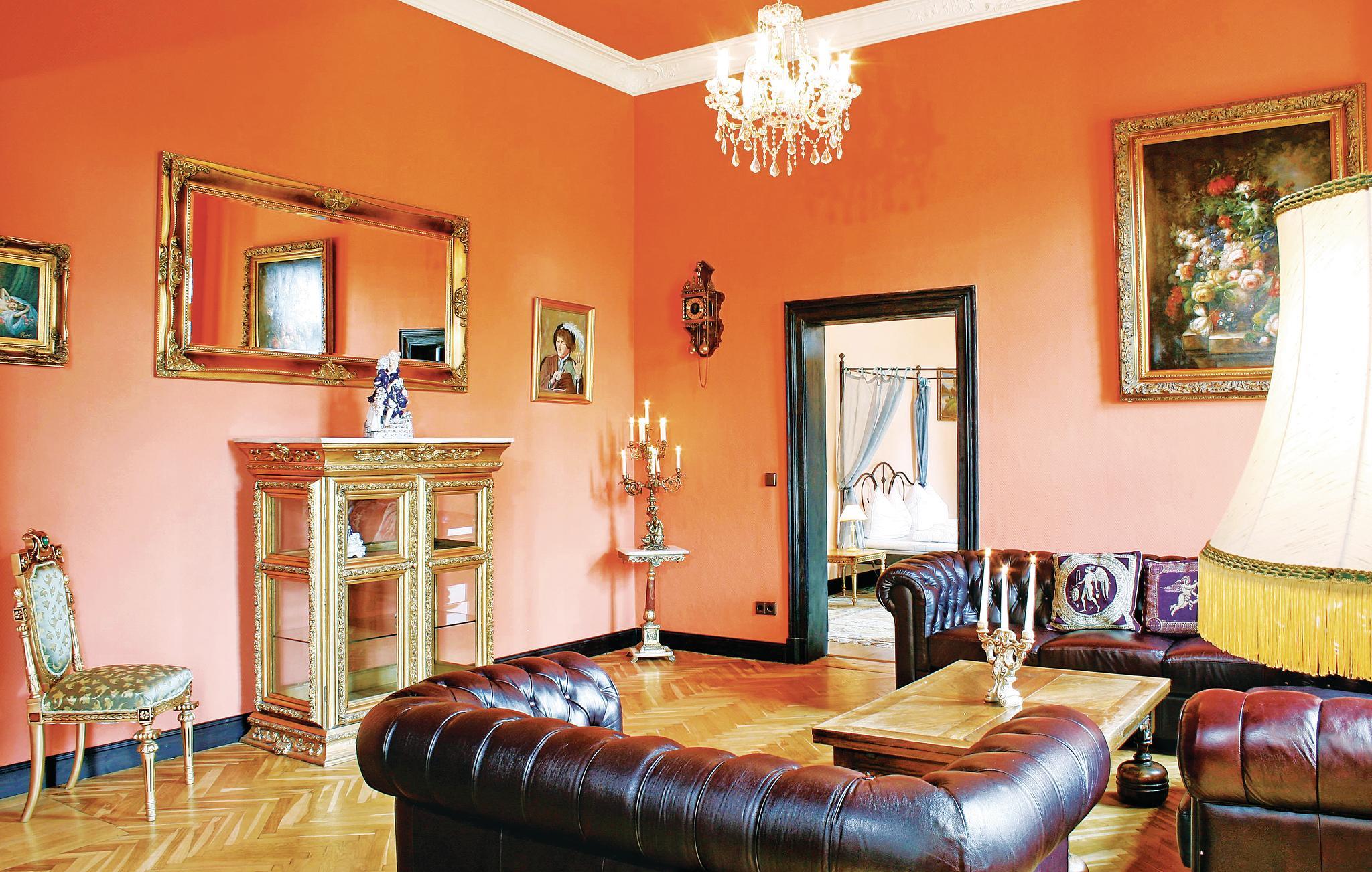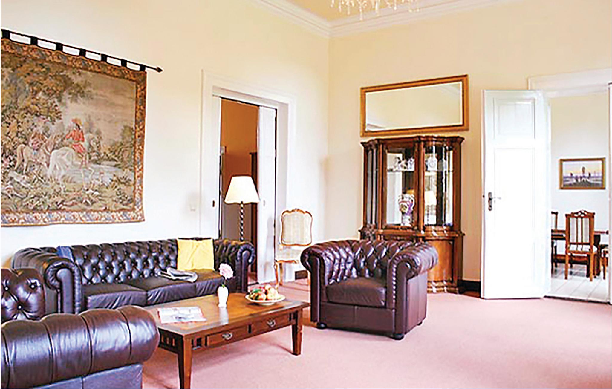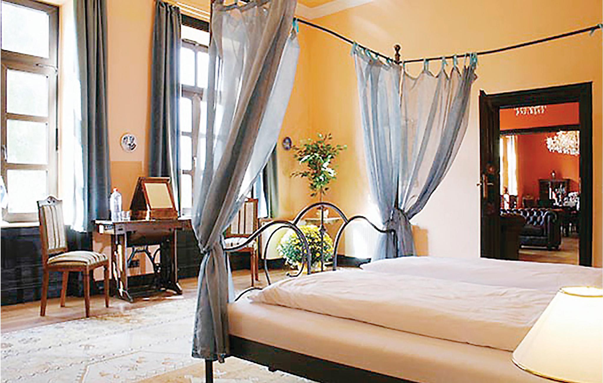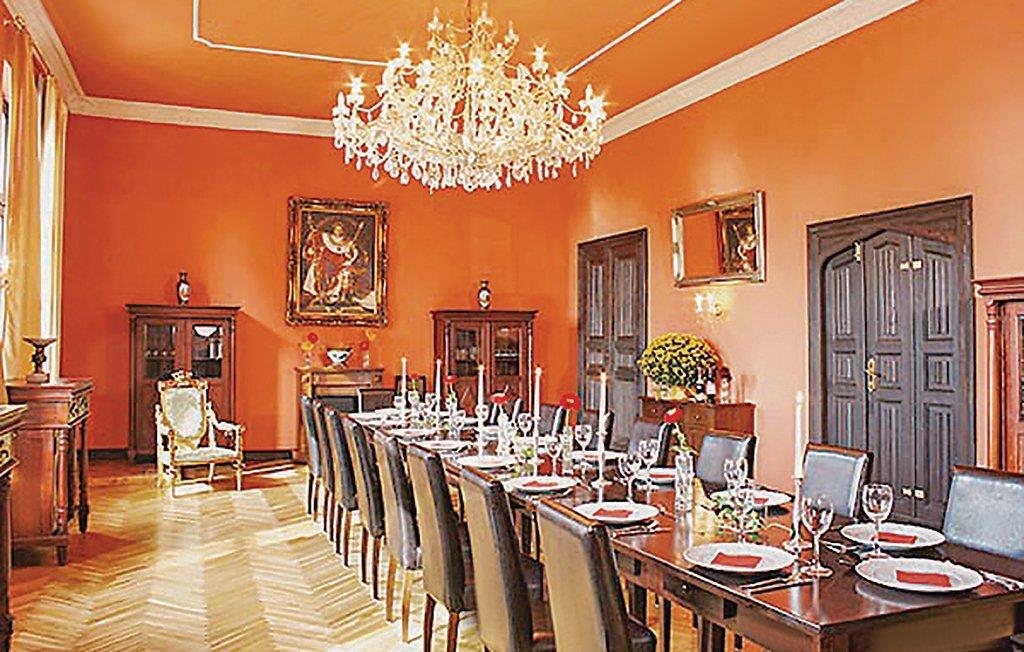 Slottets terrasse og balkong har utsikt over en liten innsjø. Opptil 20 personer kan innkvarteres i totalt 7 koselig innredede leiligheter, hver med sin egen kjøkkenkrok. Det er også et hovedkjøkken for alle beboerne. Slottet er derfor ideelt for gruppeturer eller en ferie med storfamilien. I underetasjen er det en stor spisesal som kan brukes til feiringer eller møter. I kjelleren er det badstue, solarium og treningsrom. Det er også et biljardrom, en stor overbygd terrasse og et 32 m² stort oppvarmet/overbygd svømmebasseng på eiendommen. Her kan du nyte ferien sammen med storfamilien.