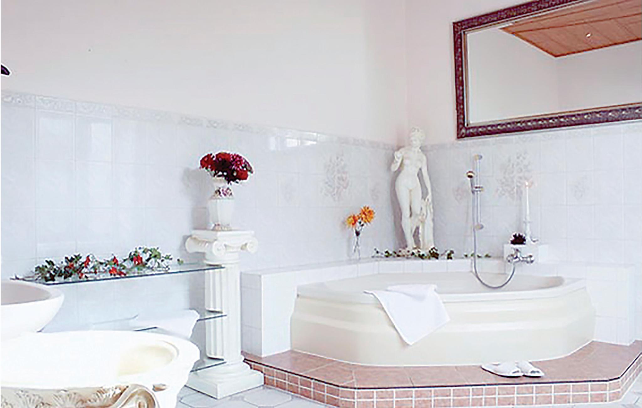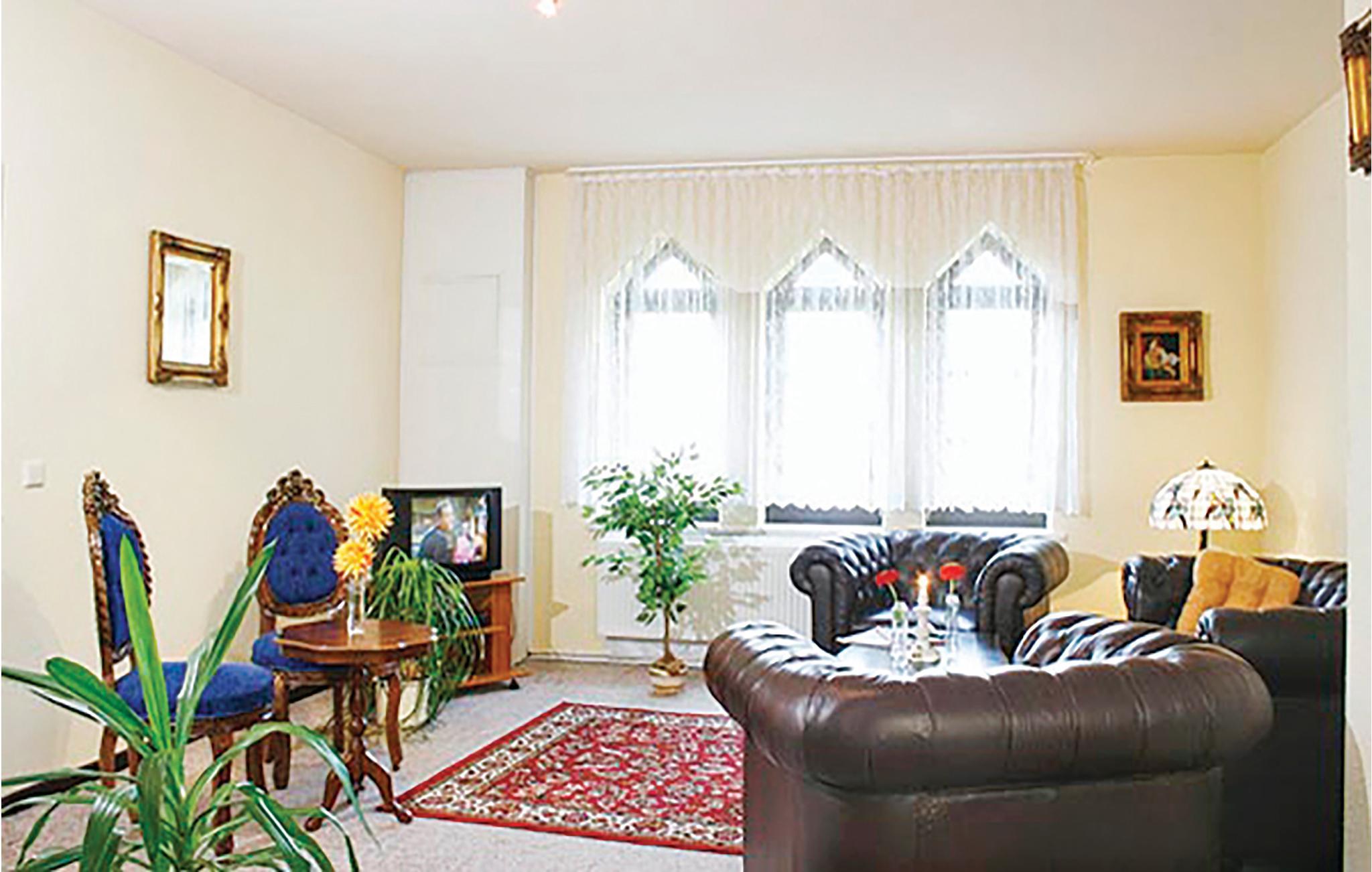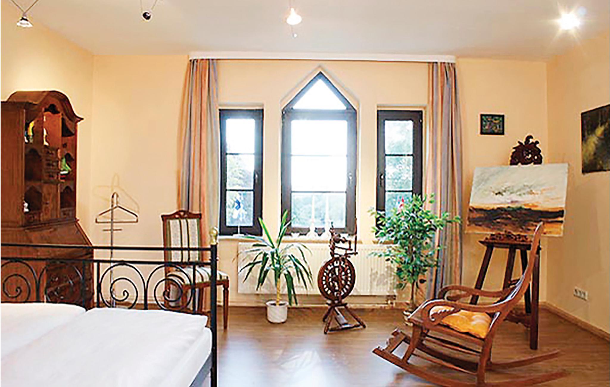 Slottets terrasse og balkong har utsikt over en liten innsjø. Opptil 20 personer kan innkvarteres i totalt 7 koselig innredede leiligheter, hver med eget kjøkken eller kjøkkenkrok. Slottet er derfor ideelt for gruppereiser eller ferier med en stor familie. I underetasjen er det en stor spisesal som kan brukes til feiringer eller møter. I kjelleren er det badstue, solarium og treningsrom. Det er også et biljardrom, en stor overbygd terrasse og et 32 m² stort oppvarmet/overbygd svømmebasseng på eiendommen. Her kan du nyte ferien sammen med storfamilien.