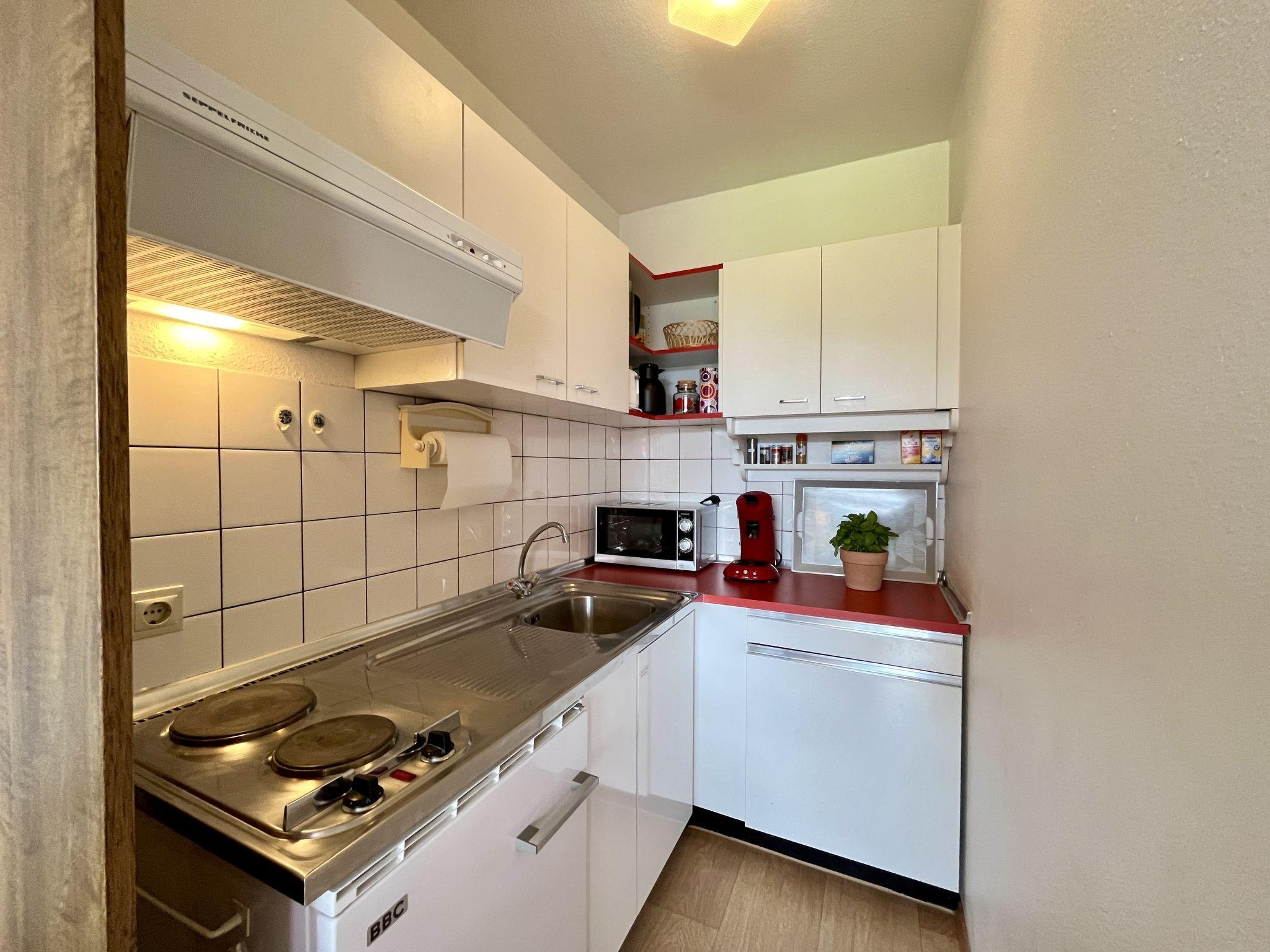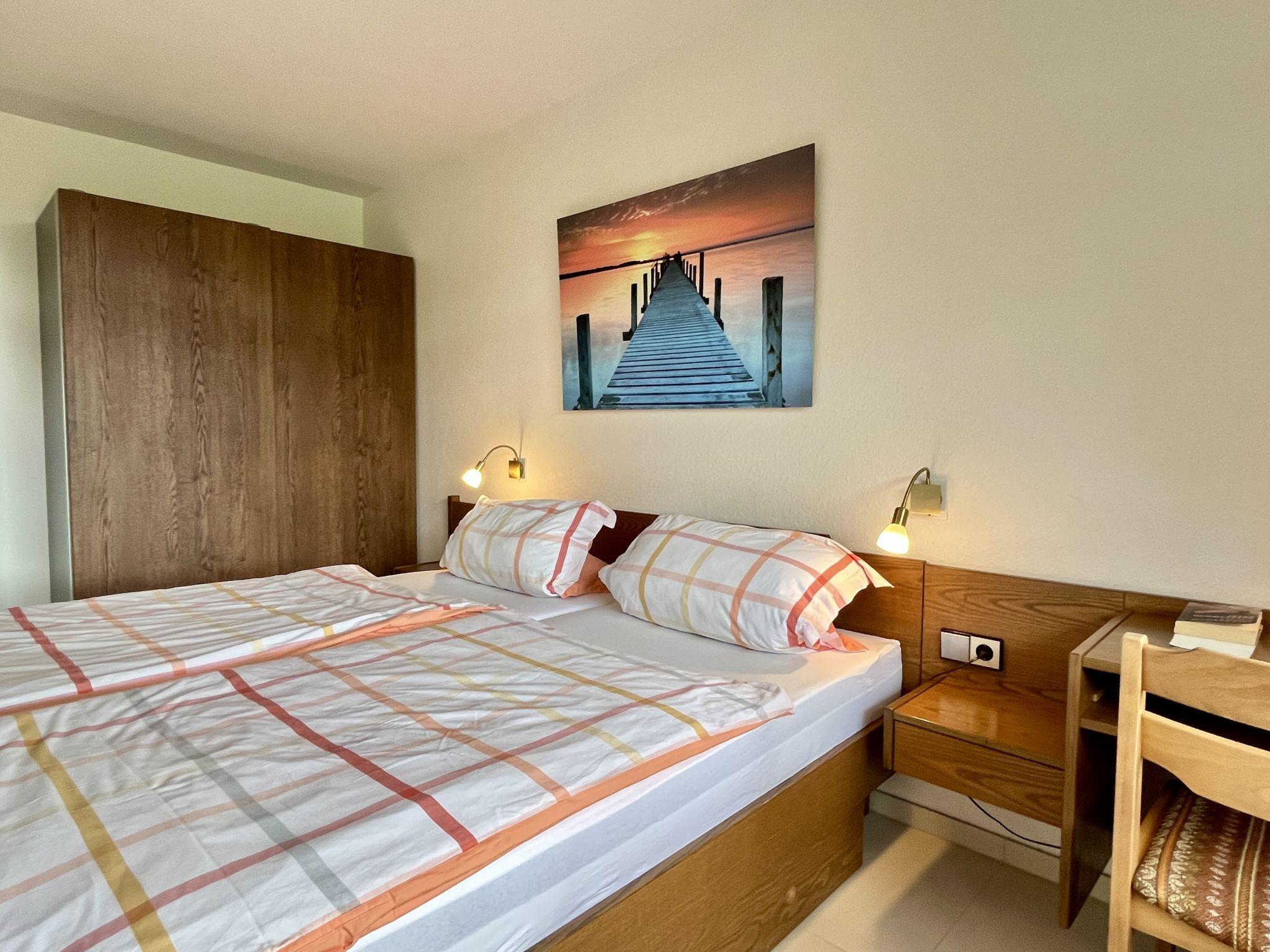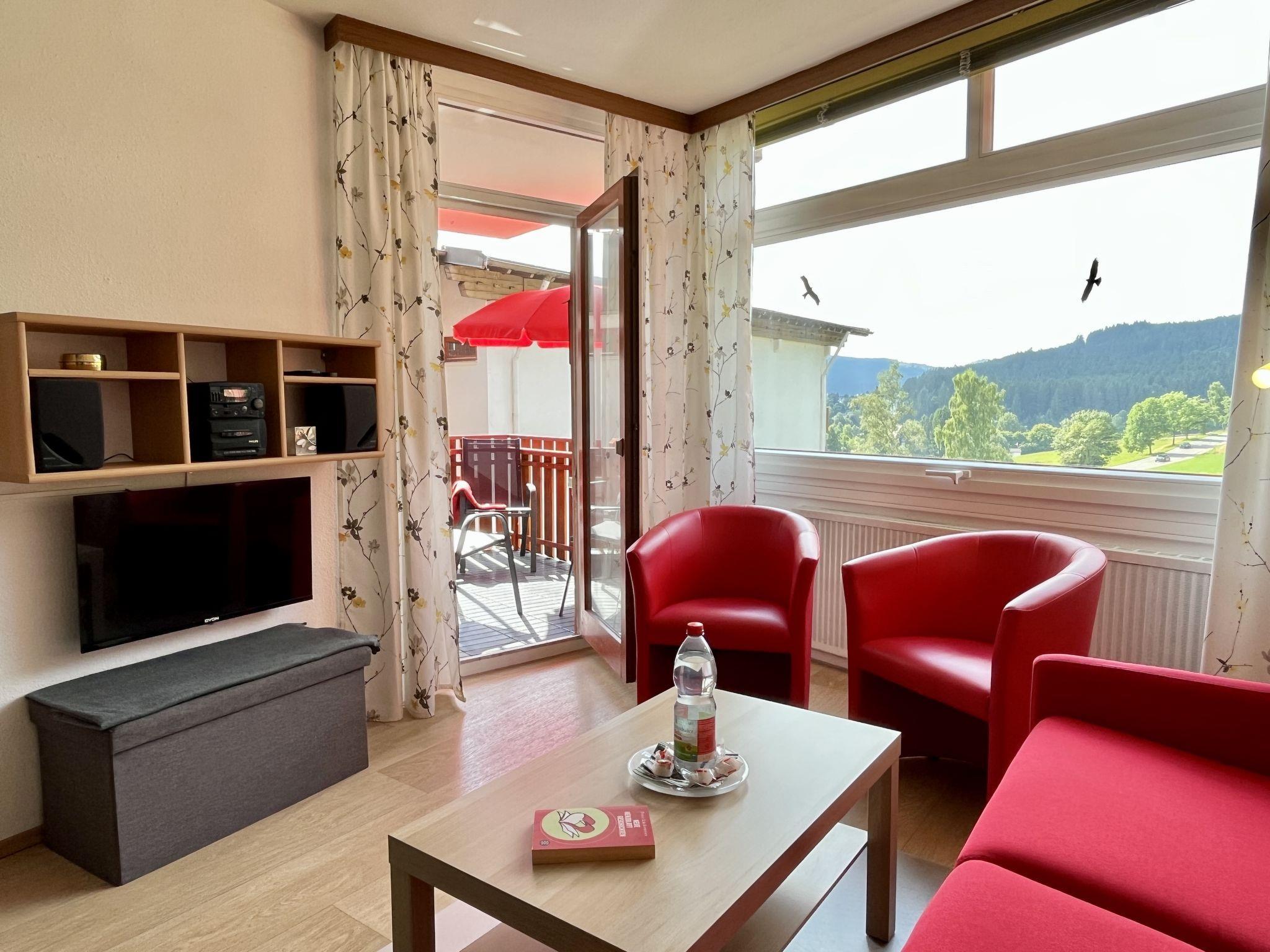 "Schöne Aussicht (App 1406 / EX-Kurhotel)", 2-room apartment 45 m2 on 4th floor. Bright, cosy furnishings: living/dining room with 1 double sofabed and satellite TV (flat screen), hi-fi system and DVD. Exit to the balcony. 1 double bedroom with 1 double bed. Exit to the balcony. Small kitchenette (2 hot plates, microwave, electric coffee machine). Bath/WC. Balcony 6 m2. Balcony furniture. Beautiful view of the countryside and the forest. Facilities: iron, hair dryer. Internet (WiFi, extra). Garage. Please note: fridge without freezer, non-smokers only. Smoke alarm.