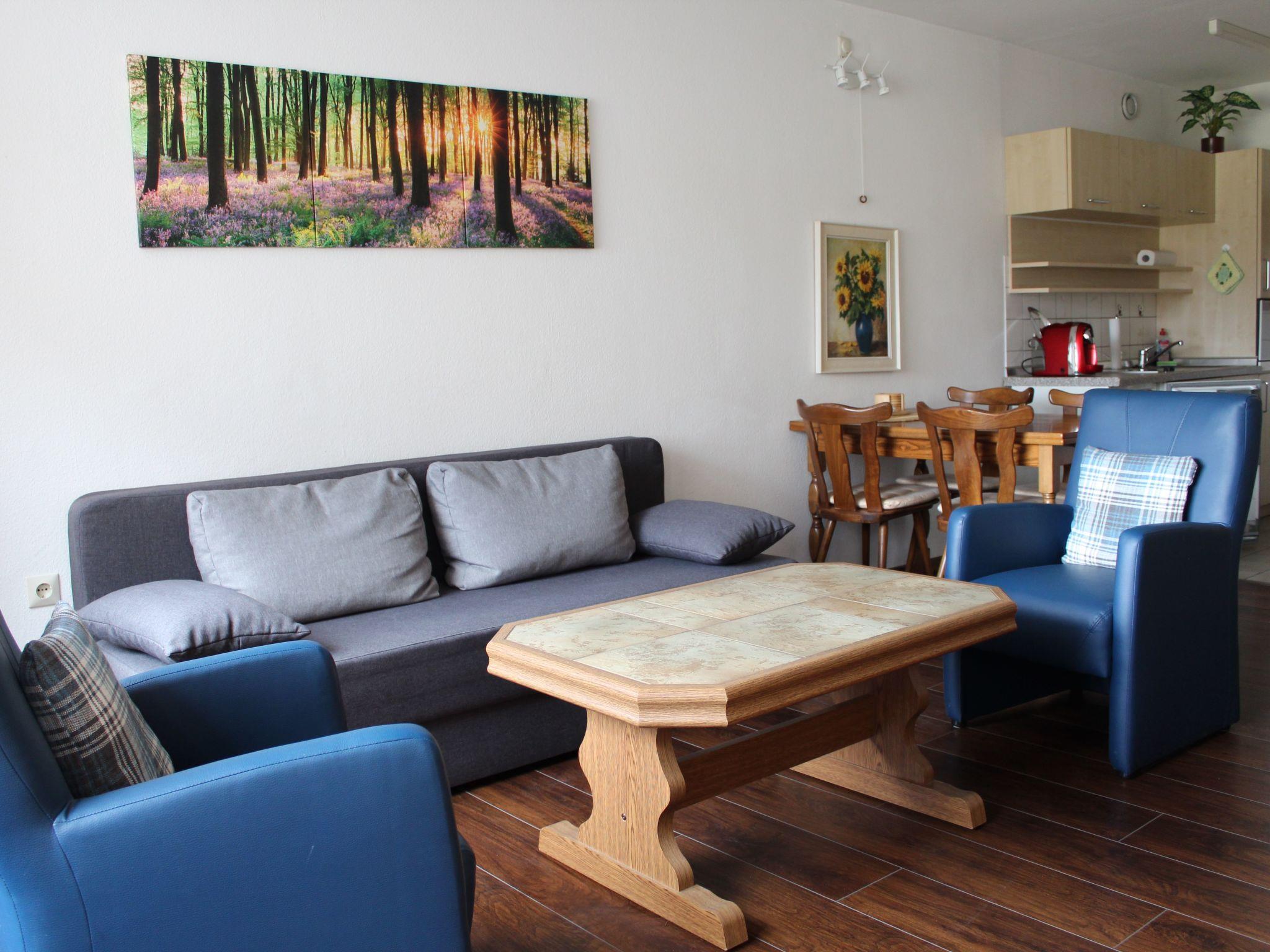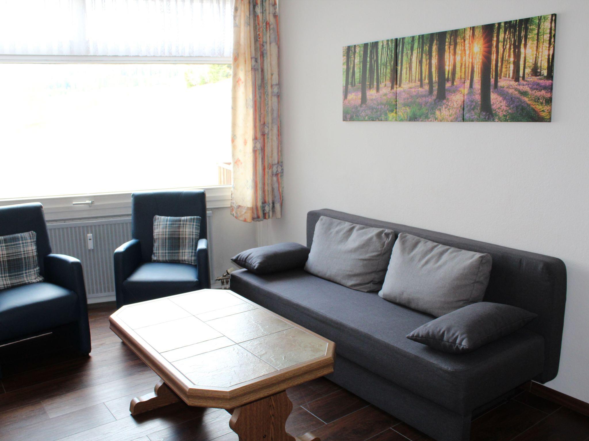 Take the lift from the underground car park to the first floor to your two-room flat with a living space of 47 m². The cosily furnished flat with balcony welcomes up to four people. In the double room, you sleep in a double bed with two separate mattresses, each measuring 90 cm x 190 cm. The double bed is surrounded by two bedside cabinets with wall-mounted reading lamps. There is also a wardrobe with a mirror element in this room to store your travelling wardrobe. There is also enough space in the bedroom to set up a baby cot, which is available free of charge. The centrepiece of the flat is the living room with adjoining open-plan kitchen and integrated dining area. After a day out, take a seat on the pull-out sofa bed in the living area, which is also suitable for a third and fourth guest with a sleeping area of 150 x 203 cm. Next to the sofa, two armchairs offer cosy seating. The flat-screen TV with satellite connection provides entertainment in the evening. The open-plan kitchen allows you to prepare your own meals using a glass ceramic hob (two hotplates with additional plate), a fridge with freezer compartment, a filter and capsule coffee machine, kettle, microwave oven and cooking utensils. The bathroom was renovated in November 2014 and is equipped with a shower cubicle, a wash hand basin with illuminated mirror cabinet and a WC. All floor coverings were replaced at the same time with additional underfloor heating in the bathroom and corridor. The wireless internet connection via WLAN is free of charge in the flat. From the bedroom and the living area, you can access the balcony in no time at all through the outside door, which lets in plenty of natural light.