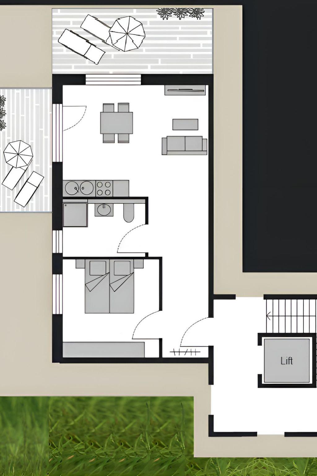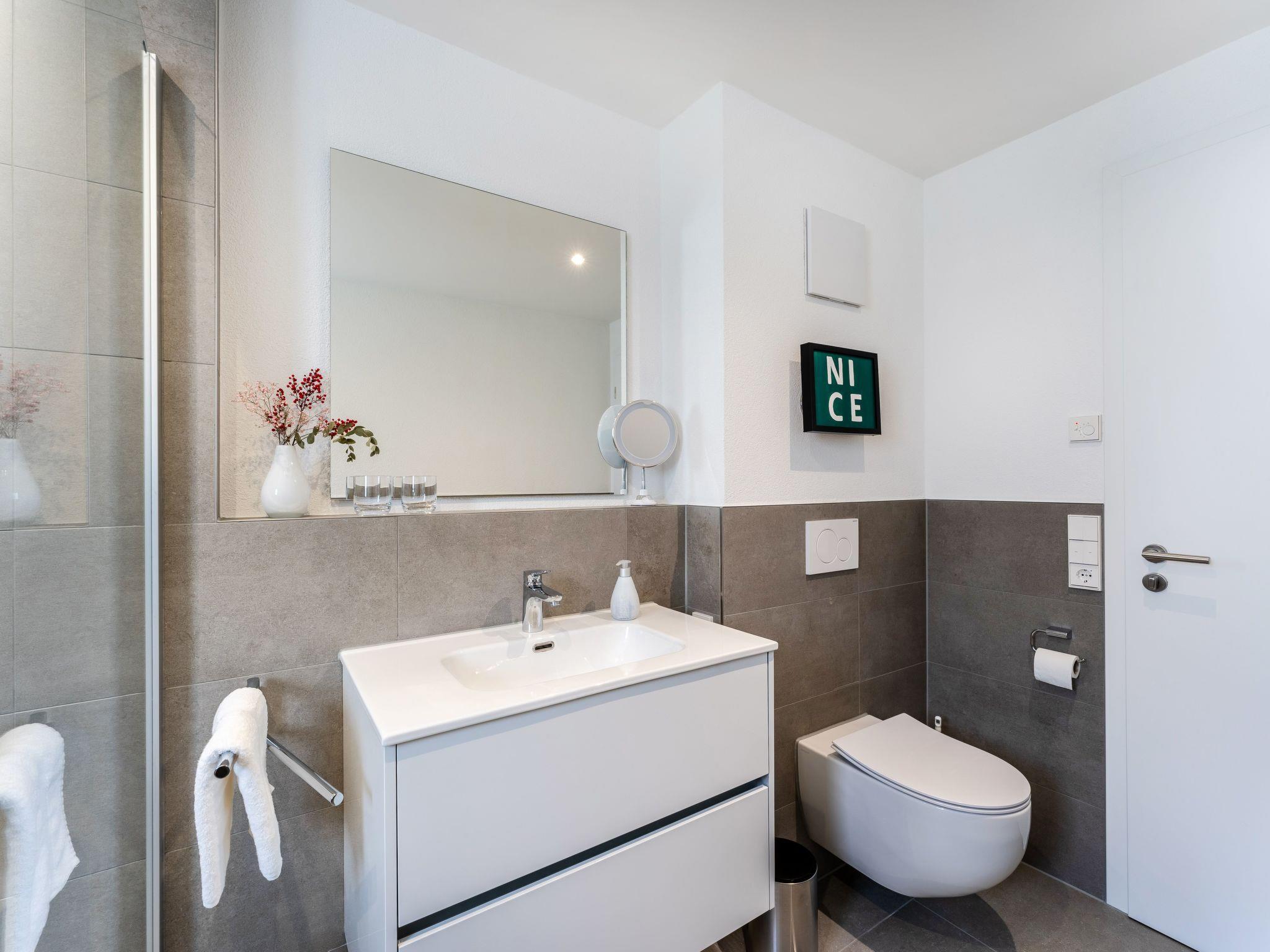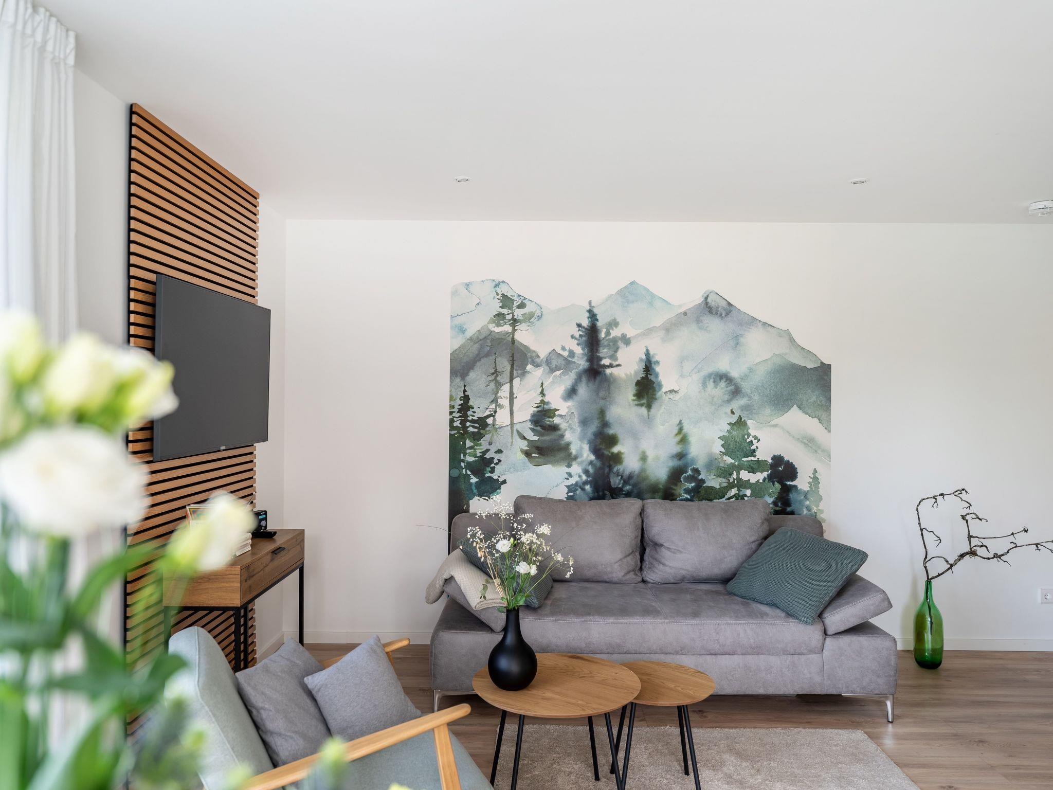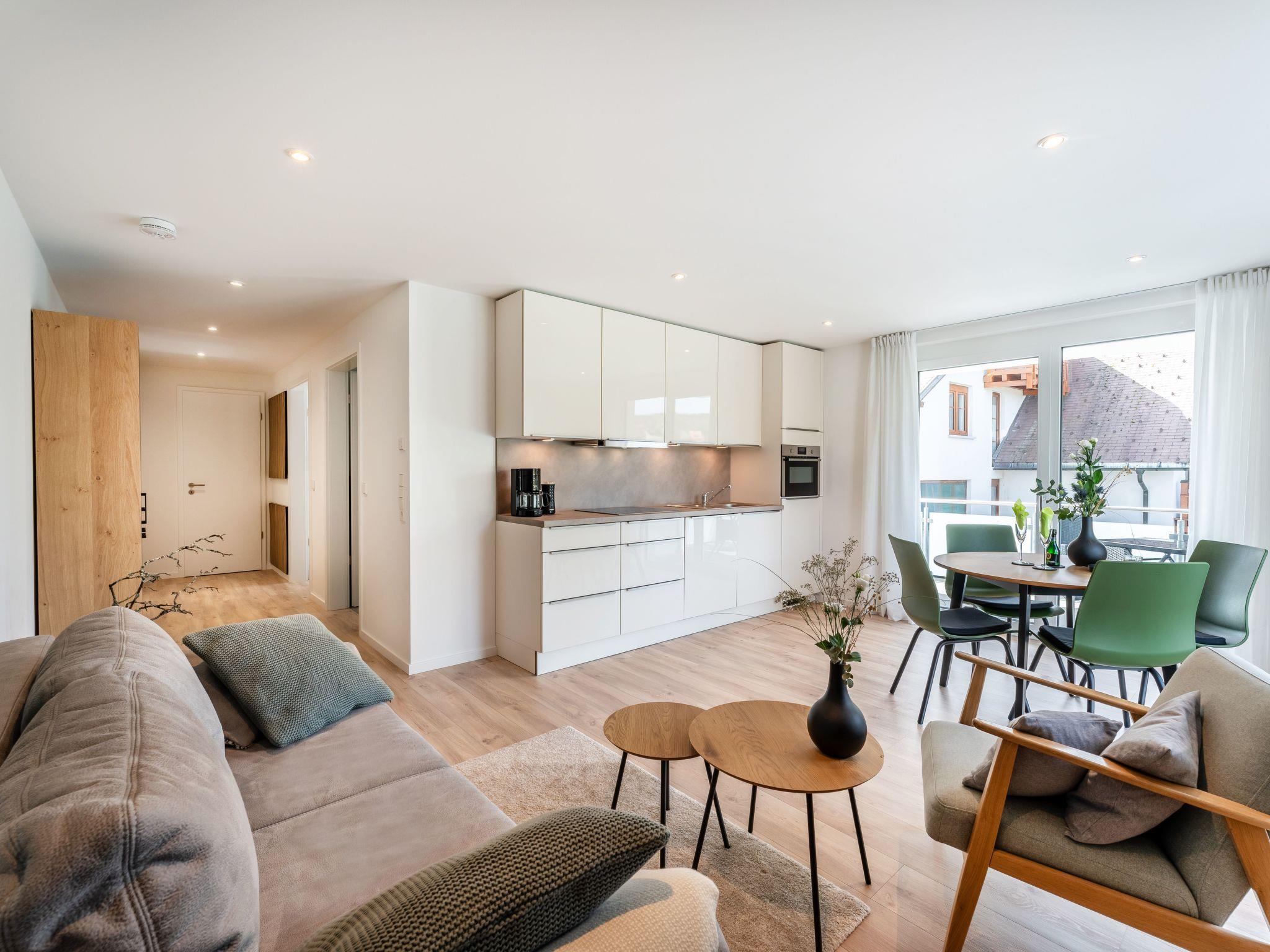 The flat is on the ground floor of a new building with six apartments and has its own underground parking space from where you can easily reach the flat via a lift. There is a shared storage room for bicycles. One of the highlights of the flat is the side balcony and the large terrace, both of which are easily accessible from the living area. On the spacious terrace, you can end the day in a beautiful lounge with a glass of wine and an unobstructed view of nature. The new high-gloss brand kitchen leaves nothing to be desired with an induction hob, dishwasher, fridge-freezer and microwave. The bright daylight bathroom is equipped with a large walk-in rain shower. In addition to the underfloor heating, there is an additional heated towel rail and a light motion detector. The modern bedroom pampers you with a large box-spring bed (180 x 200 cm) and a spacious wardrobe. Modern smart TVs in the living room and bedroom, free WiFi and a radio/CD player round off the overall picture. The living room and bedroom can be pleasantly darkened with electric external roller shutters. Bed linen and towels can be provided for a fee of EUR 55. If desired, you can also bring your own (Box Spring bed with a topper over both mattresses, bed size is 180 x 200). Tourist tax will be charged separately.