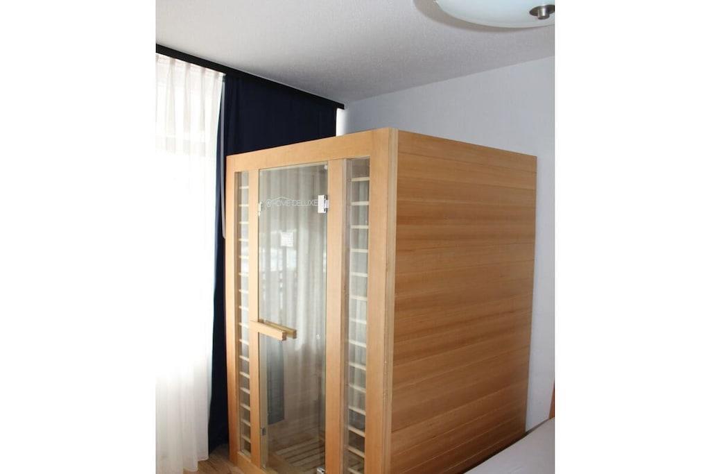 I 2. etasje: (Kjøkken(komfyr med kokeplater, brødrister, kaffetrakter, stekovn, mikrobølgeovn, oppvaskmaskin, kjøleskap, fryser), Stue/soverom(, 1 persons sovesofa, TV, Blu-ray-spiller), soveværelse(, Hytte, dobbeltseng), Barneværelse(, , køyeseng, Blu-ray-spiller, babyseng/sprinkelseng), bad(, dusj, håndvask, Hårtørker)) , , avslapningsområde(badstue), Internett-tilgang, tørketrommel, vaskemaskin, balkon(hagemøbler), parkering