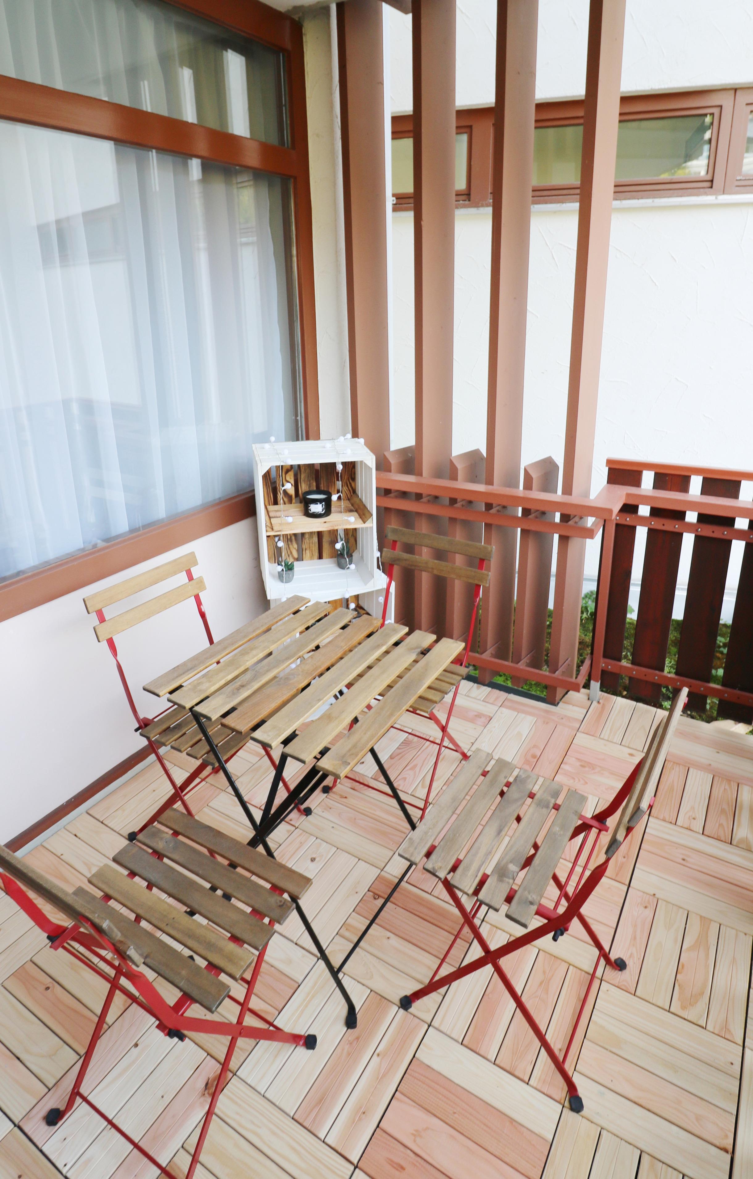 - a balcony with balcony furniture and access to the sleeping/living area. Here you have a beautiful view of the spa gardens.