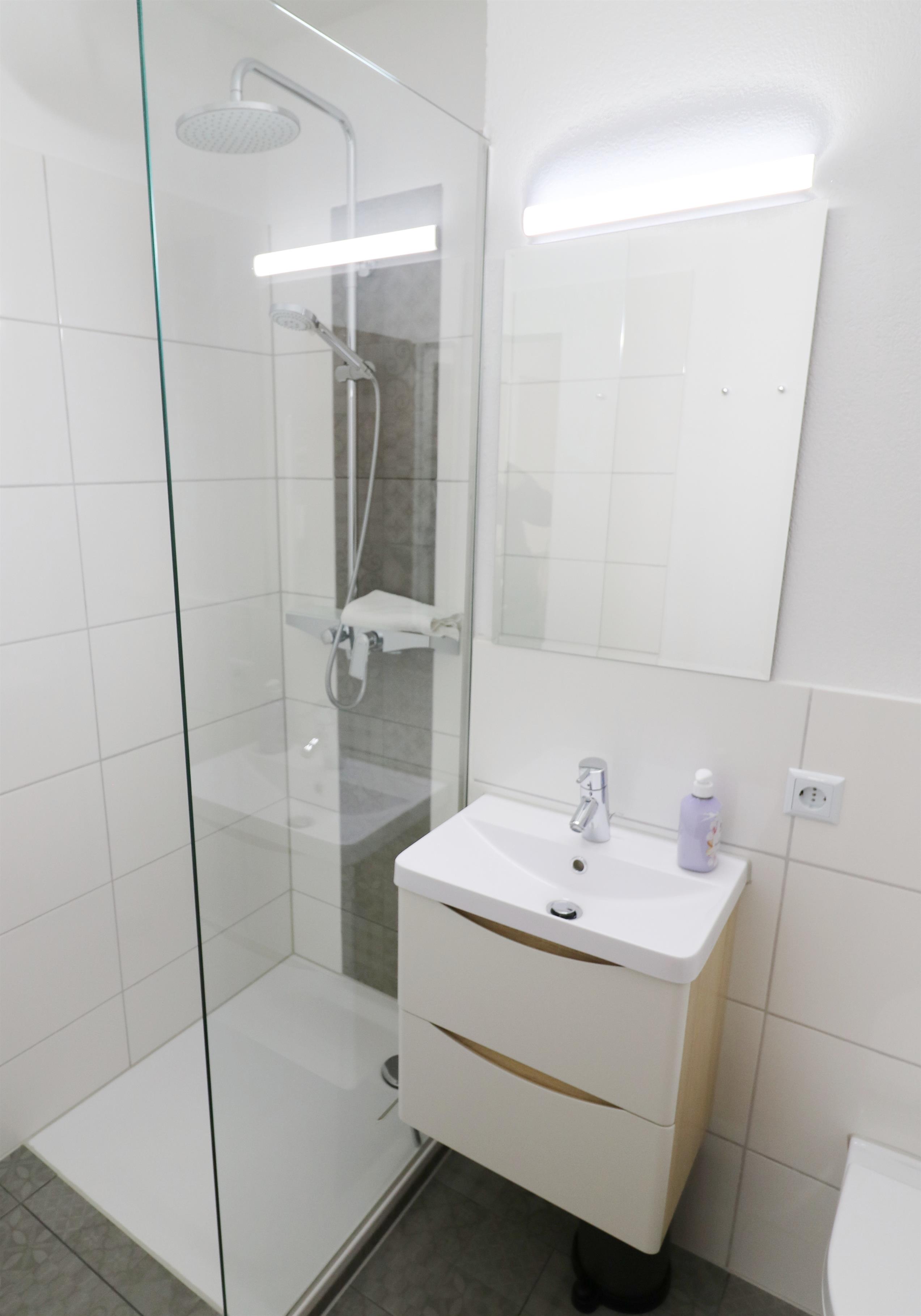 - ein Bad mit Waschbecken, Föhn, WC und Dusche
