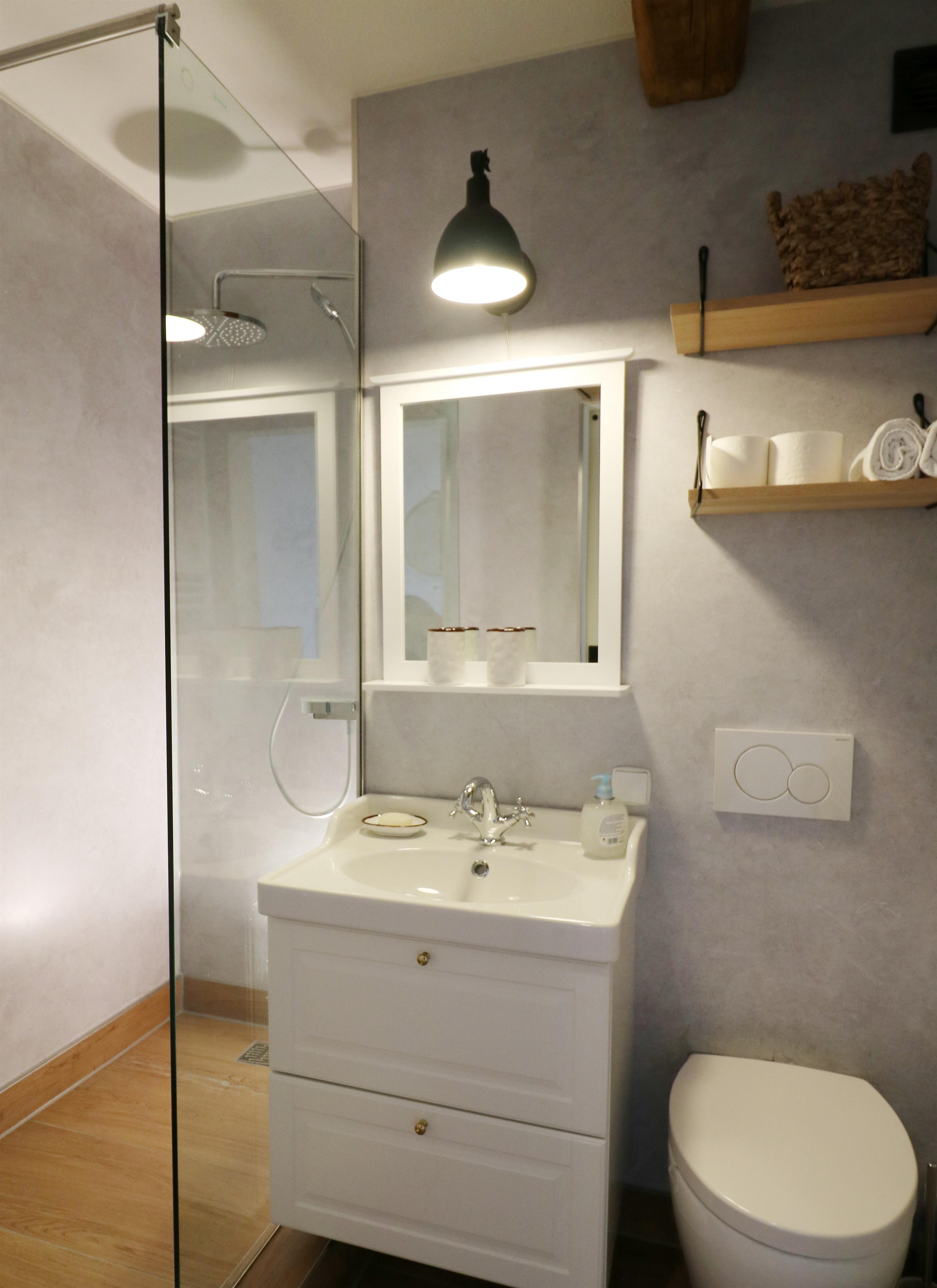 - bathroom with shower, washbasin, WC