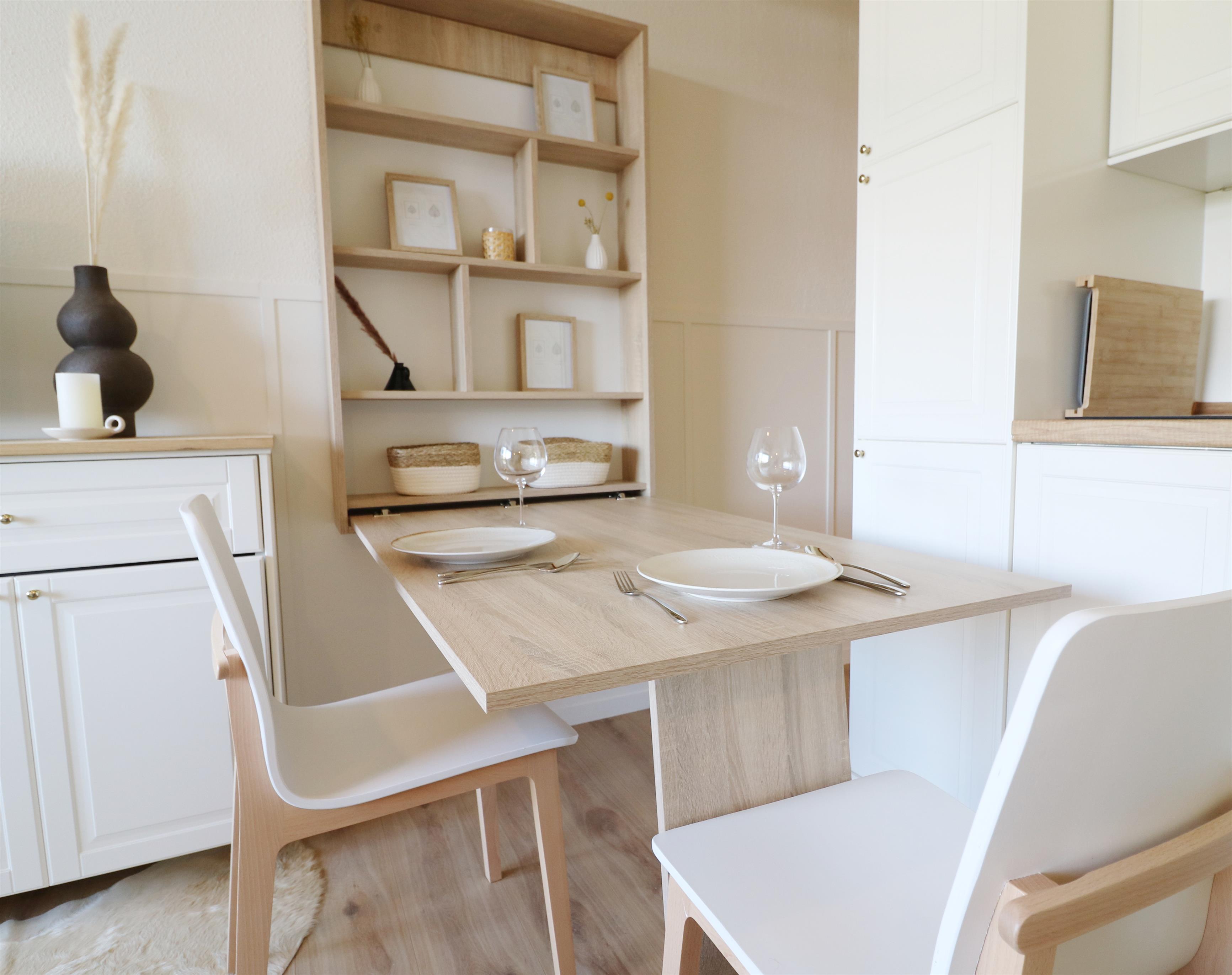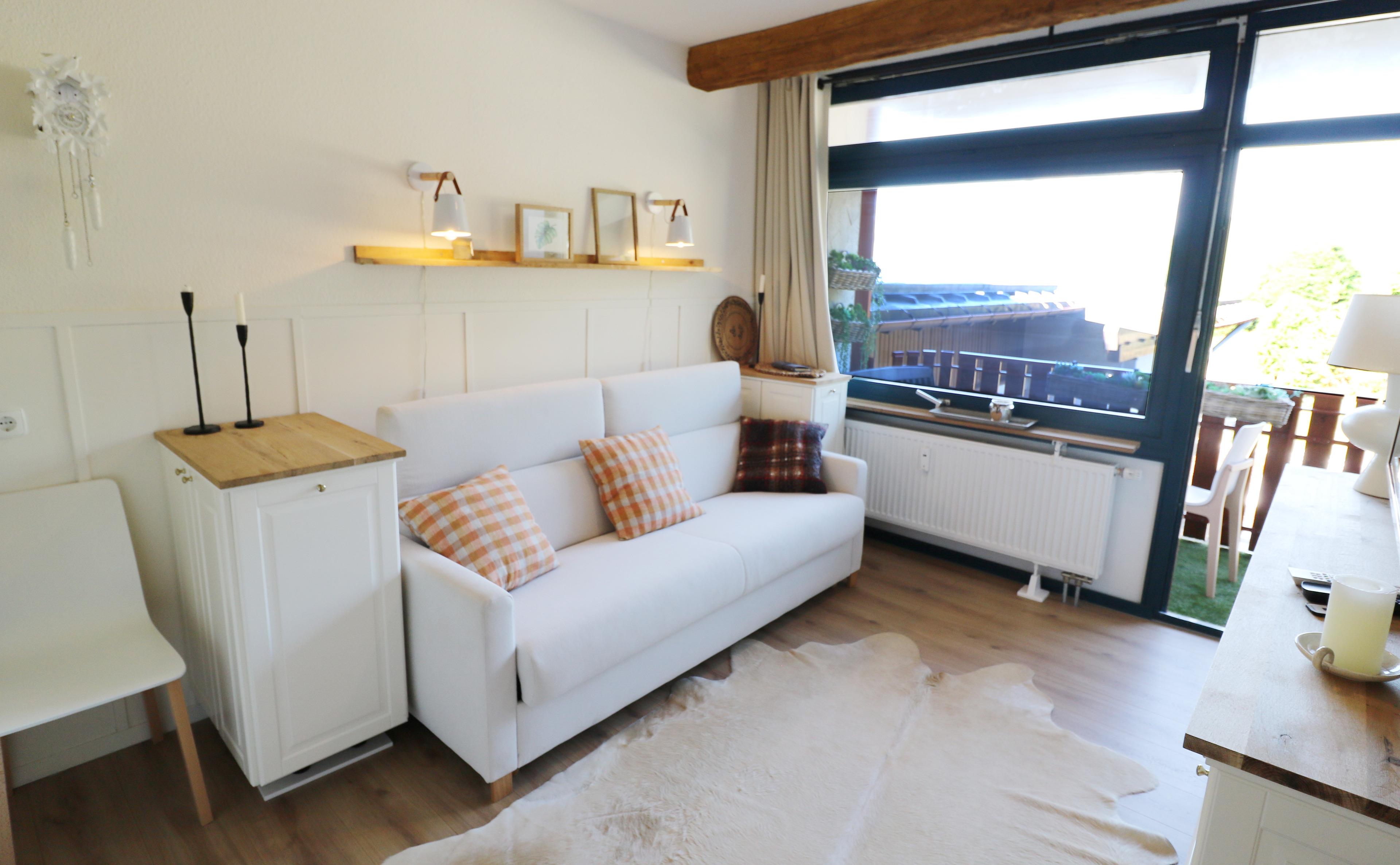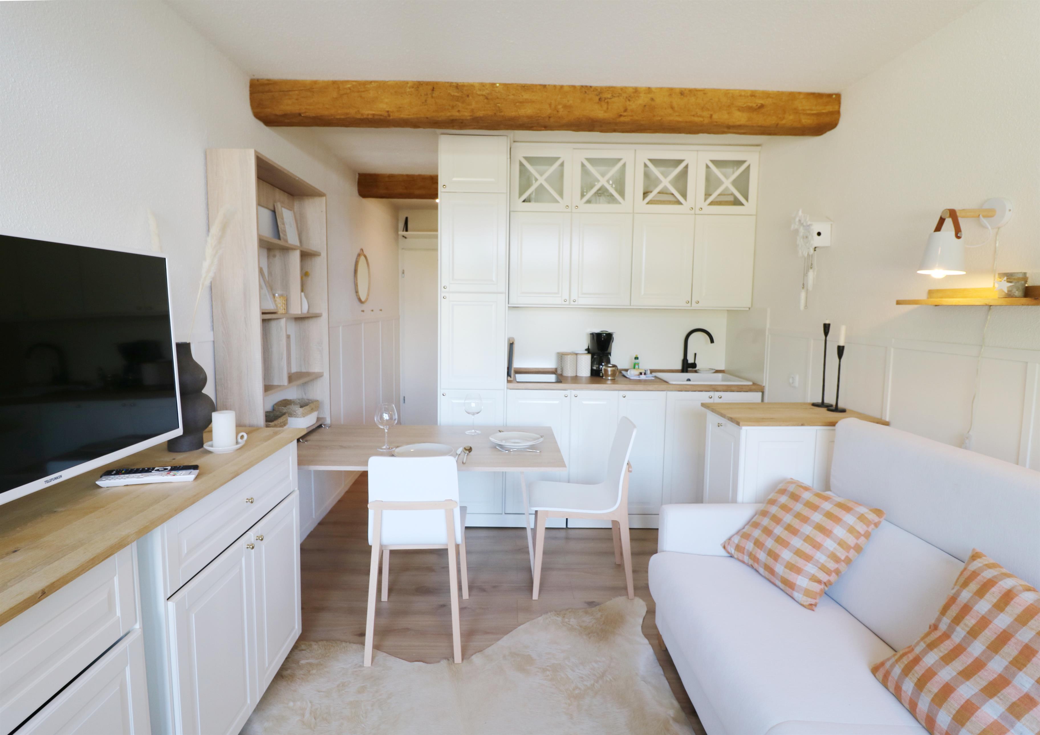 - ein kombiniertes Wohn-/ Esszimmer mit Schlafsofa, TV, ausklappbarer Essplatz mit 2 Stühlen
