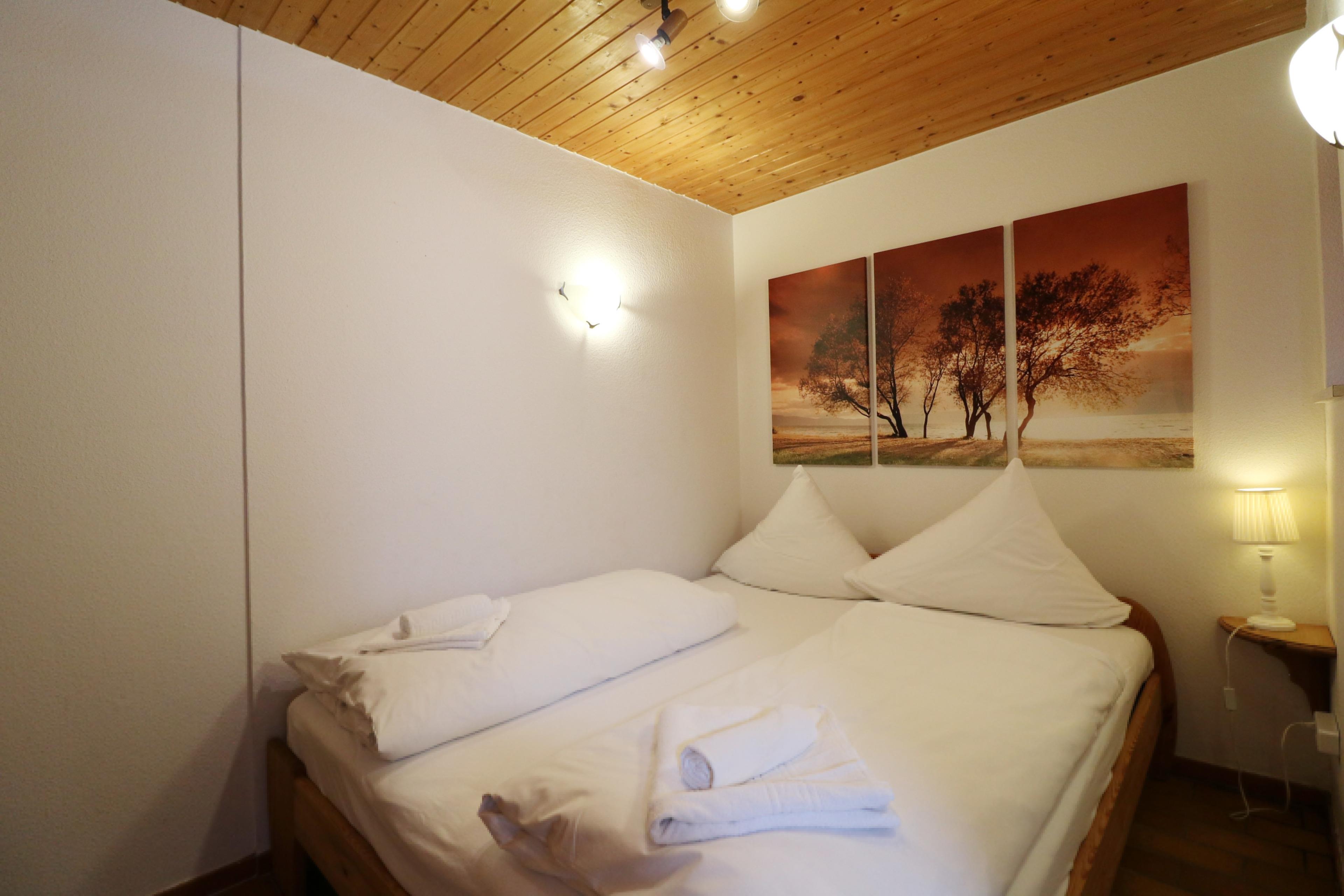 - ein Wohn,-Schlafzimmer mit Doppelbett in einer Nische (durch einen Vorhang abgetrennt), TV, Küchenzeile und Essplatz