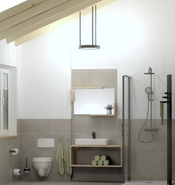 - ein Badezimmer mit WC, bodengleiche Dusche und Föhn