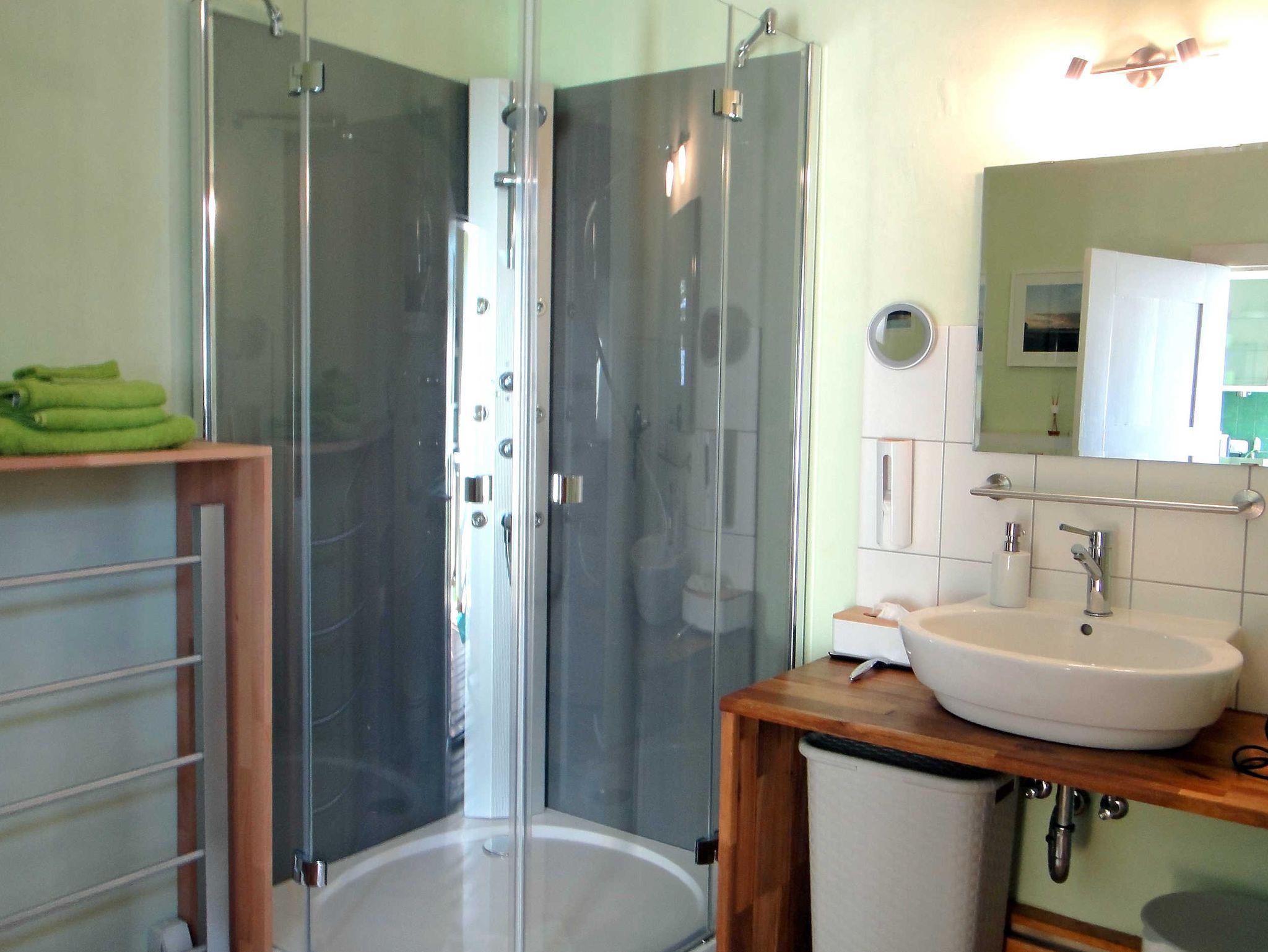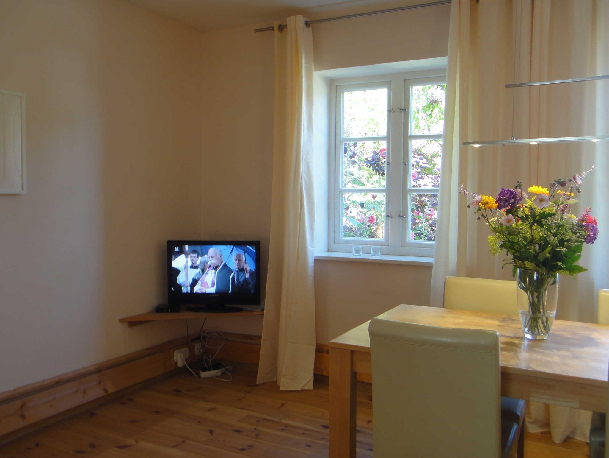Die Ferienwohnung LandGenuss ist die vierte Ferienwohnung in der rechten Hälfte des Haupthauses. Sie verfügt über ein Wohn-/Esszimmer mit Buche-Esstisch, modernen Stühlen, Komfort-Schlafsofa (für ein Kind bis 16 Jahre) und Fernsehsessel. SAT-LCD-TV und Stereoanlage gehören natürlich dazu. Im Schlafzimmer erwarten Sie ein modernes Bett im Boxspring-Stil und ein Schiebetürenschrank. Die Wohnküche mit ausziehbarem Esstisch ist großzügig bemessen und verfügt, neben einem Einbauherd mit Ceranfeld, über eine Mikrowelle, eine Kühl-Gefrierkombination, einen Geschirrspüler, außerdem Kaffeemaschine, Wasser- und Eierkocher sowie Toaster. Auch bei Geschirr, Besteck und Töpfen handelt es sich selbstverständlich um Markenware. Das geräumige Bad ist mit Wellnessdusche, Föhn und ausreichend Staufläche ausgestattet. Natürlich verfügt Ihr 70 m² großes Appartement über WLAN und Tresor. Im gemeinsamen Hauswirtschaftsraum im Nebengebäude können Sie eine Waschmaschine, einen Kondenstrockner sowie eine Bügelstation mit nutzen.