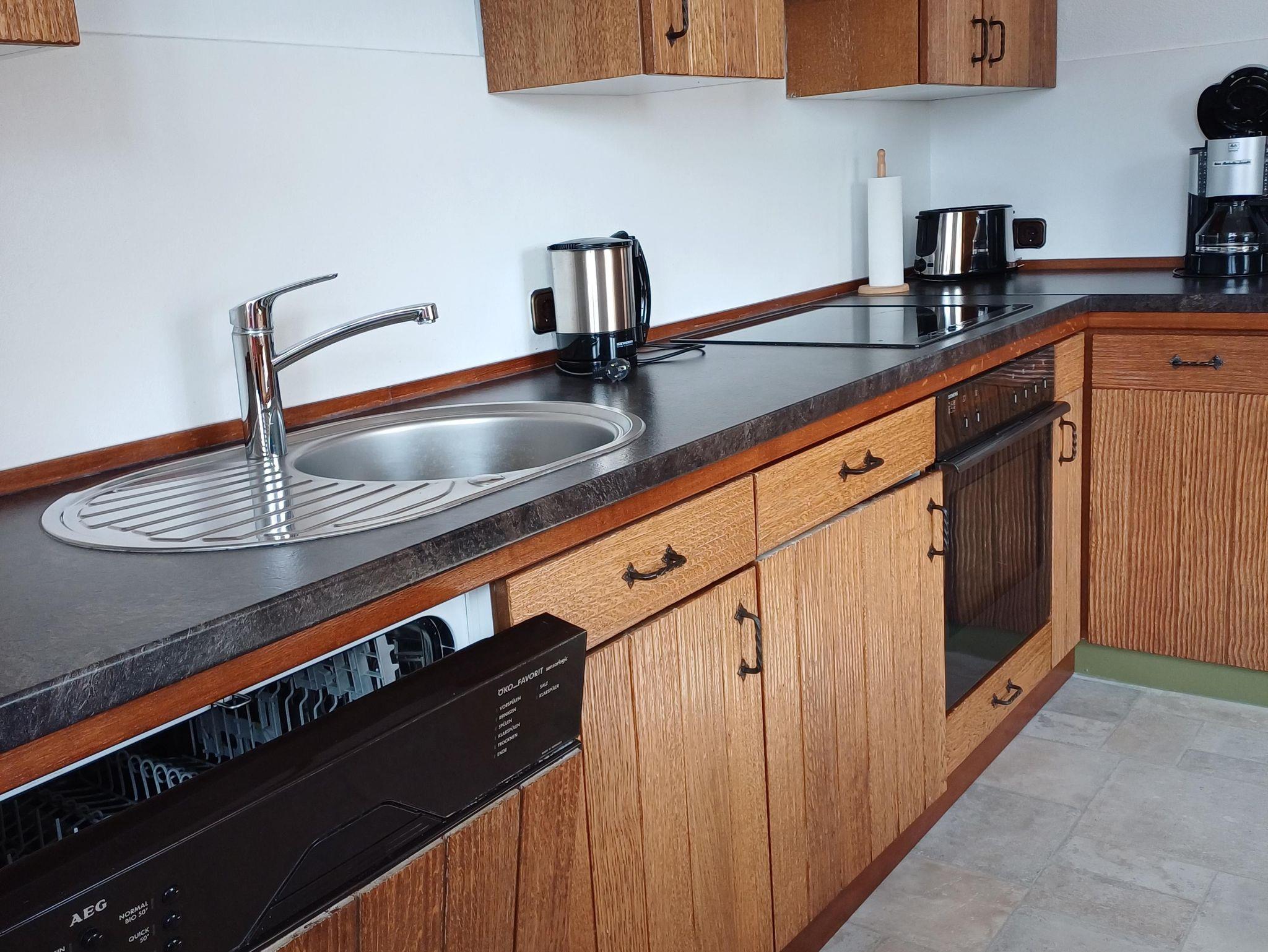 Unsere Ferienwohnung befindet sich im 1. Stock und hat einen Südbalkon mit Bergblick. Die Küche ist komplett ausgestattet mit Kaffeemaschine, Toaster, Geschirrspüler und Kühlschrank mit Gefrierfach. Das Bad ist neu renoviert und ist mit einer Dusche ausgestattet. Es befindet sich im Bad auch eine Waschmaschine, die auf Anfrage benützt werden kann. Im Dachgeschoss befindet sich ein Zimmer mit einem Bett 200x140 cm.