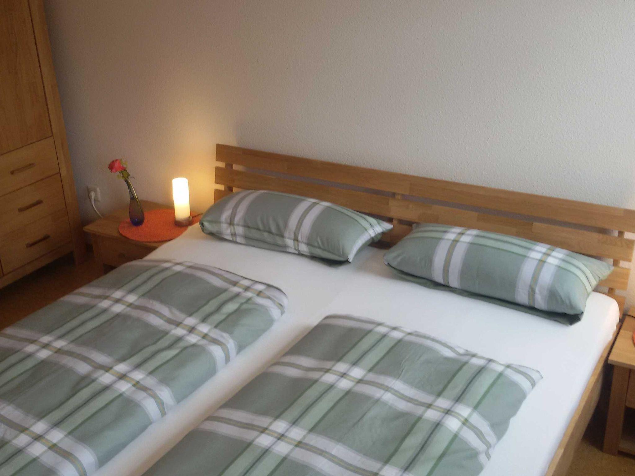Die helle lichtdurchflutete 90 qm große Ferienwohnung ist liebevoll und zweckmäßig eingerichtet und befindet sich im Erdgeschoss eines Zweifamilienwohnhauses Baujahr 1995. Sie eignet sich gut für 4 Personen plus Kleinkind und verfügt über 2 getrennte Schlafzimmer (Betten 2,00 x 2,00m u. 1,80 x 2,00 m). Die Wohnräume sind mit gefliesten Böden, die Schlafräume mit Korkböden ausgeführt. Im Außenbereich befindet sich ein kleiner Freisitz. PKW Stellplatz verfügbar.