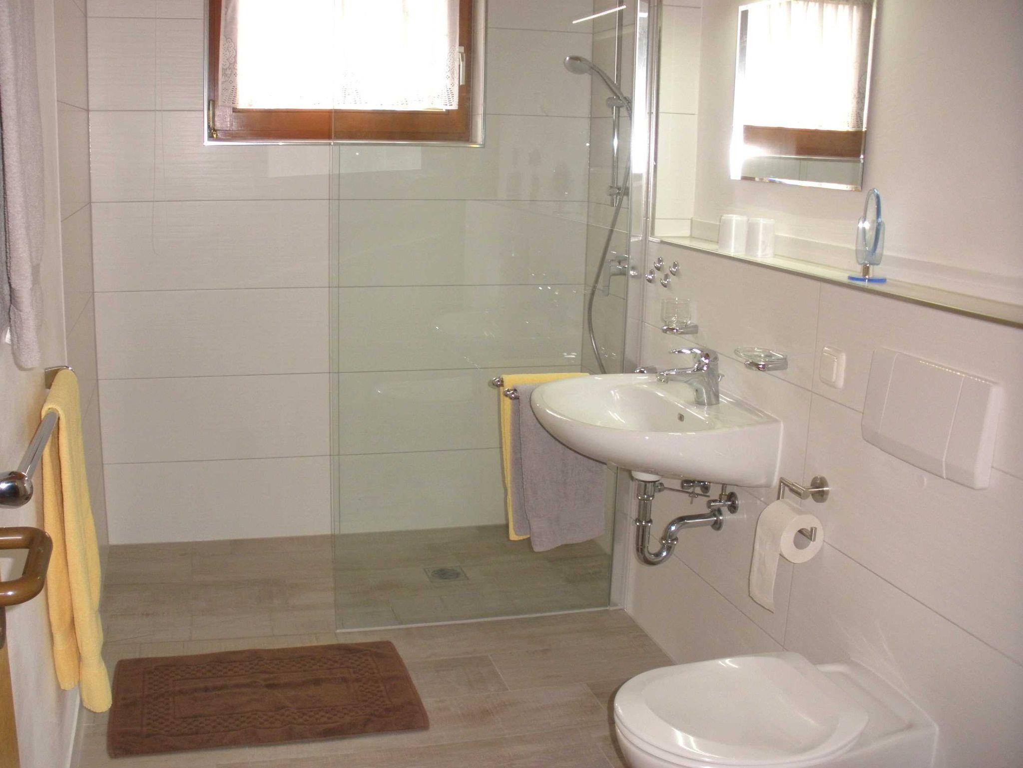 • Küche mit Essplatz, Badezimmer mit Walk-In-Dusche und WC, Abstellraum