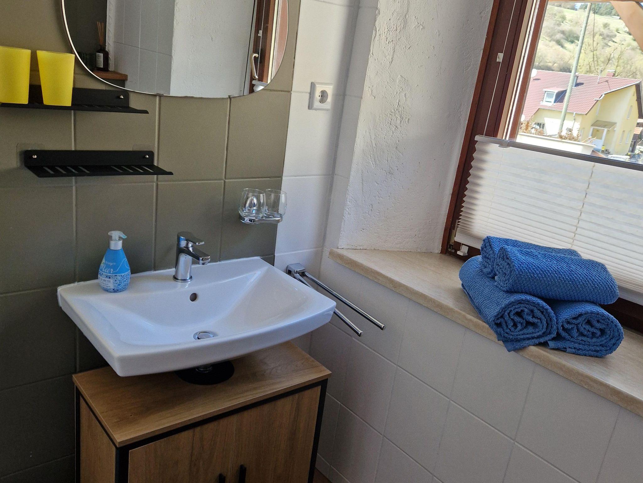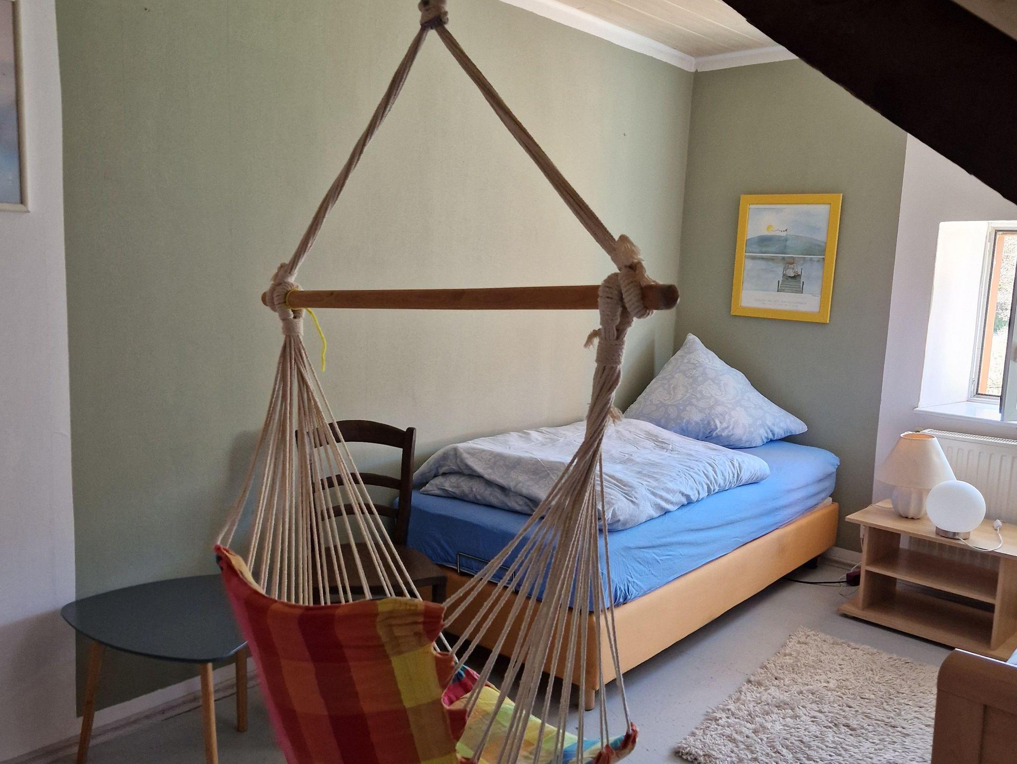 Diese Ferienwohnung verfügt über 2 Schlafzimmer, eins mit einem Doppelbett (1,60m) und eins mit 2 Einzelbetten, welches über einen außen liegenden Flur zu erreichen ist, sowie ein Kinderreisebett, eine Küche mit einem Geschirrspüler. Im Wohnbereich befindet sich ein Flachbild-TV, ein Sitzbereich und das Bad hat eine Dusche und Fussbodenheizung. Waschmachine ist auch vorhanden und kann kostenlos genutzt werden. Bei schönem Wetter kann man im Freien sitzen und grillen. WLAN ist kostenlos, jedoch in unserer ländlichen Region noch nicht wünschenswert ausgebaut. Maximal 2 Hunde sind erlaubt.