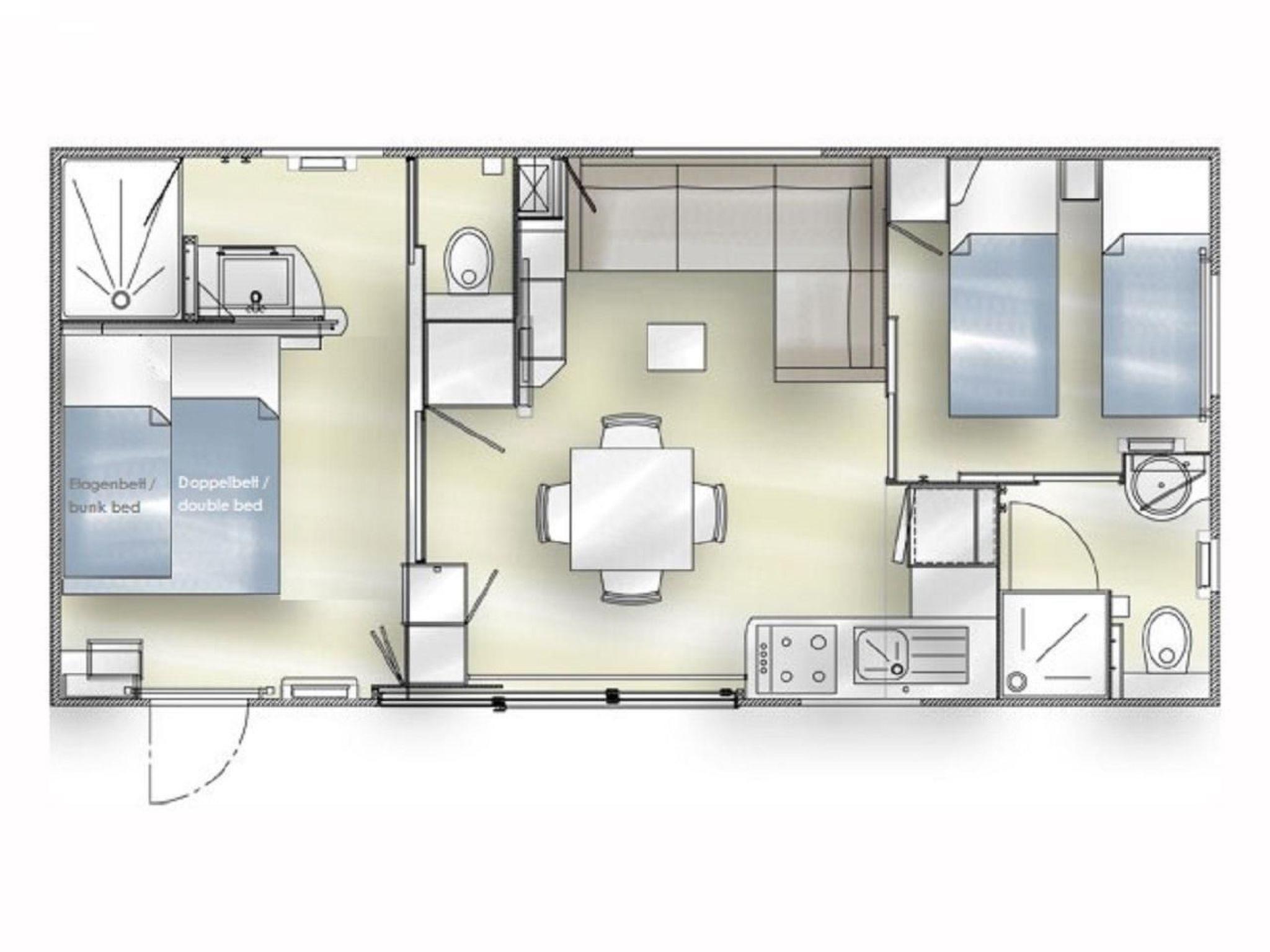 Welcome to our mobile holiday apartment of Wackersdorf. You will have two bedrooms and a big living area with a sofa bed. It is perfect for four five or six people. This mobile home has a smart room layout of 40 m² and offers everything you need for a relaxing stay. In the kitchen you will find all electrical appliances to include a dishwasher, fridge, freezer, coffee maker and much more.