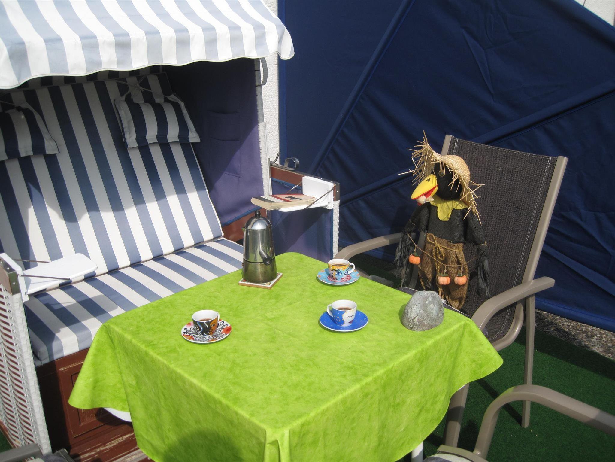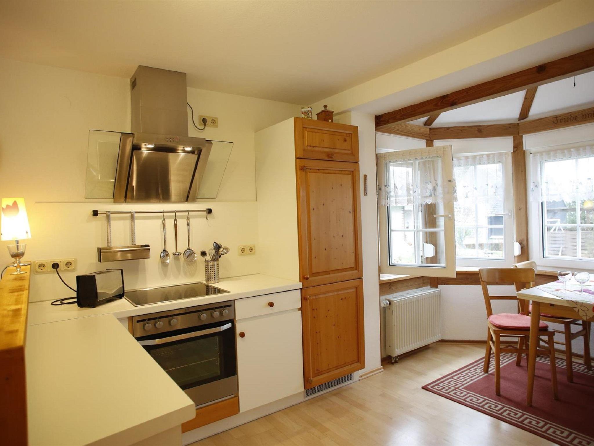 Einbauküche mit Spülmaschine, Mikrowelle, Backofen mit Ceranfeld, Kühlschrank, Toaster, Senseo und Kaffeemaschine, Geschirr für 4 Personen.