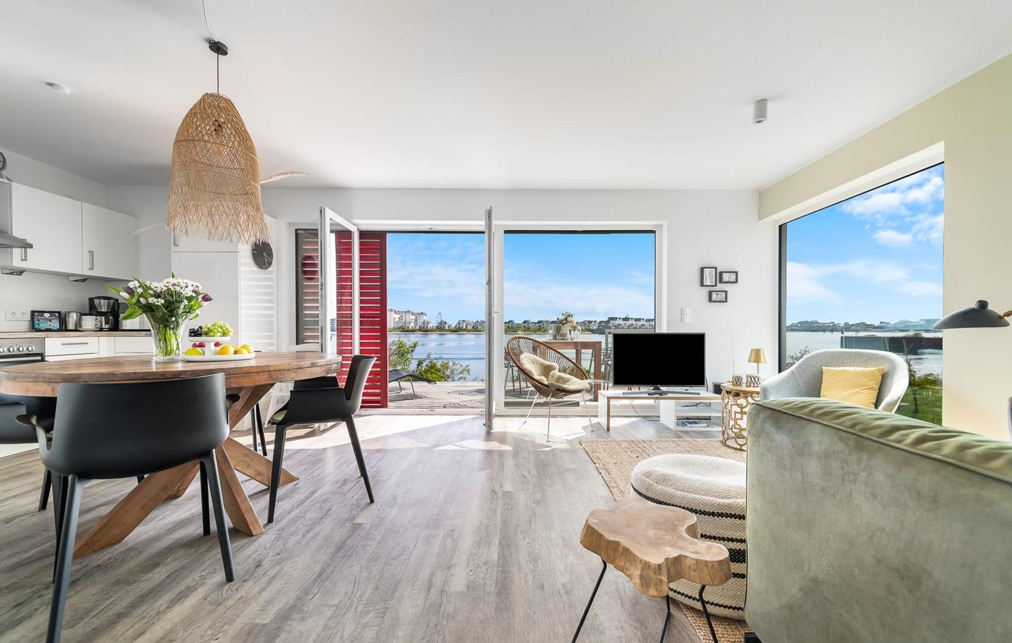 Fra oppholdsrommet og den tilstøtende terrassen har du en fantastisk utsikt over marinaen. Havnekinoen sørger for underholdning under en hyggelig grillkveld eller en romantisk middag med levende lys.