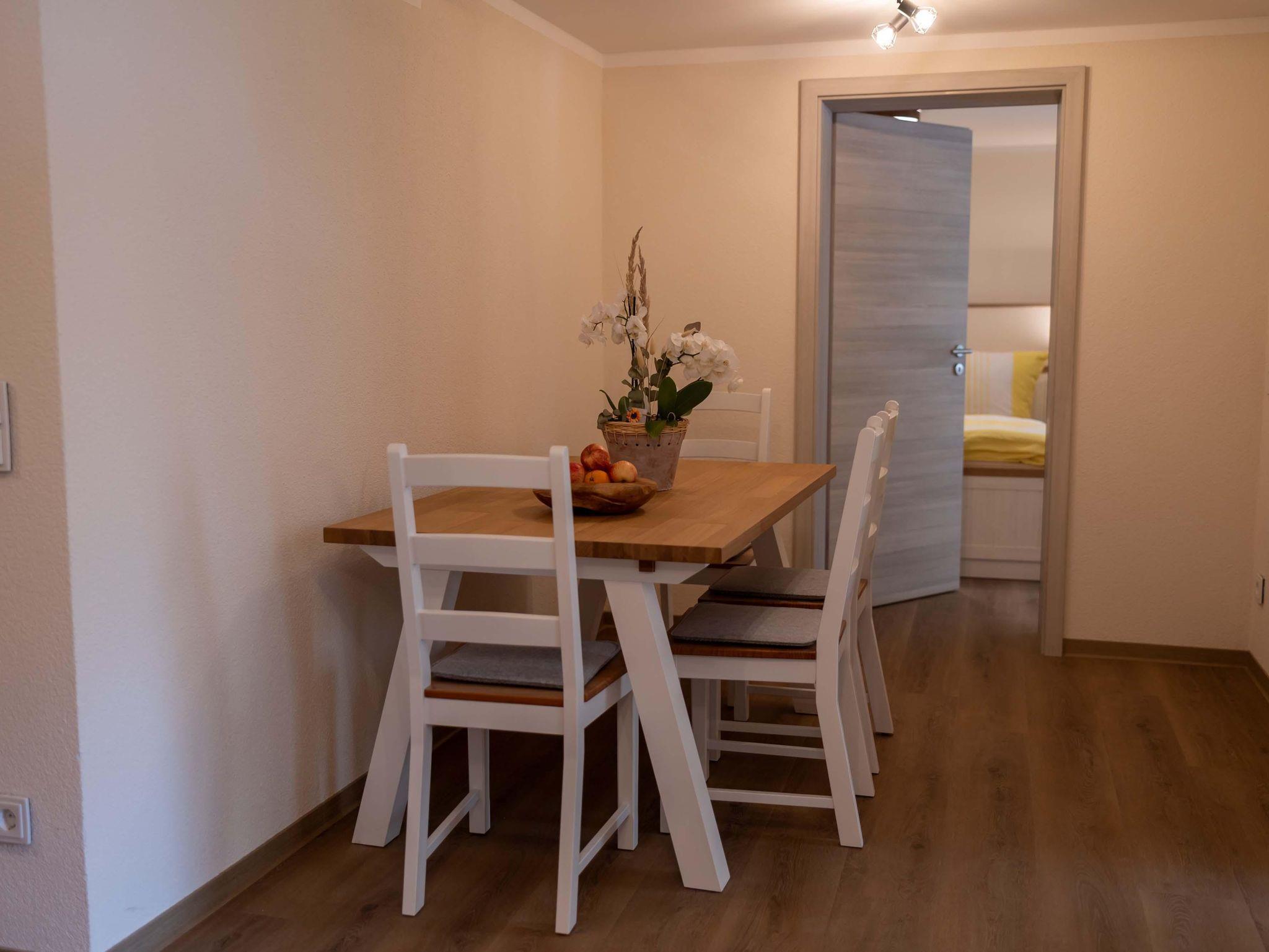Dieses einladende Apartment ist ideal für bis zu 4 Personen. Es verfügt über eine geräumige Wohnküche, die komplett ausgestattet ist mit Geschirrspüler, 4-Zellen-Herd, Mikrowelle, Kaffeemaschine, Wasserkocher, Toaster, Kühlschrank (ohne Gefrierzelle) und allem notwendigen Kücheninventar. Ein bequemer Esstisch mit vier Stühlen lädt zu gemeinsamen Mahlzeiten ein. Im selben offenen Bereich finden Sie ein gemütliches Sofa, einen Couchtisch und ein TV-Gerät für entspannte Abende.