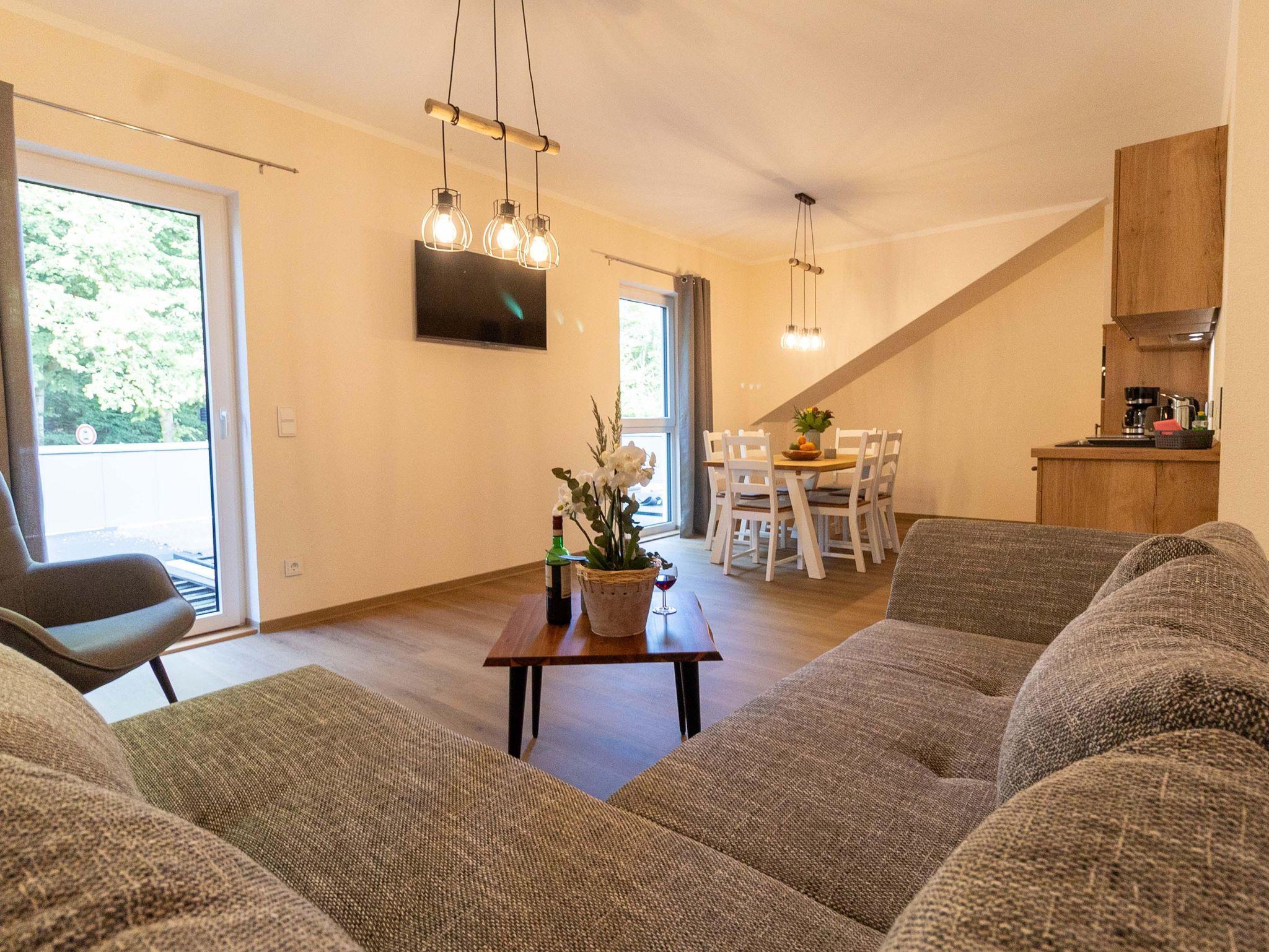 Diese großzügige Ferienwohnung bietet viel Platz für bis zu 6 Personen und ist damit ideal für größere Familien oder Gruppen. Im Herzen der Wohnung liegt die komplett ausgestattete Wohnküche mit Geschirrspüler, 4-Zellen-Herd, Mikrowelle, Kaffeemaschine, Kühleschrank (ohne Gefrierzelle), Wasserkocher, Toaster und allem nötigen Kücheninventar. Ein großer Esstisch mit sechs Stühlen lädt zu gemeinsamen Mahlzeiten und geselligen Abenden ein. Im selben Raum befinden sich ein gemütliches Sofa, ein Couchtisch und ein TV-Gerät für entspannte Stunden.
