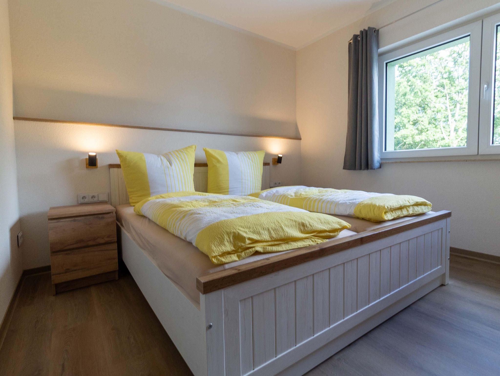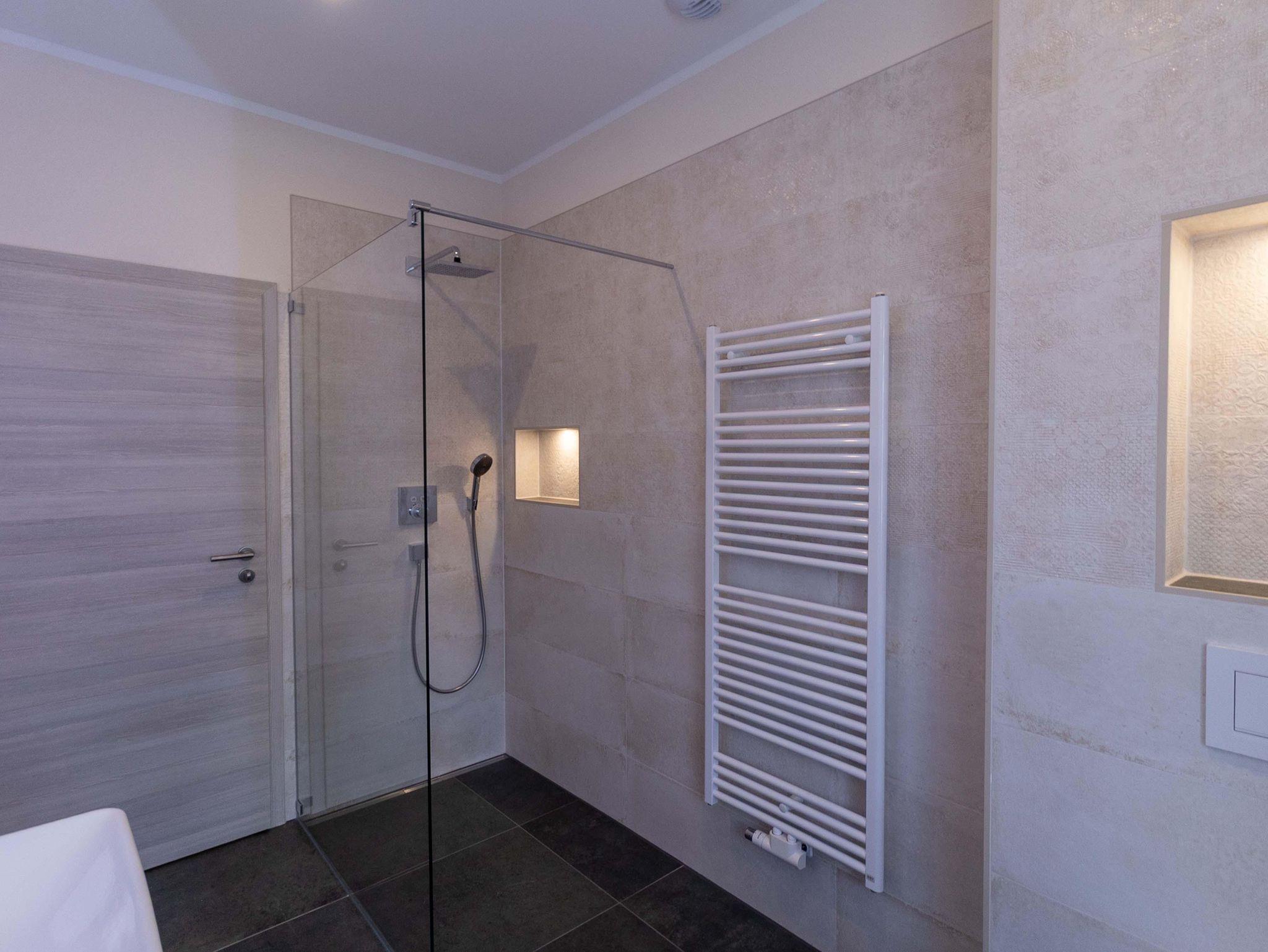 Die Wohnung verfügt über drei separate Schlafzimmer: ein Elternschlafzimmer mit einem komfortablen Doppelbett und zwei weitere Schlafzimmer mit je zwei Einzelbetten, die flexible Schlafmöglichkeiten bieten. Ein Kleiderschrank ist vorhanden, um Ihre persönlichen Dinge zu verstauen. Das Tageslicht-Badezimmer ist mit einer Dusche, WC und Waschbecken ausgestattet.
