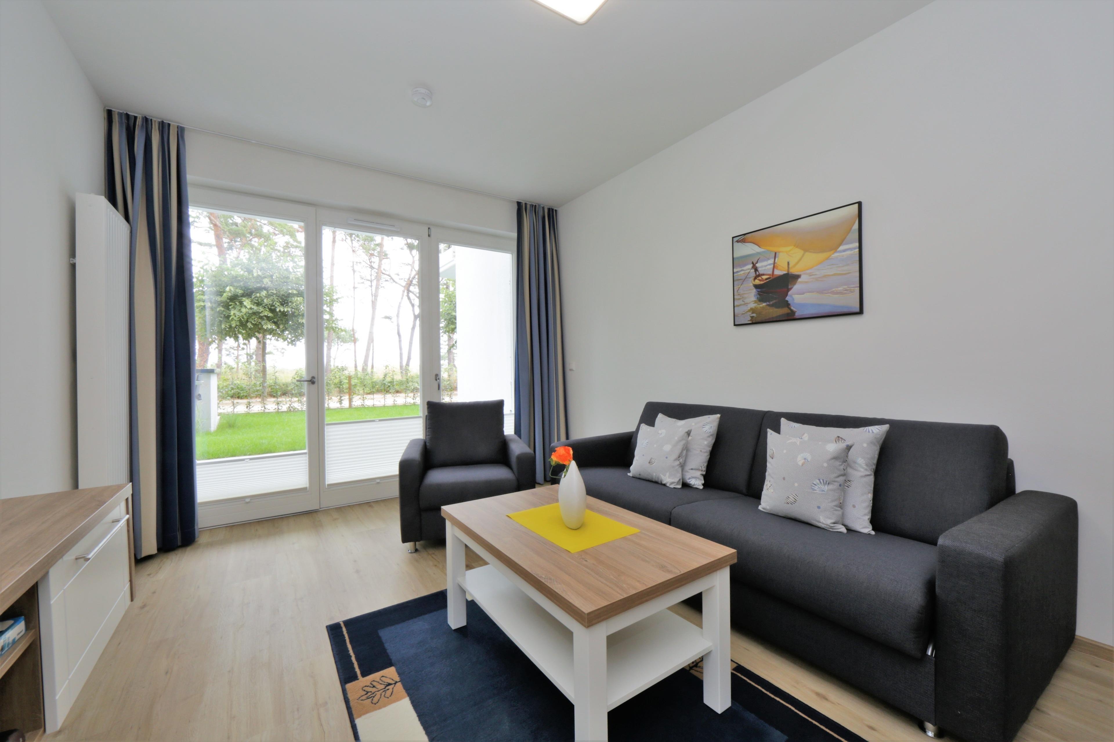 Diese hochwertige 2-Zimmer Wohnung ist 59 qm groß und liegt im Erdgeschoss. Sie bietet maximal 4 Personen Platz für einen erholsamen Ostseeaufenthalt direkt am Meer. Der liebevoll eingerichtete Wohnraum verfügt über ein gemütliches Sofa mit Schlaffunktion (Liegefläche 160 x 200), Couchtisch und Flat TV. Der Essplatz und die Küchenzeile incl. Geschirrspüler, Ceranfeld, Backofen, Mikrowelle, Kühlschrank etc. sind ebenfalls offen im Wohnraum integriert. Auf der überdachten Terrasse zur Seeseite genießen Sie ihr Frühstück schon im Freien und haben die Promenade im Blick. Die Düne versperrt Ihnen den Blick auf die Ostsee jedoch nicht das Rauschen. Das Schlafzimmer ist mit einem komfortablen Doppelbett mit getrennten Matratzen (90 x 200) und ausreichend Schrankraum eingerichtet. Das großzügige, moderne Bad ist mit einer ebenerdigen Dusche und Waschtisch/WC ausgestattet.
