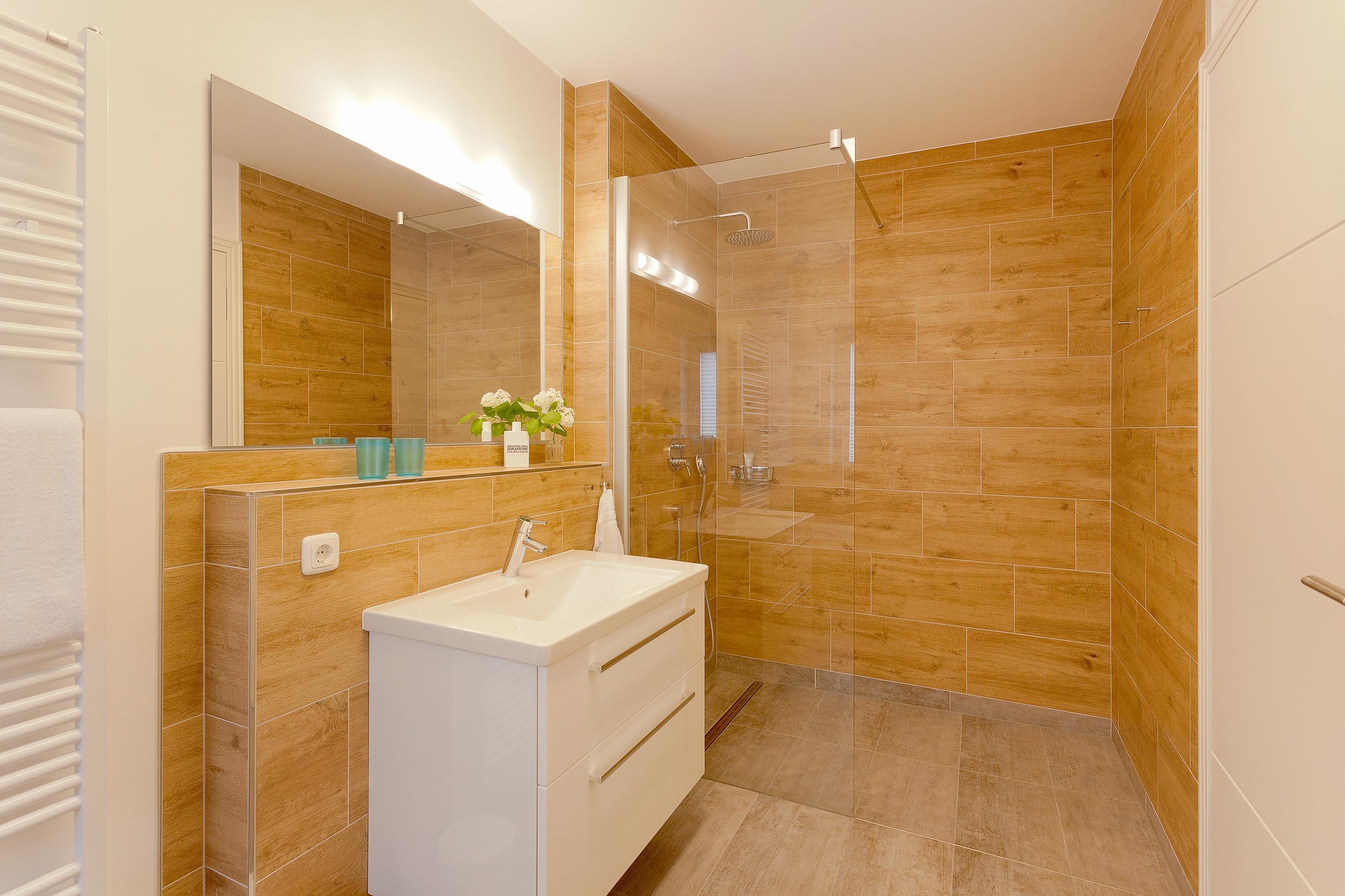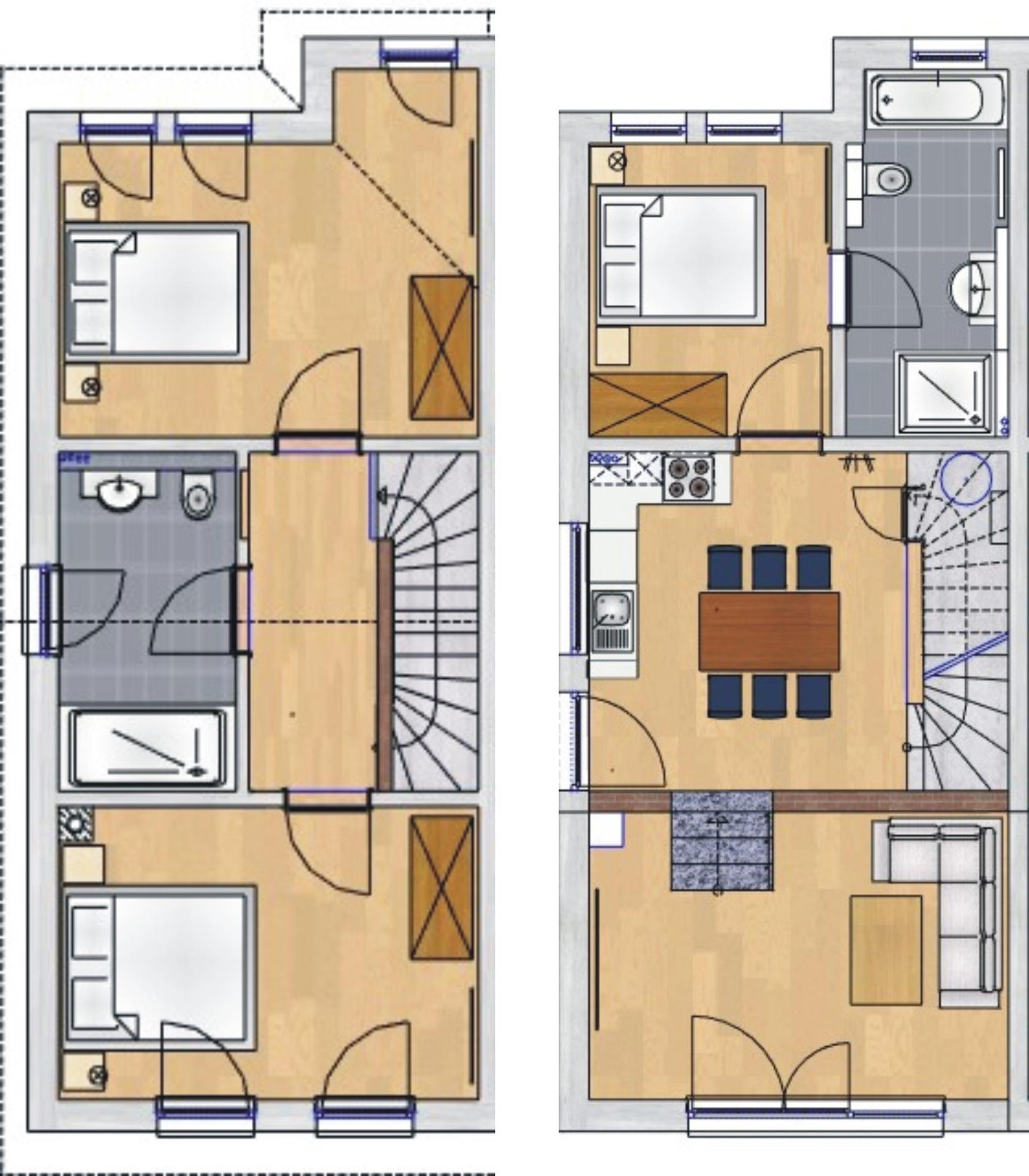 Diese moderne hochwertige 4-Zimmer Haushälfte erstreckt sich mit ihren 98 qm und ihren 4 Zimmern über zwei Ebenen. Alle Räume sind geschmackvoll und mit viel Liebe zum Detail gestaltet. Maximal 6 Personen können hier mit viel Komfort erholsame Ferien verleben. Im Erdgeschoss lädt die Wohnküche zum Kochen und zu gemeinsamen Mahlzeiten ein. Die moderne Küche ist mit Geschirrspüler, Cerankochfeld, Backofen, Kühlschrank etc. ausgestattet. Am angrenzenden bequemen Essplatz werden Sie gerne länger verweilen. Über ein paar Stufen abwärts erreichen Sie den offenen Wohnraum mit großem Ecksofa, Couchtisch und Flat TV. Von hier aus gelangen Sie auf die möblierte Terrasse, die südlich ausgerichtet ist und viel Sonne verspricht.