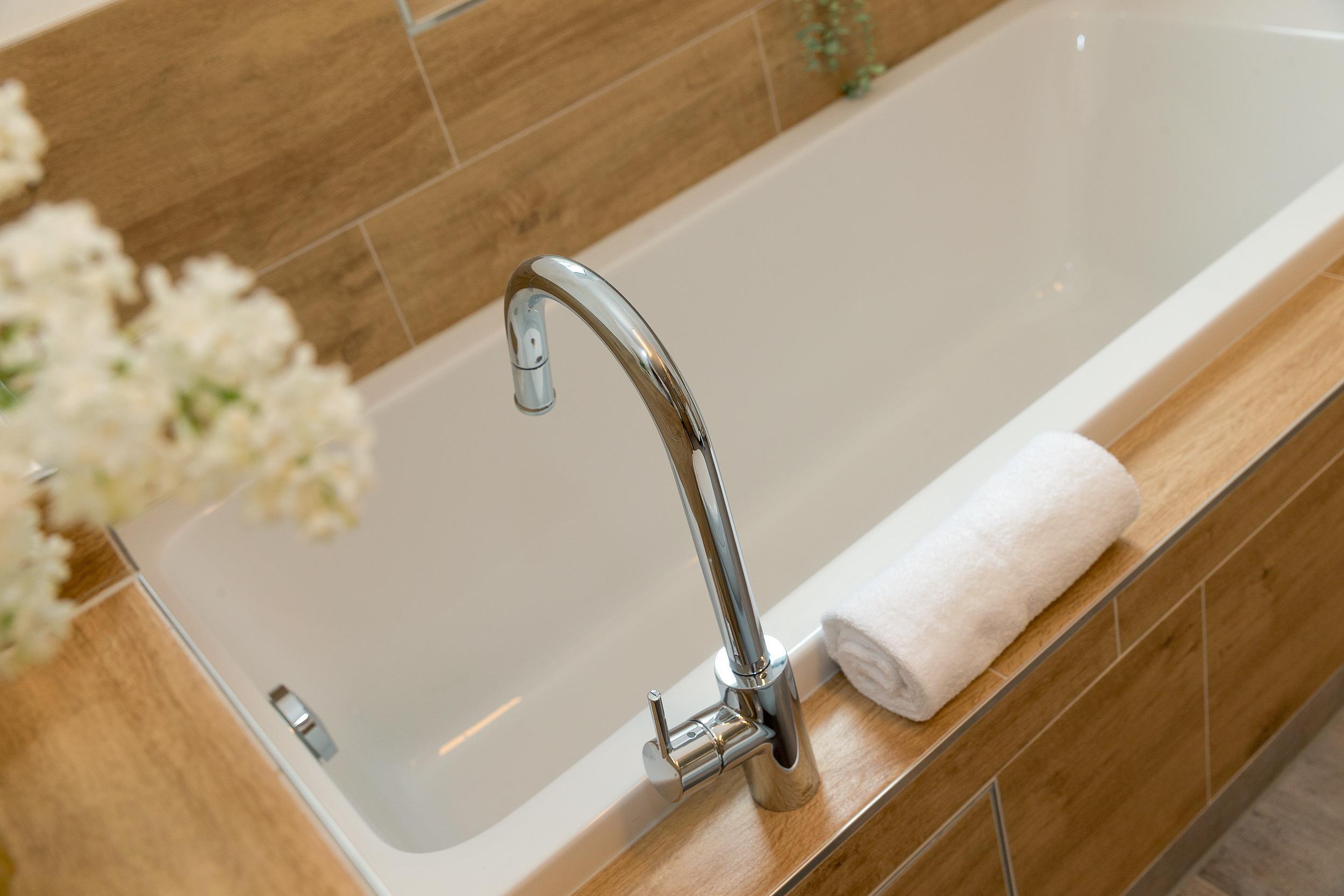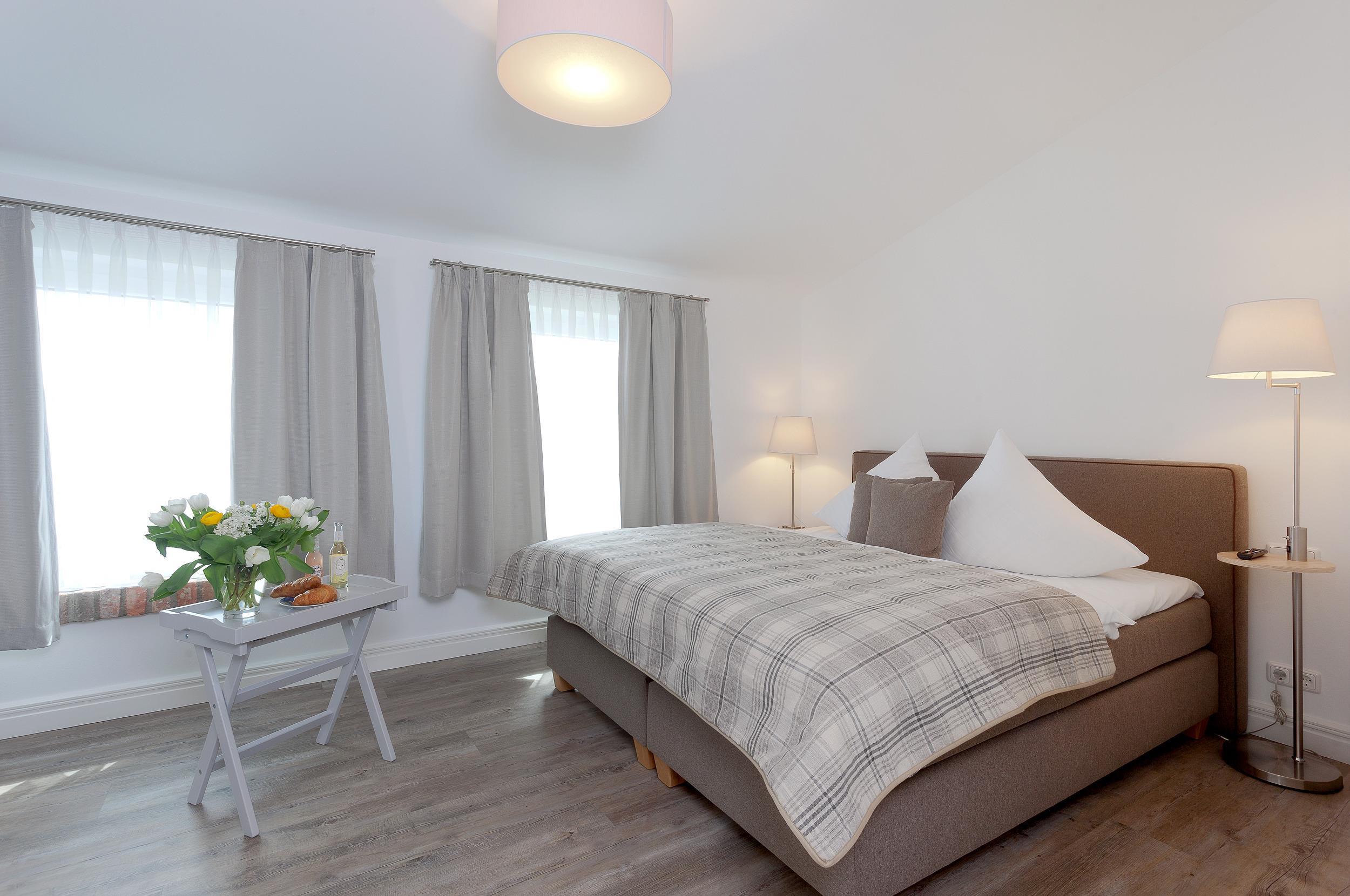 Ebenfalls im Erdgeschoss befindet sich ein Schlafzimmer mit Bad en suite. Das Boxspringbett mit getrennten Matratzen (160 x 200) sowie die Möglichkeit der Verdunklung sorgen für erholsamen Schlaf. Ausreichend Schrankraum ist vorhanden. Das großzügige Bad mit Fenster bietet Ihnen sowohl Badewanne als auch Dusche und Waschtisch/WC.