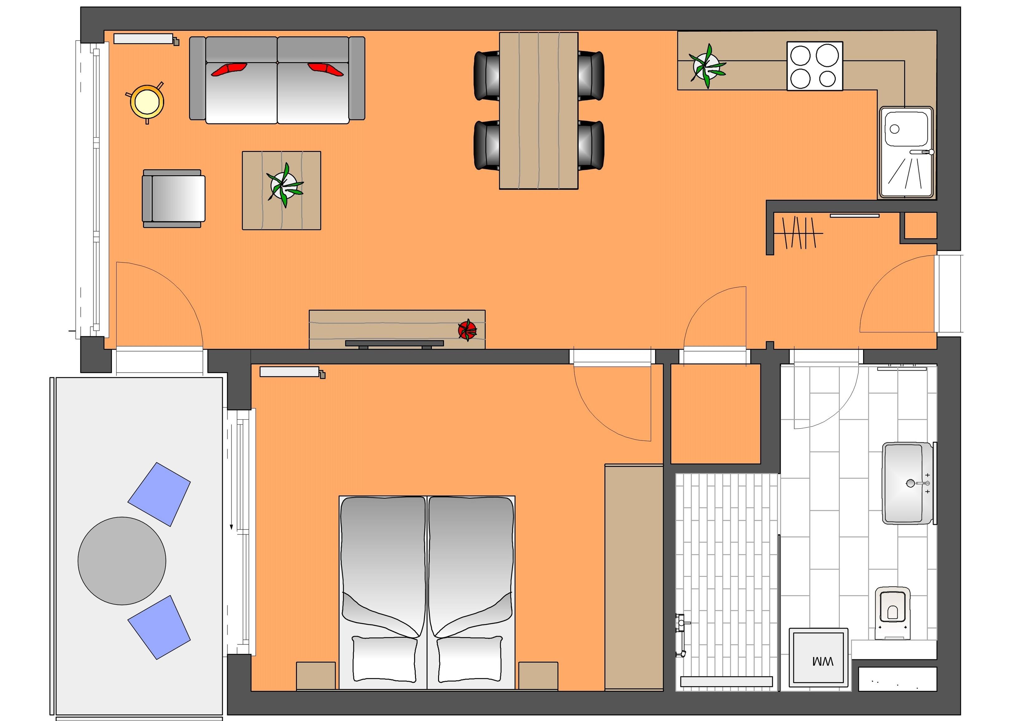Die moderne, liebevoll eingerichtete 2-Zimmer Ferienwohnung mit 52 m² Wohnfläche befindet sich im 1. Obergeschoss der Strandresidenz. Die überdachte Terrasse zur Promenade mit traumhaftem Seeblick lockt die Gäste schon zum Frühstück ins Freie. Die Wohnung ist individuell und komfortabel ausgestattet und bietet 2-4 Personen Platz für einen erholsamen Urlaub am Meer. Der offene Wohnraum bietet Ihnen eine gemütliche Sitzecke mit einem bequemen Sofa (Liegefläche 160 x 200), einen Sessel und Flat TV. Die Küchenzeile incl. Backofen, Ceranfeld, Kühlschrank, Geschirrspüler, Mikrowelle etc. sowie der Essplatz sind offen im Wohnraum integriert. Das geräumige Schlafzimmer ist mit einem Doppelbett mit getrennten Matratzen (90 x 200) und einem großen Kleiderschrank eingerichtet. Aus beiden Zimmern genießen Sie den Seeblick aus erster Hand. Der Balkon lässt sich sowohl vom Wohn- als auch vom Schlafzimmer betreten. Das großzügige, moderne Bad ist mit einer ebenerdigen Dusche und Waschtisch/WC ausgestattet.