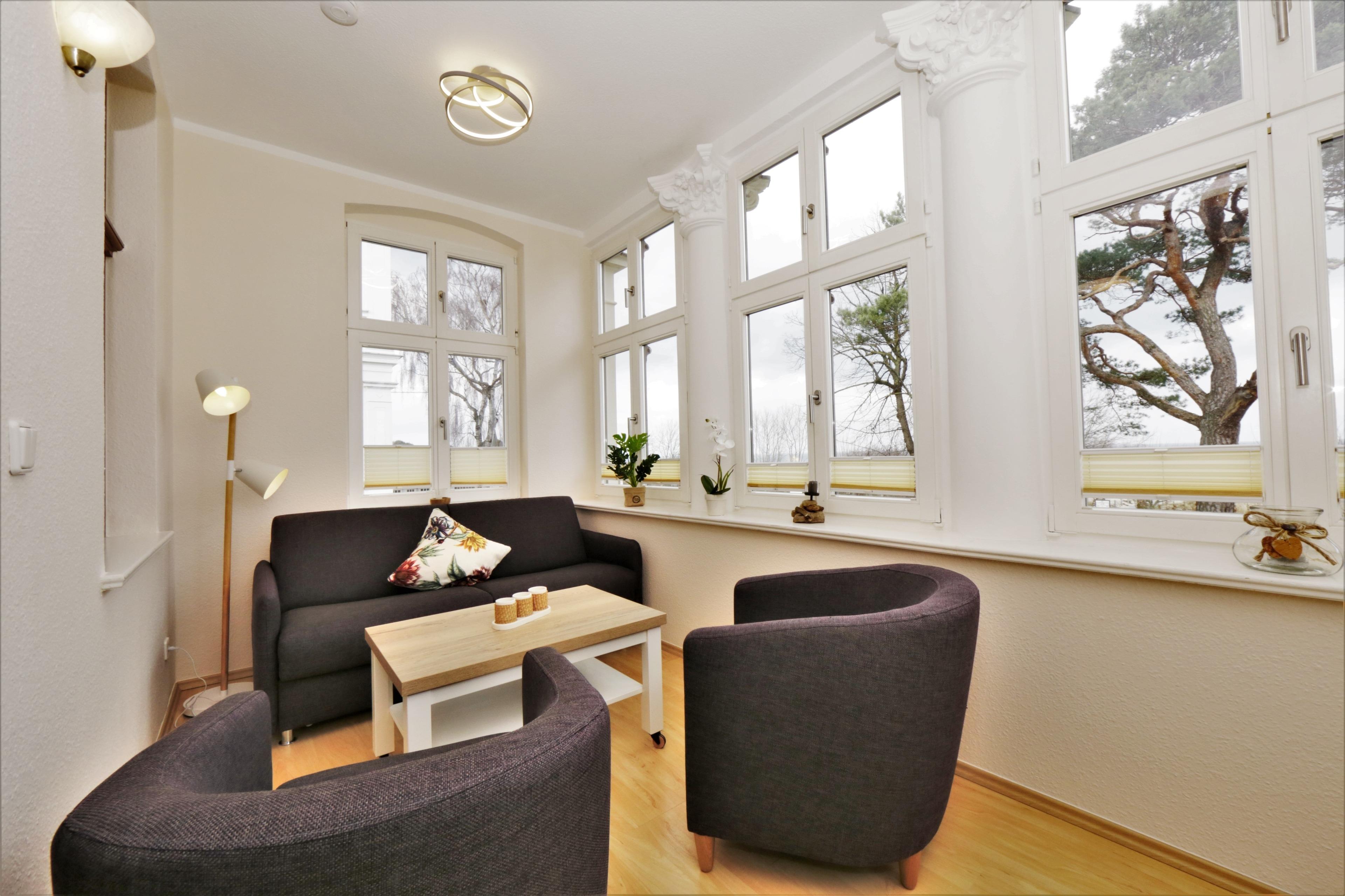Dieses 46 qm große 1 Zimmer Appartement im 1. Obergeschoss eignet sich für 2 Personen plus Kind. Der kombinierte Wohn-/Schlafraum ist mit einem Doppelbett mit getrennten Matratzen (90 x 200), einem Kleiderschrank und zwei Sesseln möbliert. Flat TV und Musikanlage sind selbstverständlich. Die mit einem Sofa mit Schlaffunktion (Matratze 140 x 200) und zwei weiteren Sesseln eingerichtete angrenzende Loggia bietet den Gästen einen uneingeschränkten Blick auf die Ostsee und die Promenade. Die separate helle Küche ist mit einer Einbauküche mit Geschirrspüler, Cerankochfeld mit Backofen, Kühlschrank etc. und einem Essplatz ausgestattet. Von hier aus können Sie den Balkon betreten. Mit seiner nordöstlichen Ausrichtung genießen Sie hier denselben schönen Blick wie aus der Loggia. Das Badezimmer bietet den Gästen Waschtisch/WC sowie Dusche. Ein Pkw-Stellplatz befindet sich auf dem Grundstück und ist der Wohnung zugeordnet.