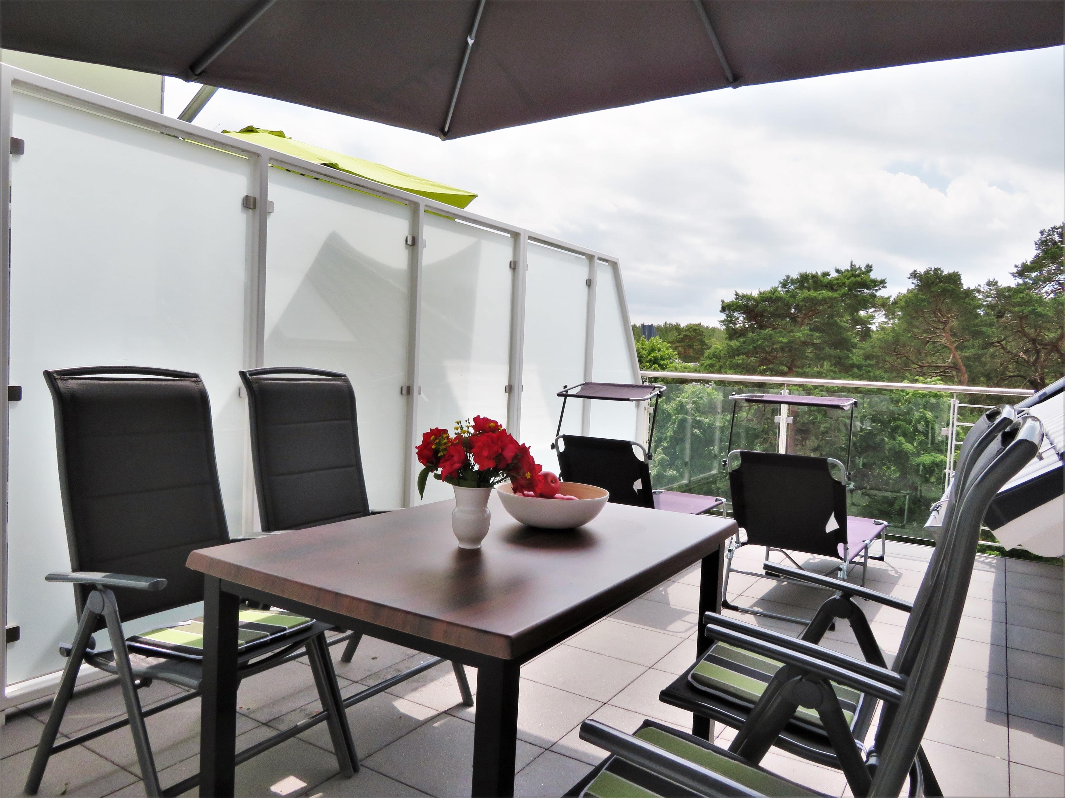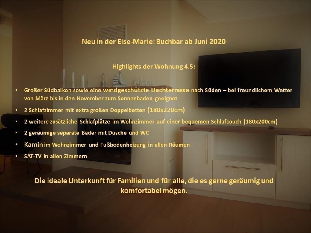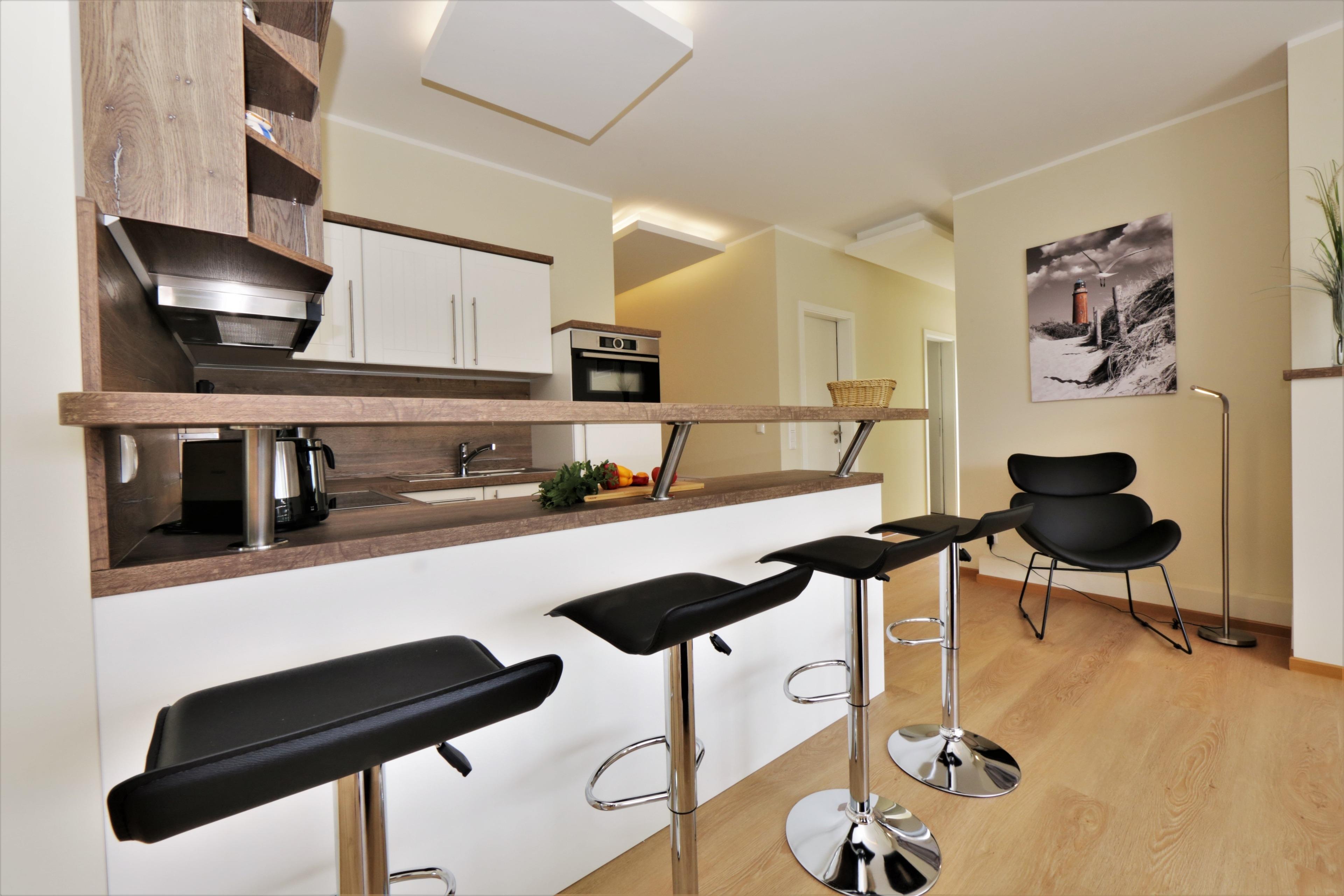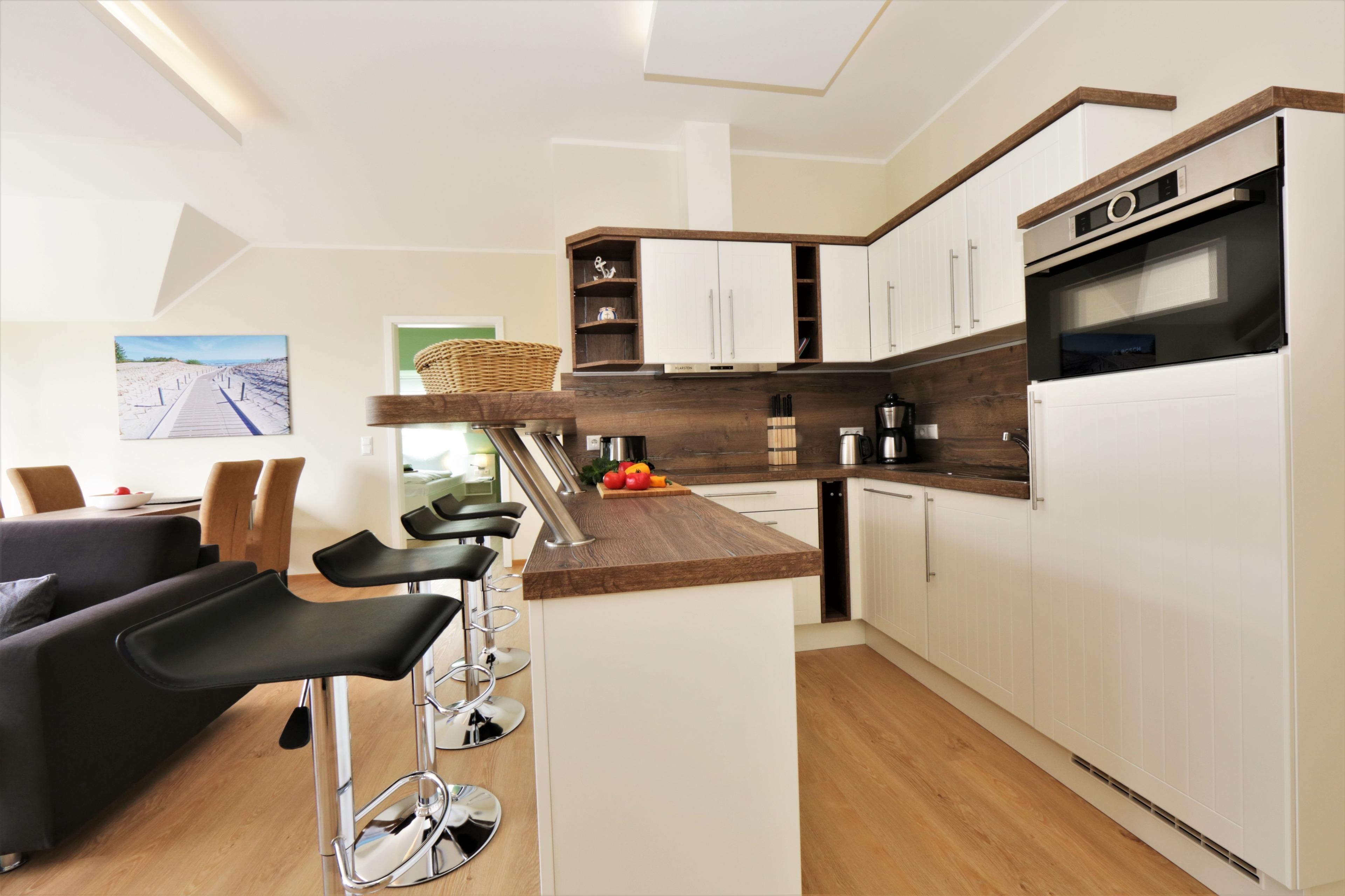 Dieses mit 90 qm sehr großzügige 3-Zimmer Appartement befindet sich im Dachgeschoss der 2018 neu erbauten Strandresidenz und bietet 4-6 Personen reichlich Komfort und ist selbstverständlich per Fahrstuhl zu erreichen. Genießen Sie Ihren Urlaub direkt am Meer in dieser hochwertig und sehr geschmackvoll eingerichteten Wohnung. Im Wohnbereich mit großer Fensterfront erwartet Sie eine bequeme Polstergarnitur bestehend aus Sofa und Sessel, ein Couchtisch und Flat TV sowie ein Esstisch für gemeinsame Mahlzeiten. Ein Kamin (gasbetrieben) sorgt für Gemütlichkeit und zusätzliche Wärme bei Bedarf. Die moderne offene Küche mit Tresen und Barhockern ist mit Cerankochfeld, Backofen mit integrierter Mikrowelle, Geschirrspüler, Kühlschrank, Kaffeemaschine etc. ausgestattet. Beide Schlafzimmer verfügen jeweils über ein extra großes komfortables Doppelbett mit getrennten Matratzen (90 x 220), reichlich Schrankraum sowie einen eigenen TV. Aus einem der beiden Schlafzimmer können Sie einen Blick auf die Ostsee genießen. Den großen Balkon in Süd-West-Ausrichtung betreten Sie vom Wohnraum. Auf der windgeschützten Dachterrasse (ebenfalls Süd-West-Ausrichtung) können Sie bei entsprechendem Wetter sommerliche Sonnentage bereits ab März bis in den November hinein genießen. Sitzgelegenheiten und Sonnenliegen sind vorhanden. Beide Badezimmer sind mit einer bodengleichen Dusche mit Echtglasabtrennung und Waschtisch/WC ausgestattet. Zur Ausstattung gehören jeweils ein Fön und Fußbodenheizung.