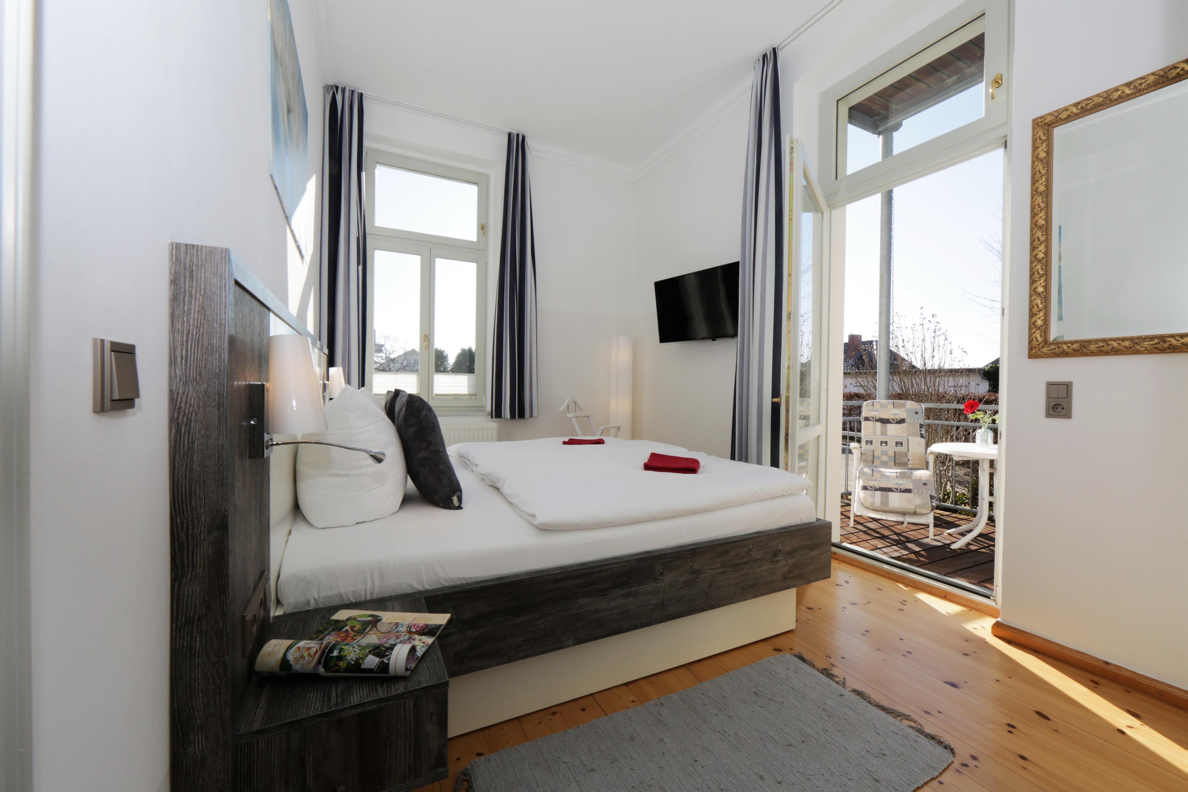 Die Wohnung 1 erreichen Sie über einen eigenen separaten Eingang links vom Haupteingang. Durch die Loggia, die mit einer kleinen Sitzgruppe und der Garderobe eingerichtet ist, betreten Sie die Wohnung. Die mit ihren 64 qm großzügige 2-Zimmer Wohnung liegt im Erdgeschoss und bietet 3-4 Personen ausreichend Platz für einen komfortablen Ostseeurlaub. Das Wohnzimmer bietet den Gästen eine gemütliche Eckcouch (Liegefläche 140 x 200) mit Flat TV sowie einem separaten Essplatz. Die halboffene Küche ist mit Ceranfeld, kleiner Spülmaschine, Kühlschrank mit Gefrierfach und Backofen mit integrierter Mikrowelle ausgestattet. Das helle Schlafzimmer in Richtung Garten ist mit einem Doppelbett mit getrennten Matratzen (90 x 200, durchgehender Topper), einem Kleiderschrank und einem zusätzlichen TV eingerichtet. Der sonnige Südbalkon, ebenfalls mit Blick in den Garten, verspricht gemütliche Erholungsstunden und ist über das Schlafzimmer zu betreten. Im großzügigen Bad mit Fenster steht den Gästen eine Dusche und Waschbecken/WC zur Verfügung.