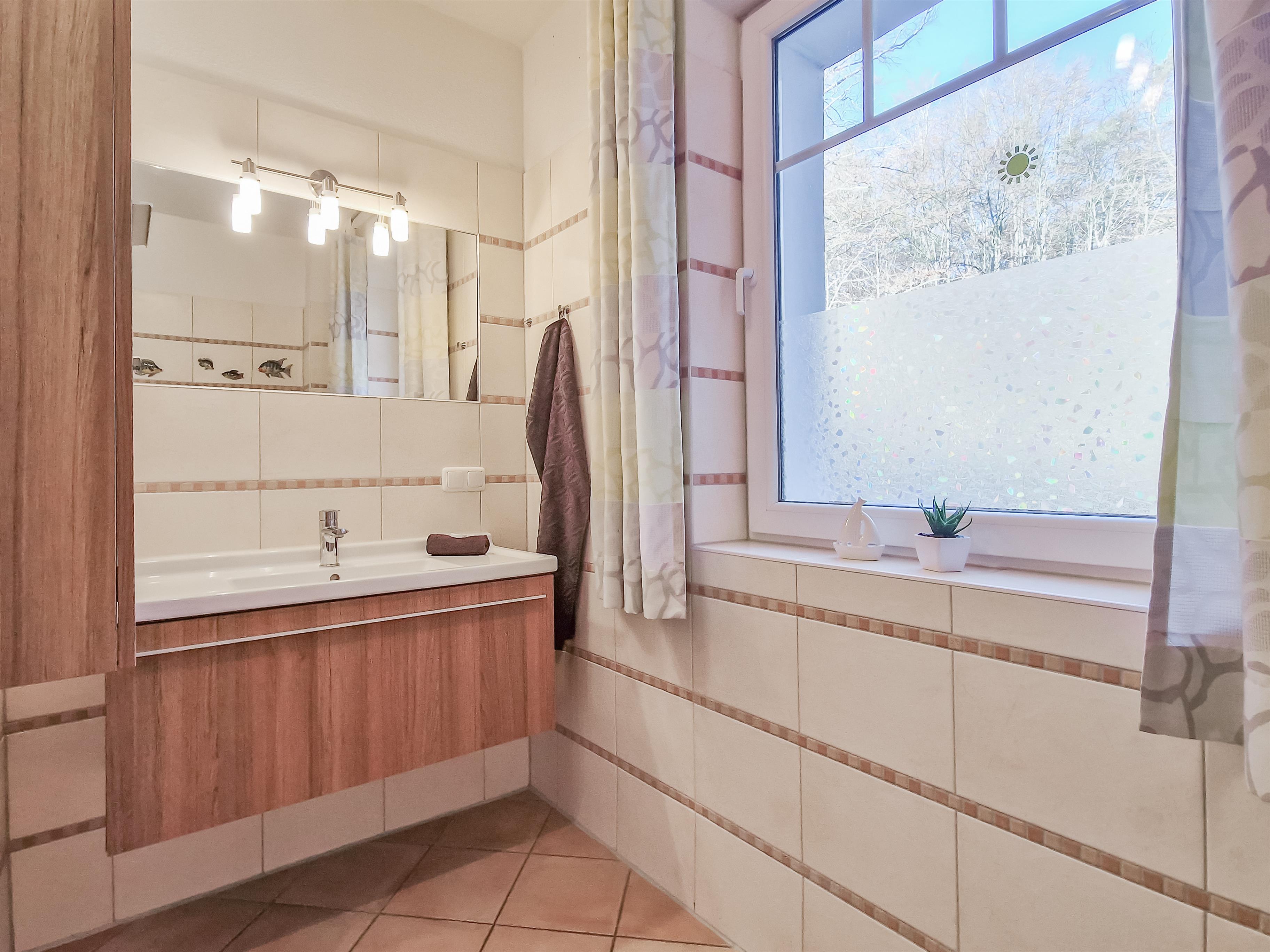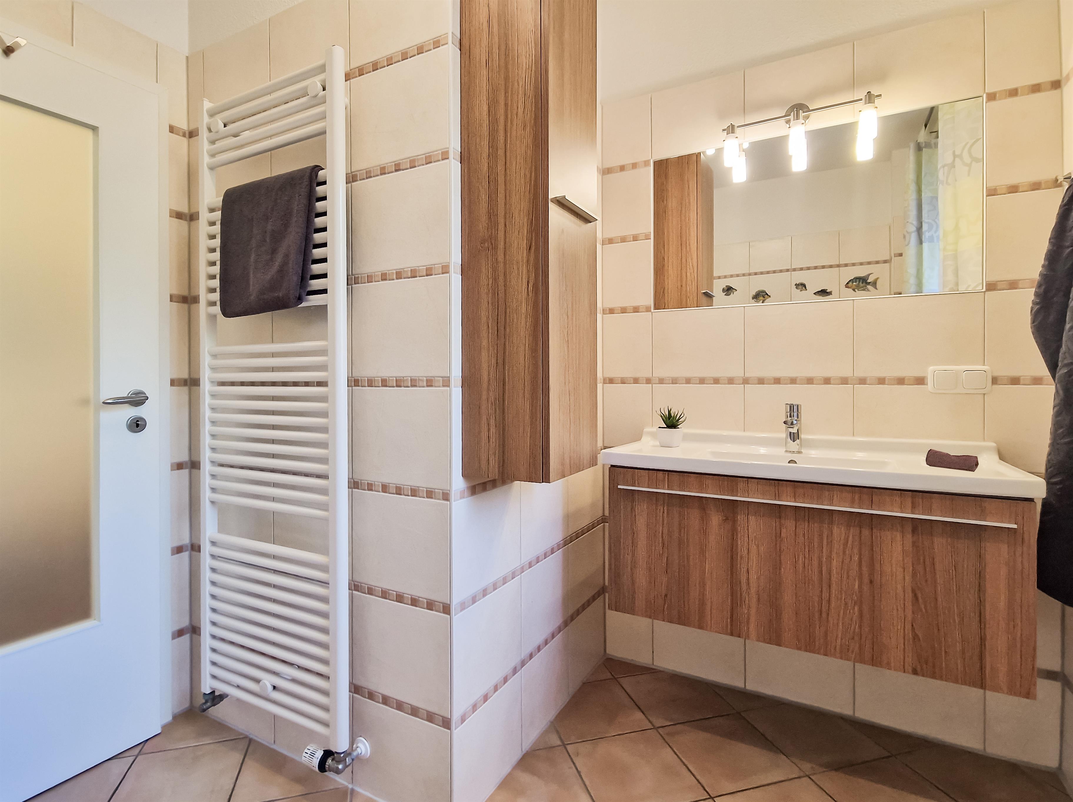 Diese gemütliche 51 qm große 2-Zimmer-Wohnung für 2-3 Personen befindet sich im Hochparterre und verfügt über einen großen Südbalkon, der die Gäste bereits zum Frühstück ins Freie lockt. Dem Balkon vorgelagert ist eine großzügige Terrasse mit Blick in den Garten, die zu jeder Tageszeit zum Relaxen einlädt. Im Wohnbereich finden Sie eine gemütliche Sitzecke mit Schlaffunktion (140 x 200) sowie einen großen Essplatz. Die im Wohnbereich integrierte Vollküche verfügt über Geschirrspüler, Cerankochfeld, Backofen, Kühlschrank etc. Das Schlafzimmer ist mit einem Doppelbett (getrennte Matratzen 90 x 200) und genügend Schrankraum eingerichtet. Im Bad mit Fenster steht den Gästen Dusche und Waschbecken/WC sowie eine Waschmaschine zur Verfügung. Der PKW-Stellplatz befindet sich auf dem Grundstück und ist der Wohnung zugeordnet.