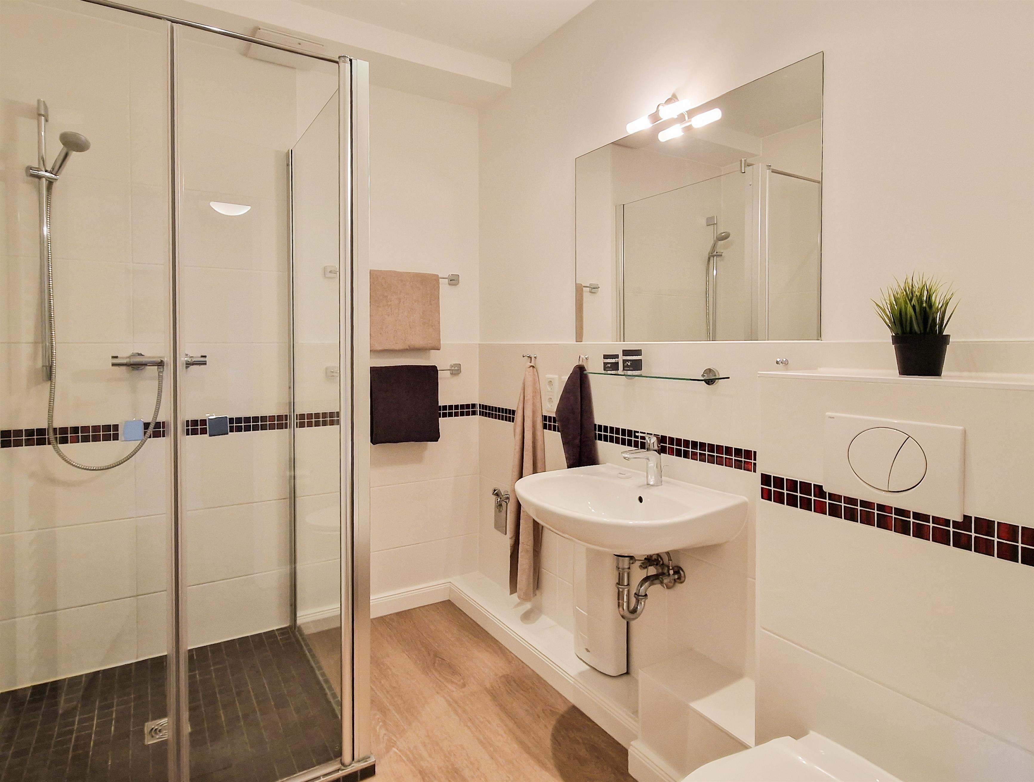 Die 77 qm große Nichtraucher-Ferienwohnung im Erdgeschoss bietet den Gästen viel Platz für einen erholsamen Urlaub. Die modern und komfortabel eingerichtete Wohnung verfügt über eine große möblierte Terrasse zum Süd-Osten mit Blick auf die Promenade. Im Wohnraum finden Sie eine gemütliche Sitzecke, TV mit integriertem Radio und einem Essplatz für 4 Personen. Die Terrasse wird vom Wohnzimmer begangen. Die geräumige, separate Küche ist voll ausgestattet mit Geschirrspüler, Cerankochfeld und Backofen. Beide Schlafzimmer sind mit einem Doppelbett mit getrennten Matratzen und ausreichend Schrankraum, das Bad ist mit einer Dusche ausgestattet.
