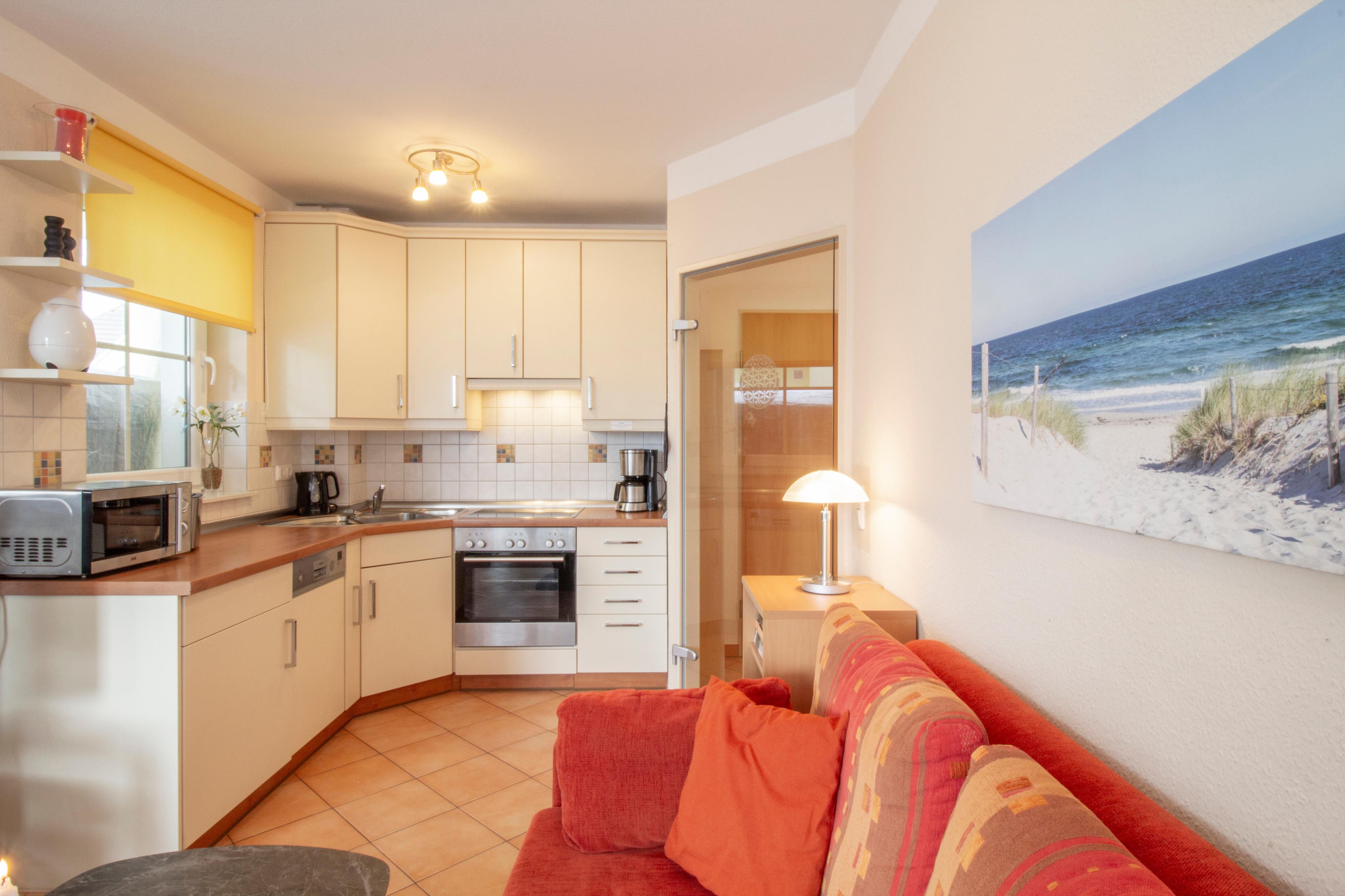 Der offene Wohnbereich lädt zu entspannten Stunden ein und geht nahtlos in eine voll ausgestattete Küche über. Hier können Sie nicht nur gemeinsame Mahlzeiten zubereiten, sondern auch gemütliche Abende mit Familie und Freunden verbringen. Die Küche ist zweckmäßig eingerichtet und mit den notwendigen Geräten ausgestattet. Der Balkon bietet einen herrlichen Ausblick auf die Ostsee. Genießen Sie hier die frische Meeresluft und den Blick auf das glitzernde Wasser und den Horizont. Es ist der ideale Ort, um die Seele baumeln zu lassen und die Natur in vollen Zügen zu genießen. Das Badezimmer der Wohnung verfügt über eine Dusche und ein WC. Zusätzlich steht ein Gäste-WC zur Verfügung, um den Komfort für sie zu erhöhen.