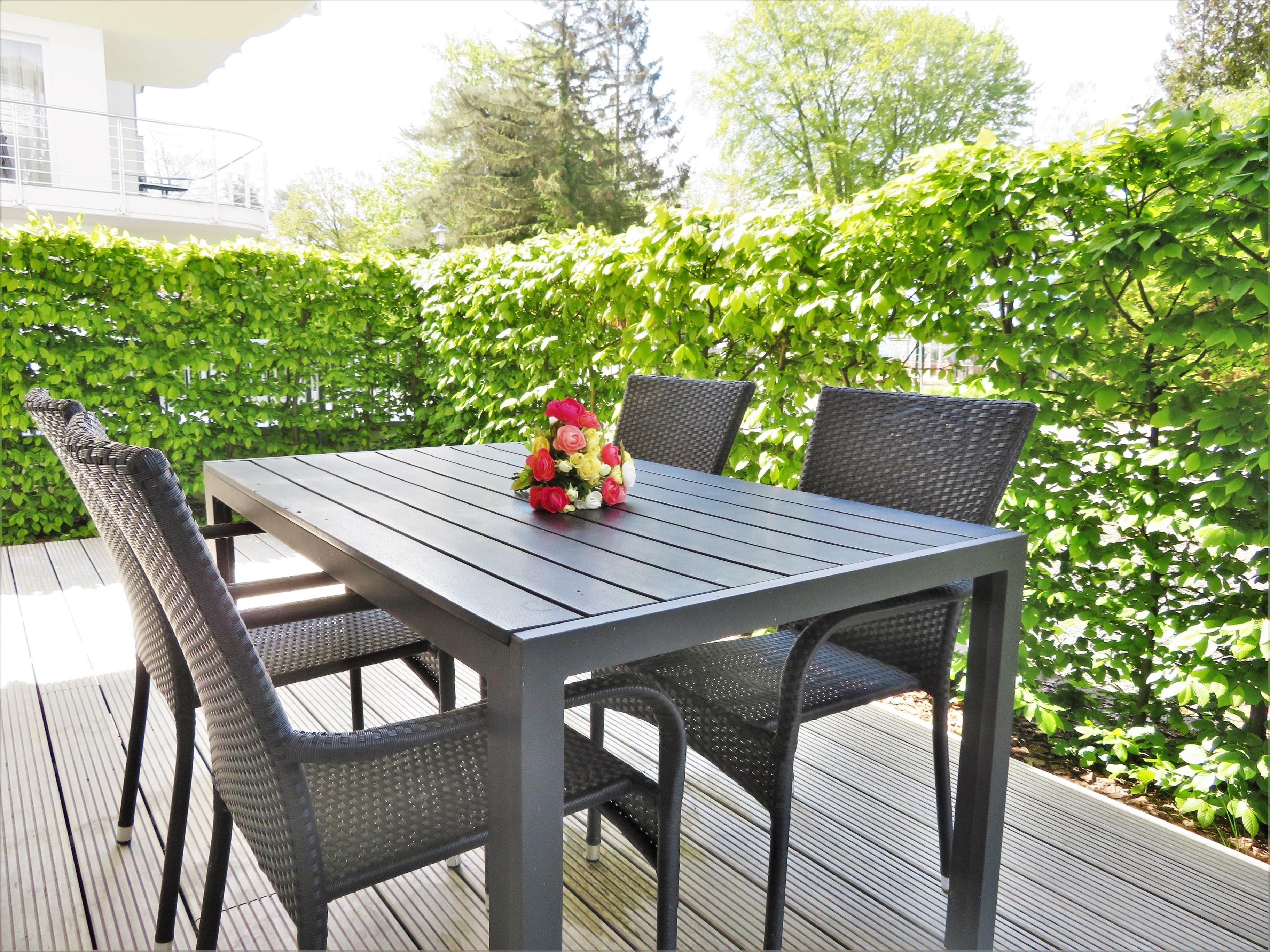 Dieses 51 m² große Zwei-Zimmer-Appartement im Erdgeschoss ist mit hochwertigen Echtholzmöbeln eingerichtet und verspricht 2-3 Personen einen erholsamen Ostseeaufenthalt. Der helle Wohnraum ist mit einer gemütlichen Sitzecke (mit Schlaffunktion 120 x 200), Couchtisch, Flat TV und einem separaten Essplatz eingerichtet. Eine im Wohnbereich integrierte Vollküche ist mit Geschirrspüler, Kühlschrank, Cerankochfeld, Backofen, Mikrowelle etc. ausgestattet. Die zum Süden ausgerichtete Terrasse kann über den Wohnraum betreten werden. Für erholsamen Schlaf sorgt im Schlafzimmer das komfortable Boxspringbett mit getrennten Matratzen (90 x 200), genügend Schrankraum ist vorhanden. Das Badezimmer bietet den Gästen eine Dusche mit Echtglasabtrennung sowie Waschbecken/WC. Der Pkw-Stellplatz (Außenstellplatz) befindet sich auf dem Grundstück und ist der Wohnung zugeordnet.