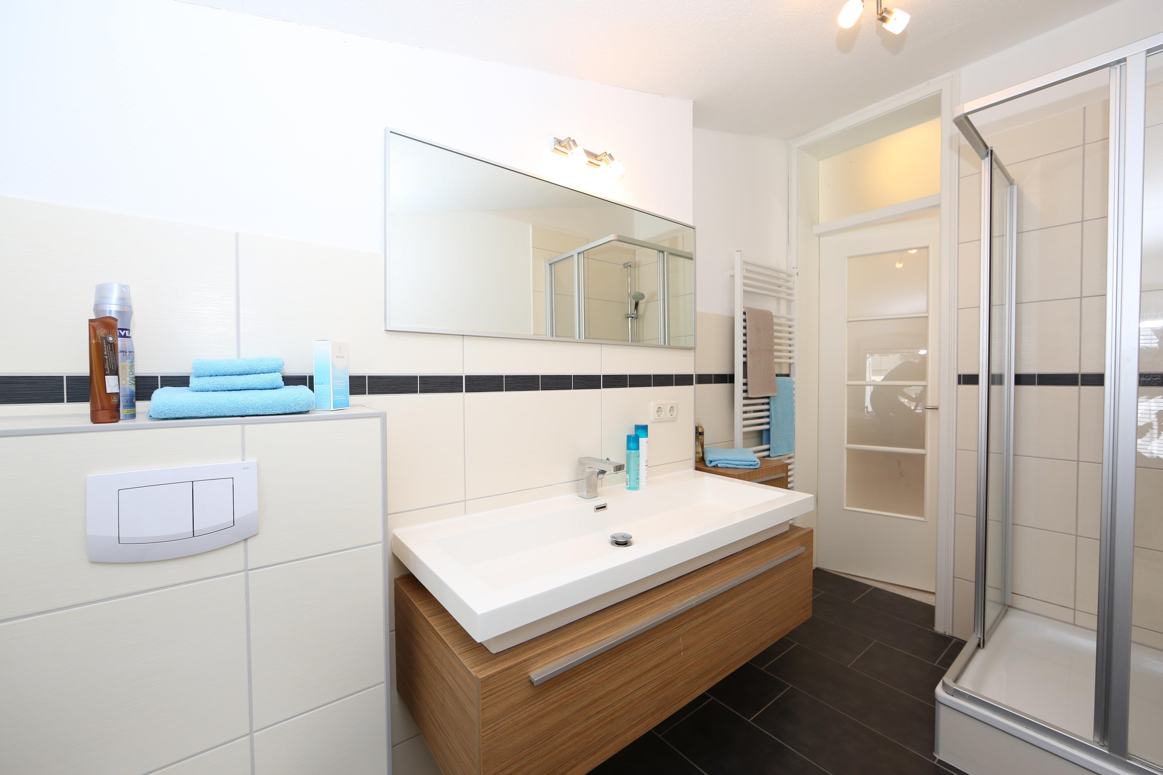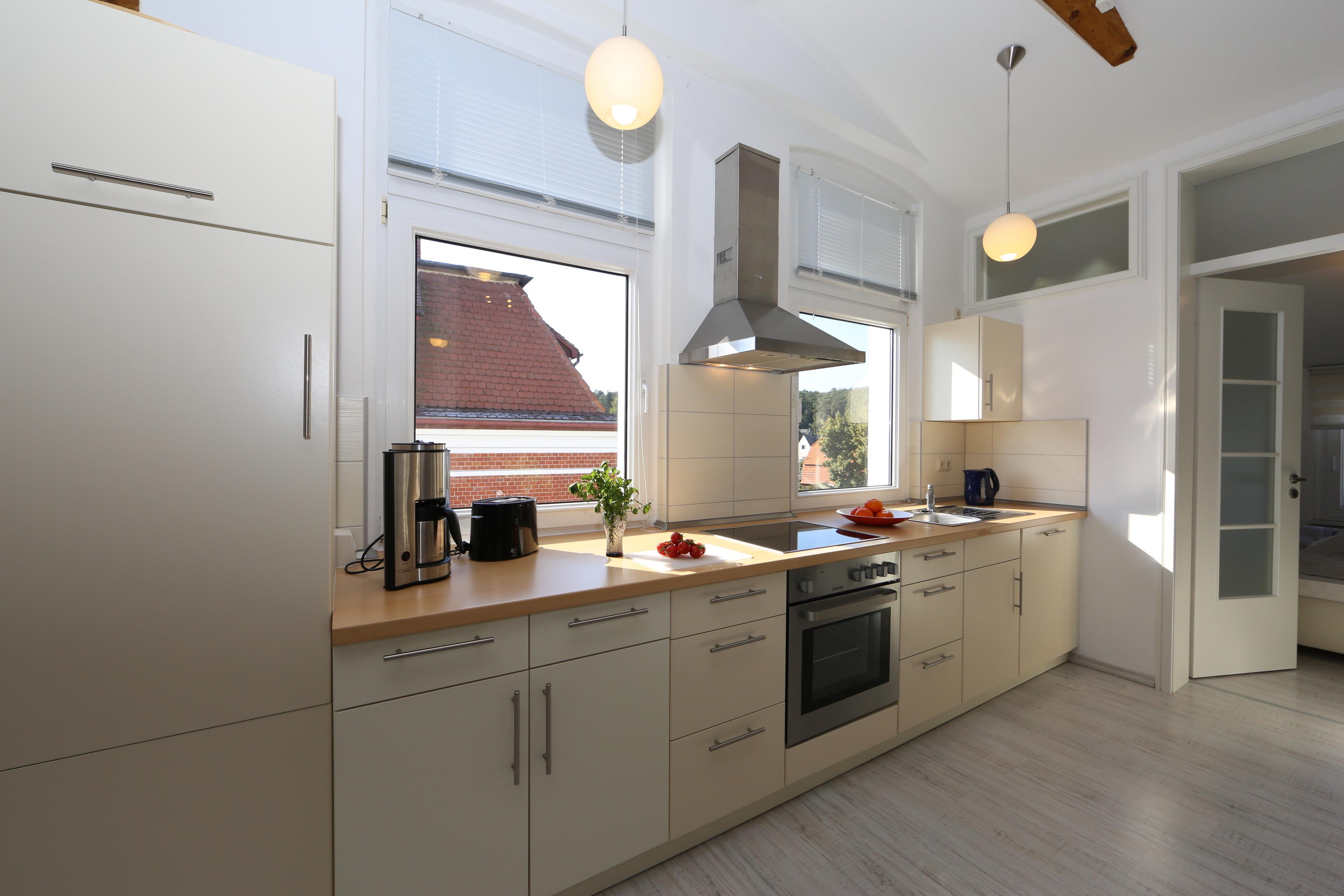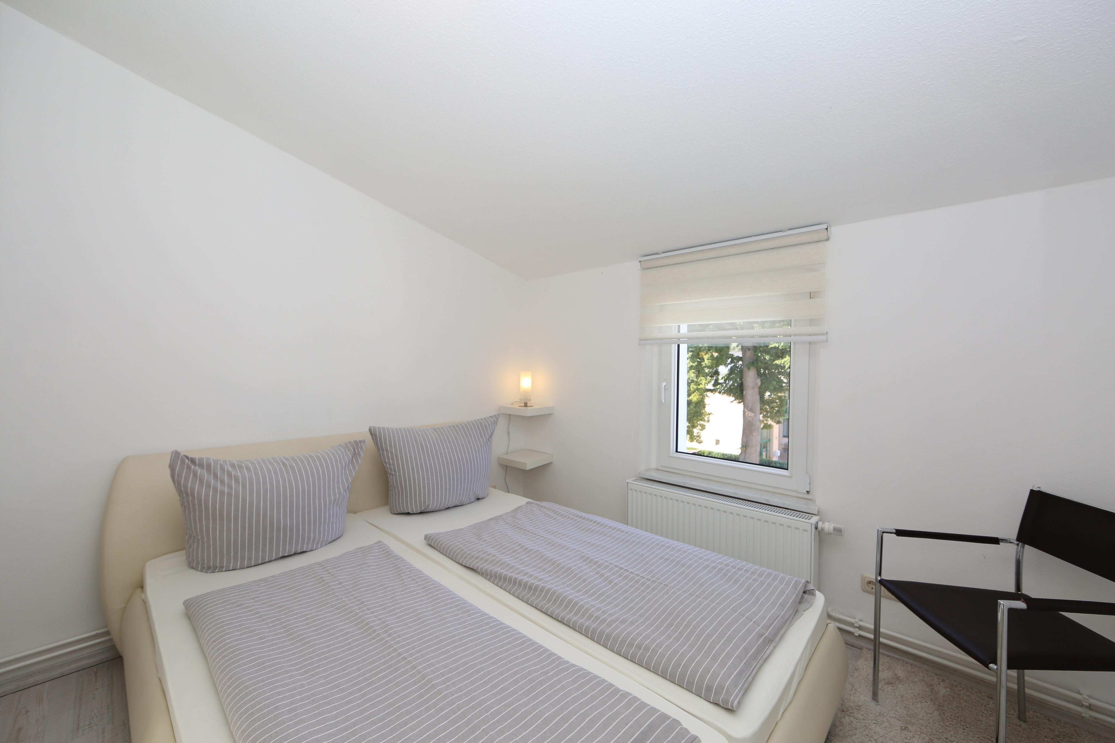 Im Dachgeschoss gelegen bietet diese 44 qm große 2-Zimmer Wohnung 2-3 Personen Platz für einen angenehmen Ferienaufenthalt. Der großzügige offene Wohnraum strahlt mit seinen dekorativen Dachbalken einen besonderen Charme aus. Hier finden Sie eine gemütliche Sitzecke mit Couch incl. Schlaffunktion (Liegefläche 150 x 200), einen Relaxsessel und einen großen Flat TV. Der Esstisch für 4 Personen sowie die moderne Einbauküche incl. Ceranfeld mit Backofen, Kühlschrank, Geschirrspüler pp. befinden sich ebenfalls im Wohnraum. Das Schlafzimmer ist mit einem Doppelbett mit getrennten Matratzen (90 x 200) und einem Kleiderschrank eingerichtet. Im Badezimmer steht den Gästen eine Echtglasdusche und Waschtisch/WC zur Verfügung. Ihren Pkw sowie Fahrräder können die Gäste auf dem Grundstück abstellen.