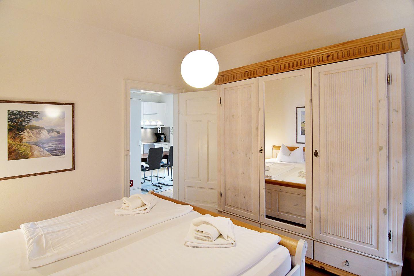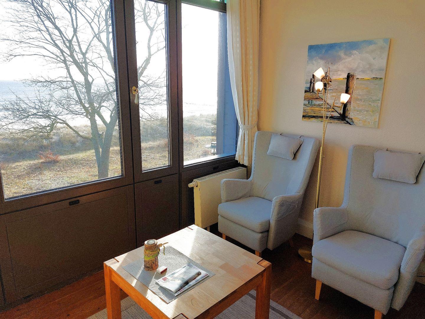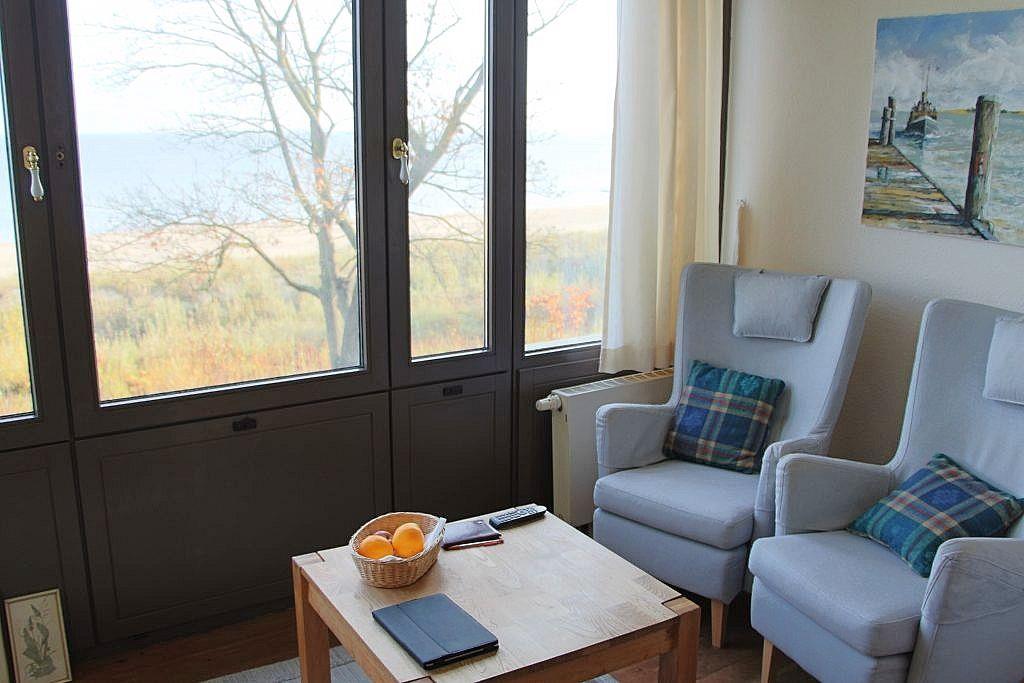 Bei Eintritt in diese sehr schöne Ferienwohnung wird der Blick durch den zentralen Wohnraum, mit moderner Küchenzeile und Essbereich, in die Loggia geleitet und von hier aus direkt in die Ostsee hinein. Es gibt ein Duschbad und einen Schlafzimmer mit Doppelbett. Weiterhin gibt es einen zusätzlichen Schlafraum mit komfortablen Schrankbett (für zwei Personen), der, wenn nicht als Schlafzimmer benötigt wird als weiteres Wohnzimmer dient. Kostenfreies WLan und ein PKW-Stellplatz (beschriftet mit der Nummer 4) stehen zur Verfügung. Haustiere sind auf Anfrage gestattet.