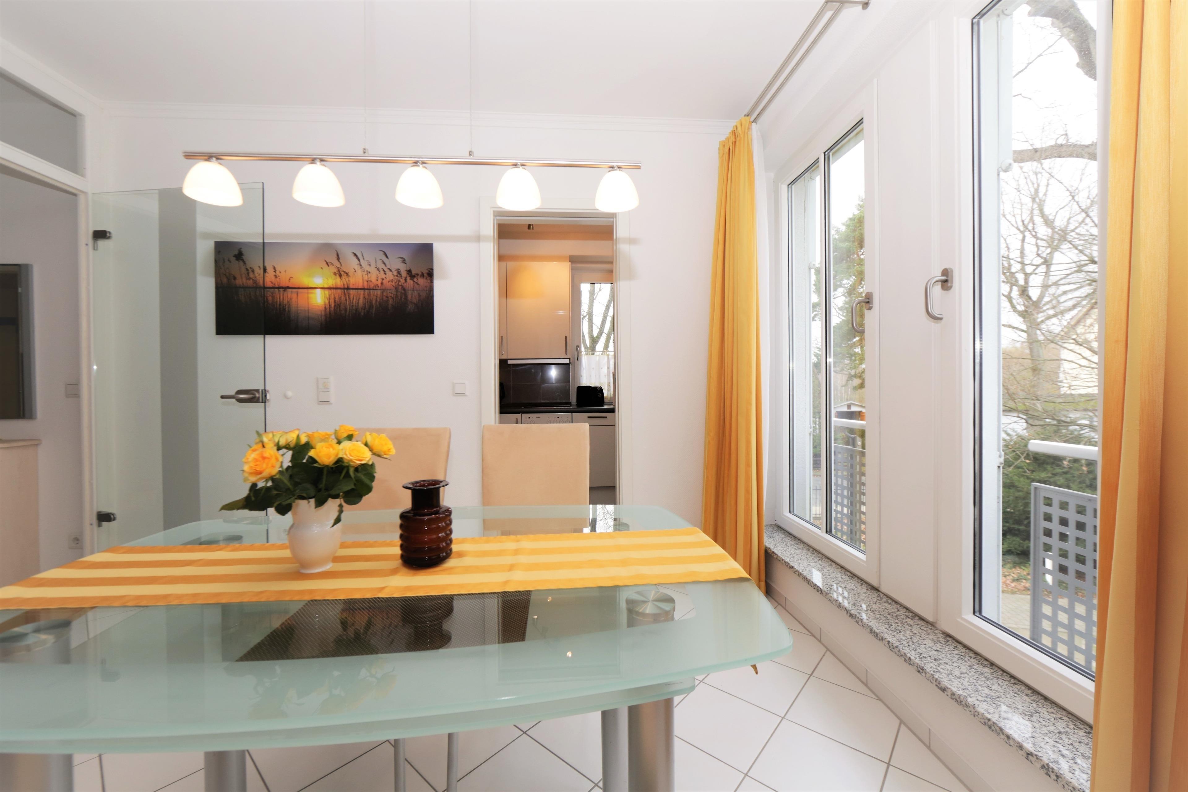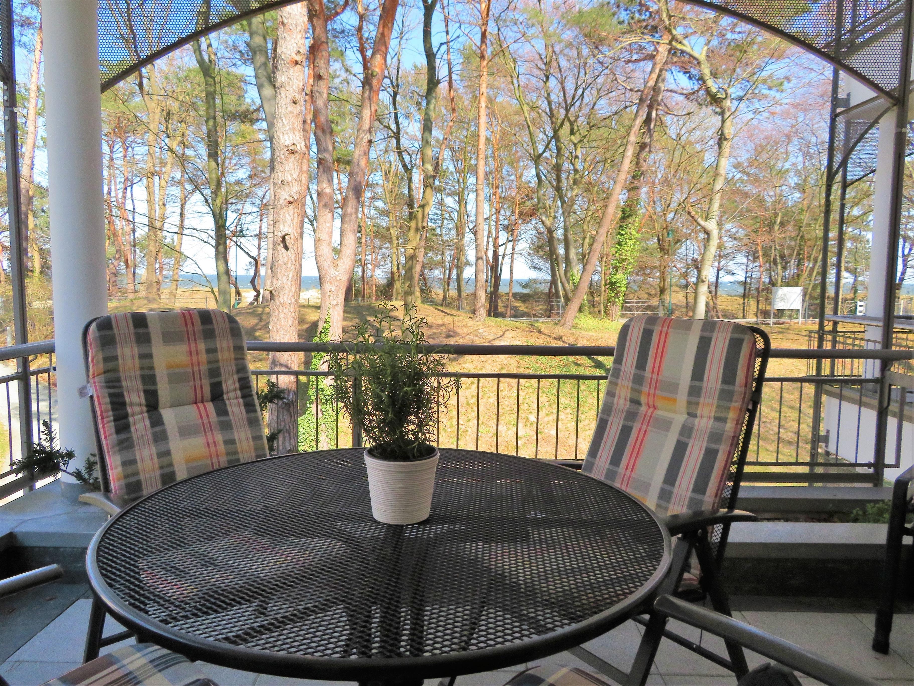Diese exklusive, helle Ferienwohnung mit einer Größe von 74 m² liegt im 2. Obergeschoss und erfreut ihre Gäste mit einem schönen Seeblick. Individuell und freundlich eingerichtet verfügt die Wohnung über einen großen Wohnraum mit gemütlicher, großzügiger Sitzecke mit Relaxsessel und Flat-TV. Der 10m² große überdachte Balkon mit Blick auf die Promenade, Düne und Ostsee ist ein herrlicher Platz zum Entspannen. Ein großer Esstisch trennt den Wohnbereich optisch von der Küche und bietet 4 Personen ausreichend Platz. Die angrenzende separate Küche mit Cerankochfeld, Backofen, Mikrowelle, Geschirrspüler etc. trennt keine Tür vom Wohn- und Essbereich. Das Schlafzimmer ist mit einem Doppelbett mit getrennten Matratzen (180 x 200) und einem großen Kleiderschrank eingerichtet und bietet zusätzlich einen Flat TV. Das Bad en Suite ist mit einer Badewanne, das vom Flur begehbare zweite Bad mit einer Dusche und jeweils Waschtisch /WC ausgestattet. Für zwei weitere Personen steht im hinteren Wohnbereich ein Schrankbett mit getrennten Matratzen (160 x 200) zur Verfügung.